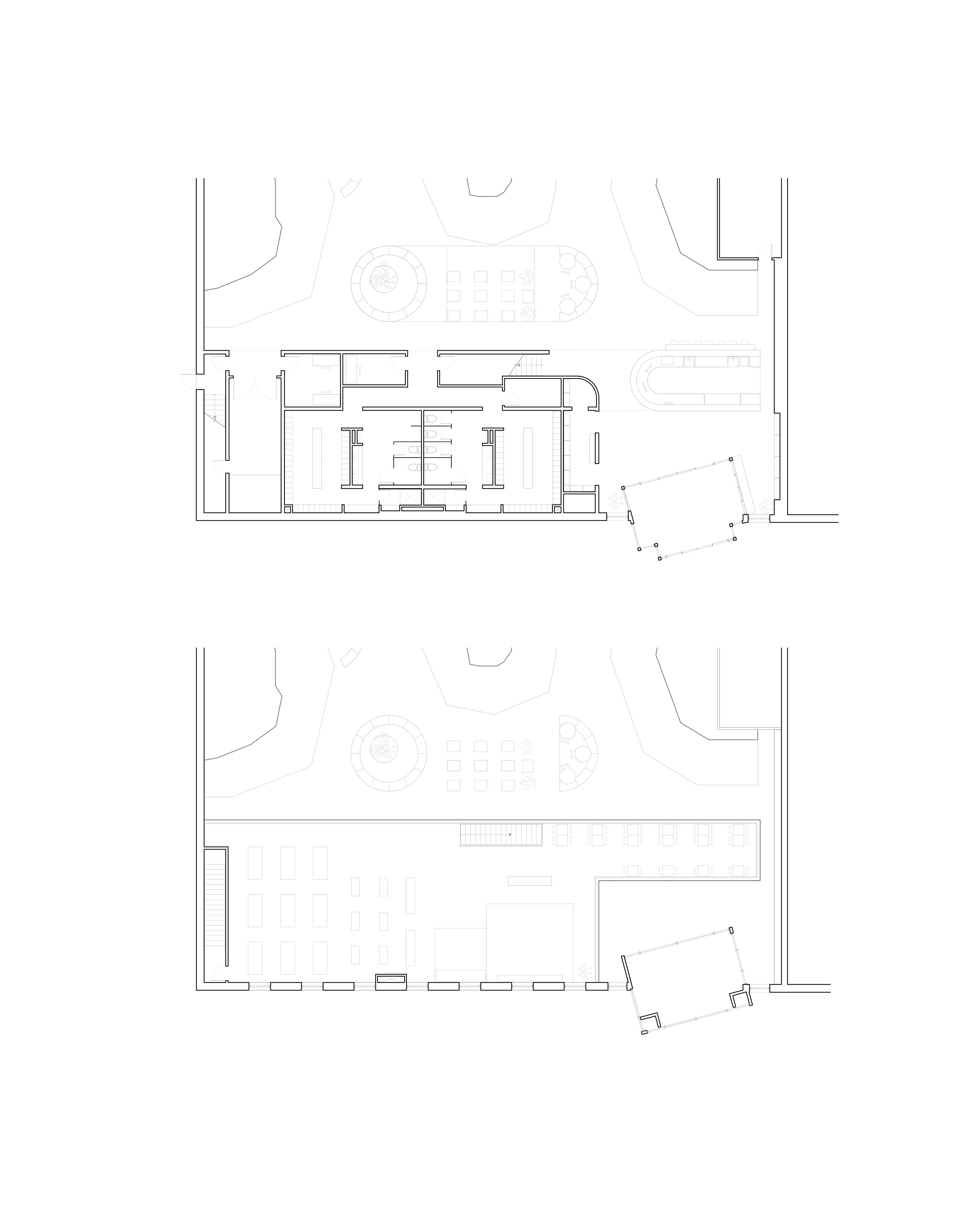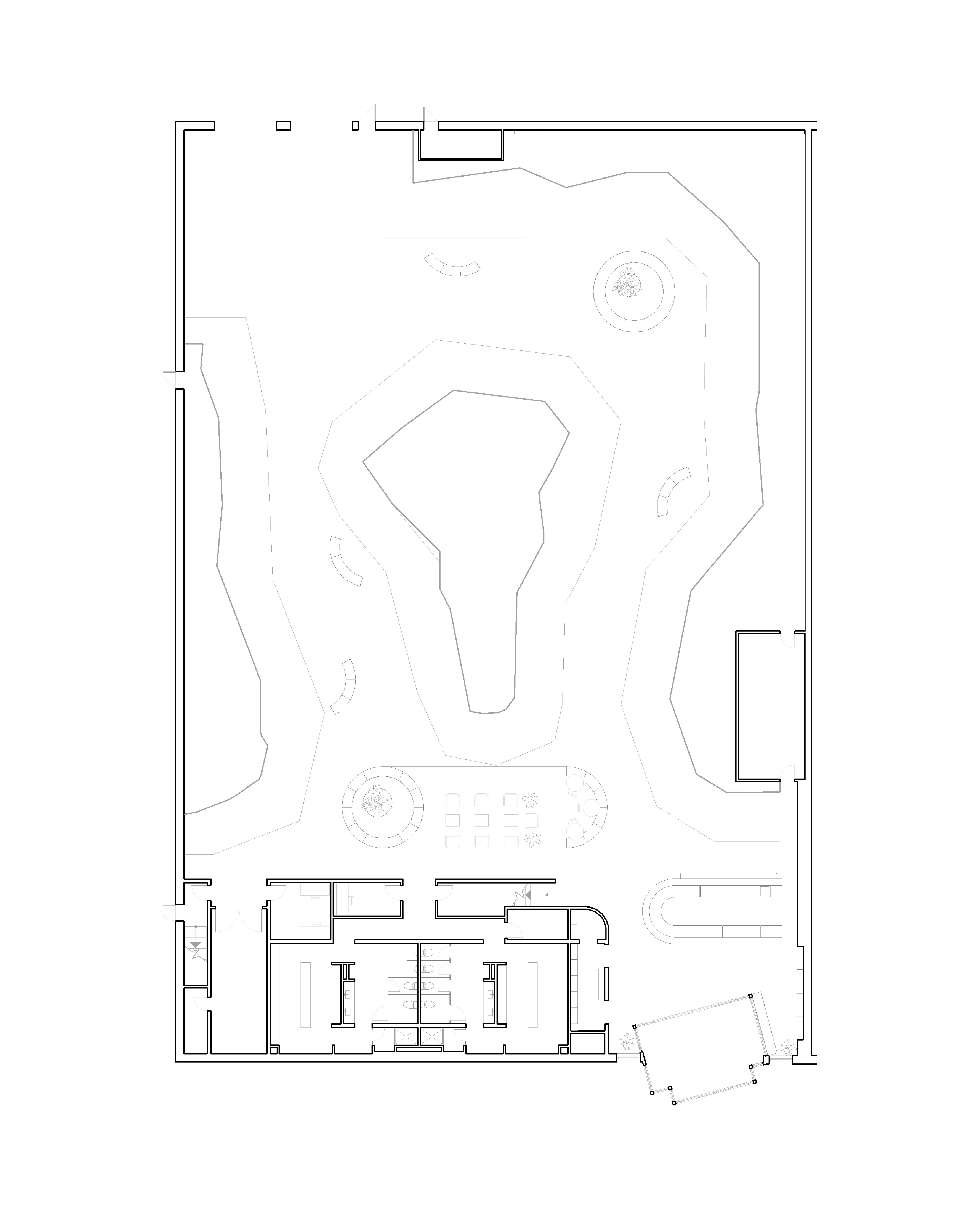 Dans l'aire d'activités principale, des espaces propices aux petits rassemblements ponctuent l’espace et sont caractérisés par des formes organiques et fluides qui dialoguent avec les parois angulaires.