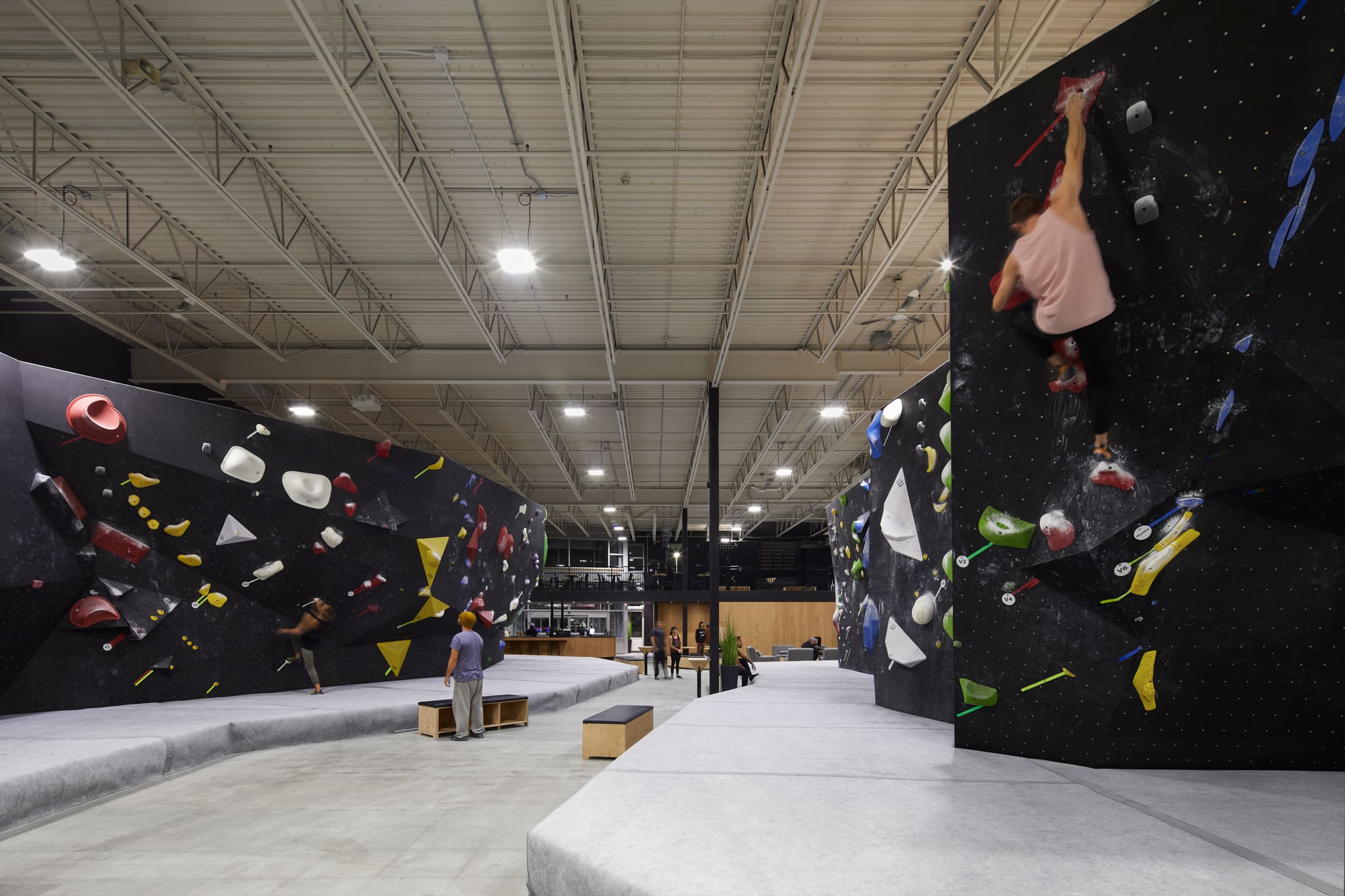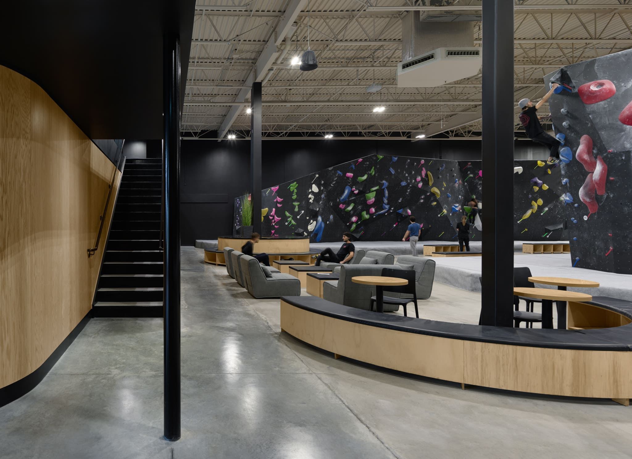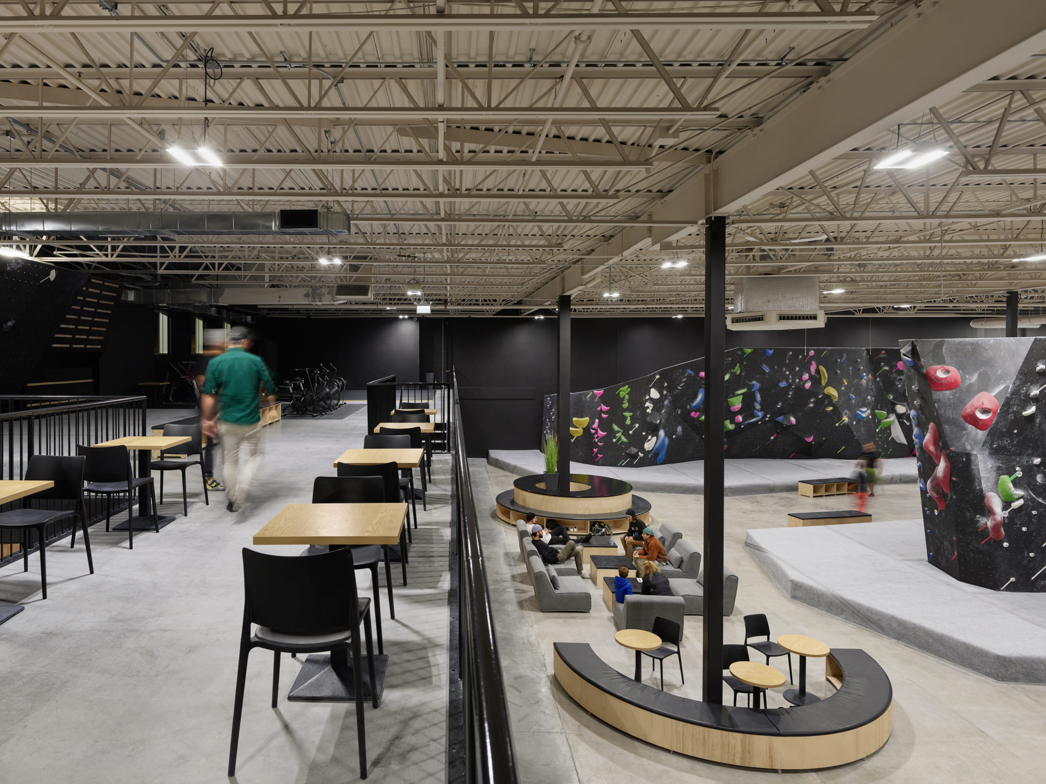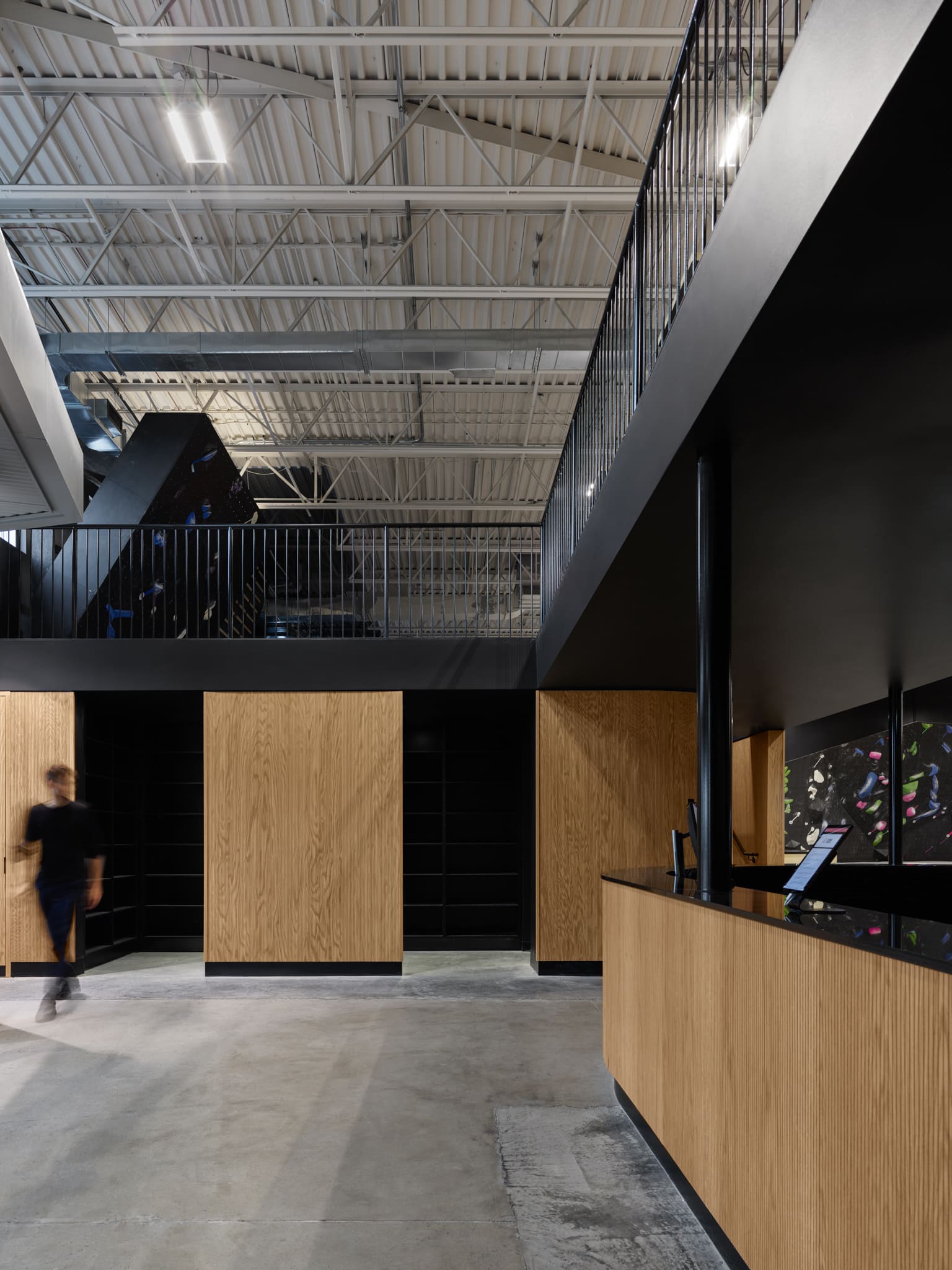 La disposition de la mezzanine introduit une échelle intime et crée une transition douce vers les installations d’escalade. Cette plateforme surélevée devient un espace libre qui peut être adapté en fonction des besoins.