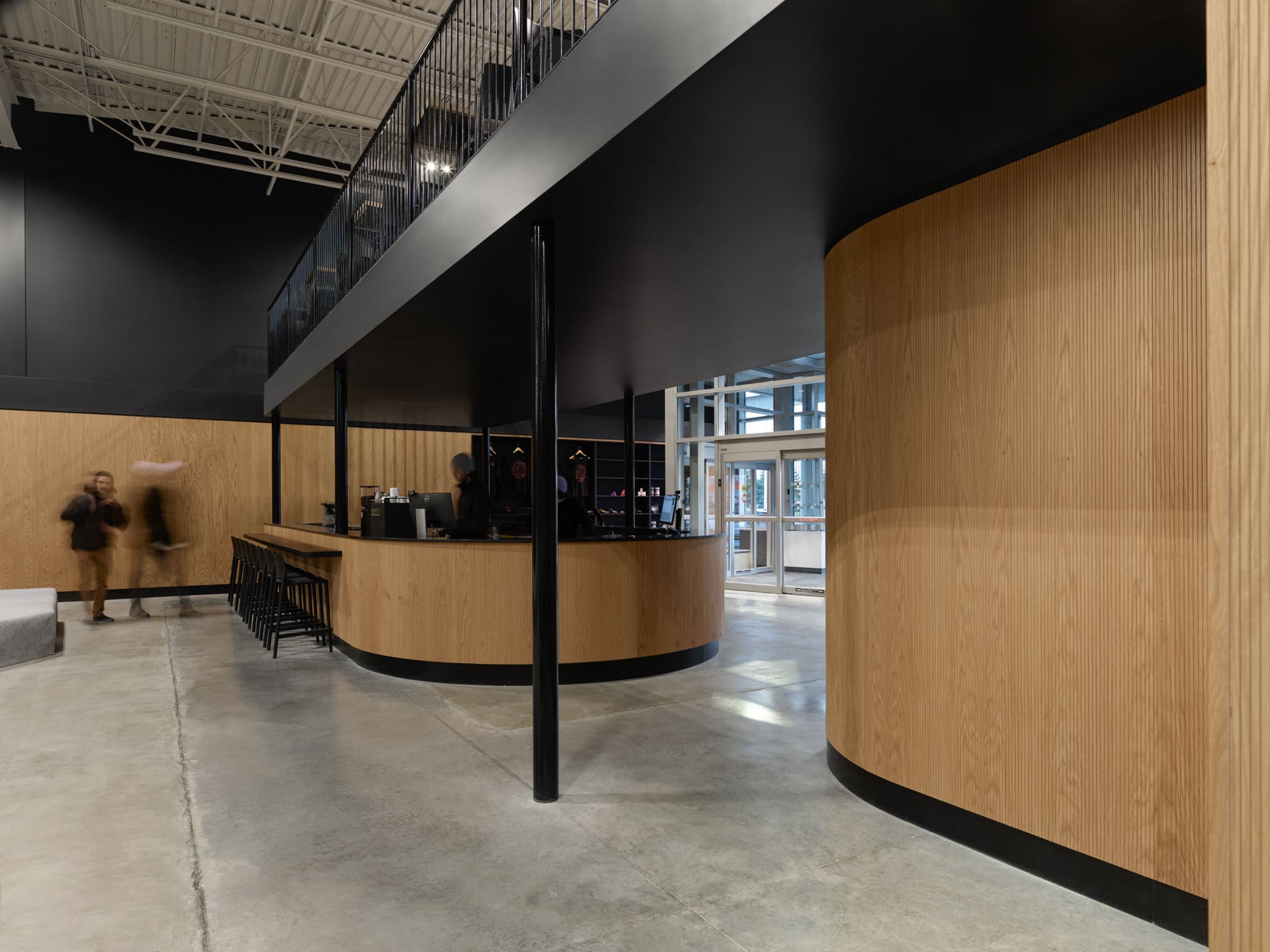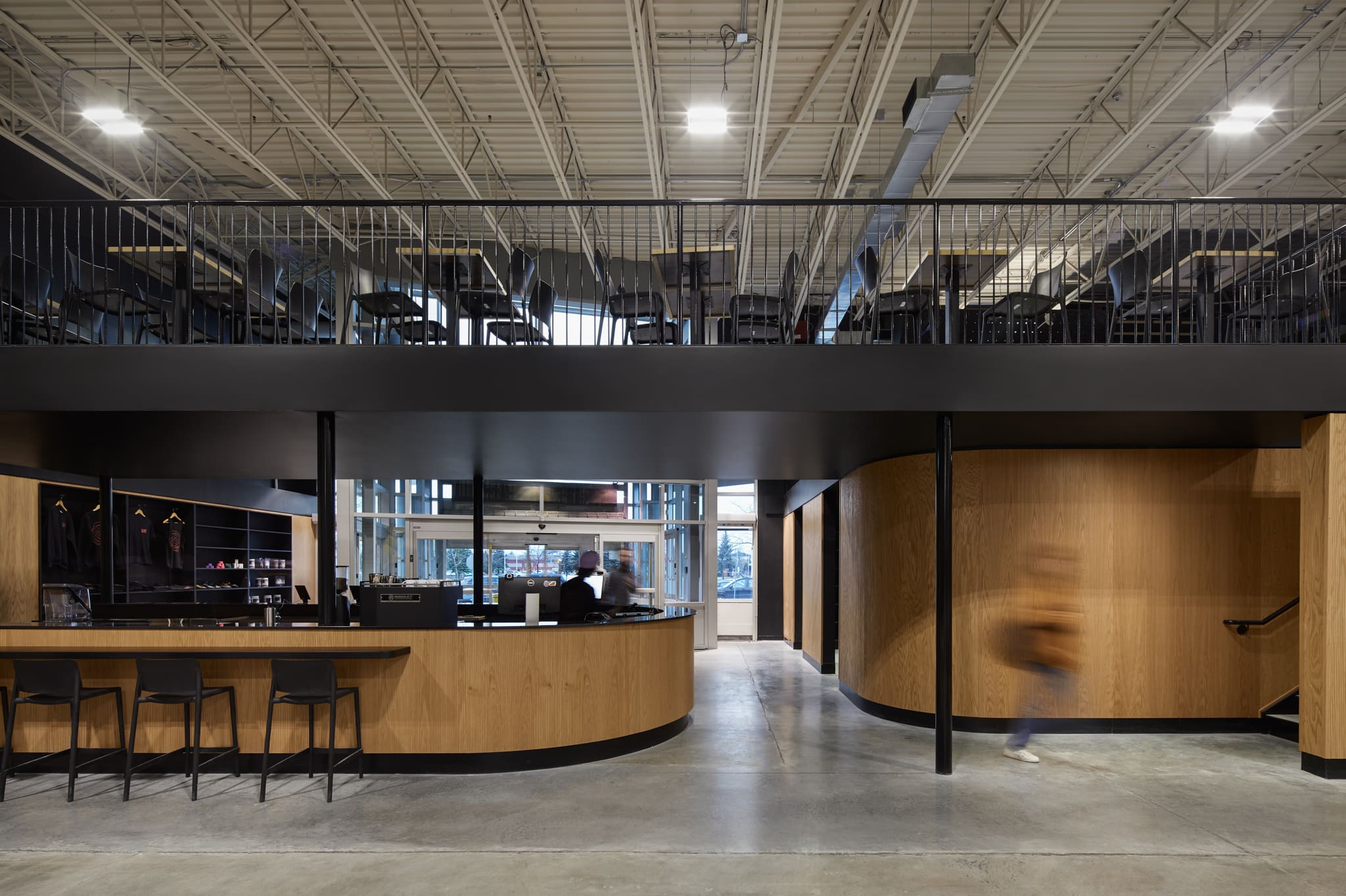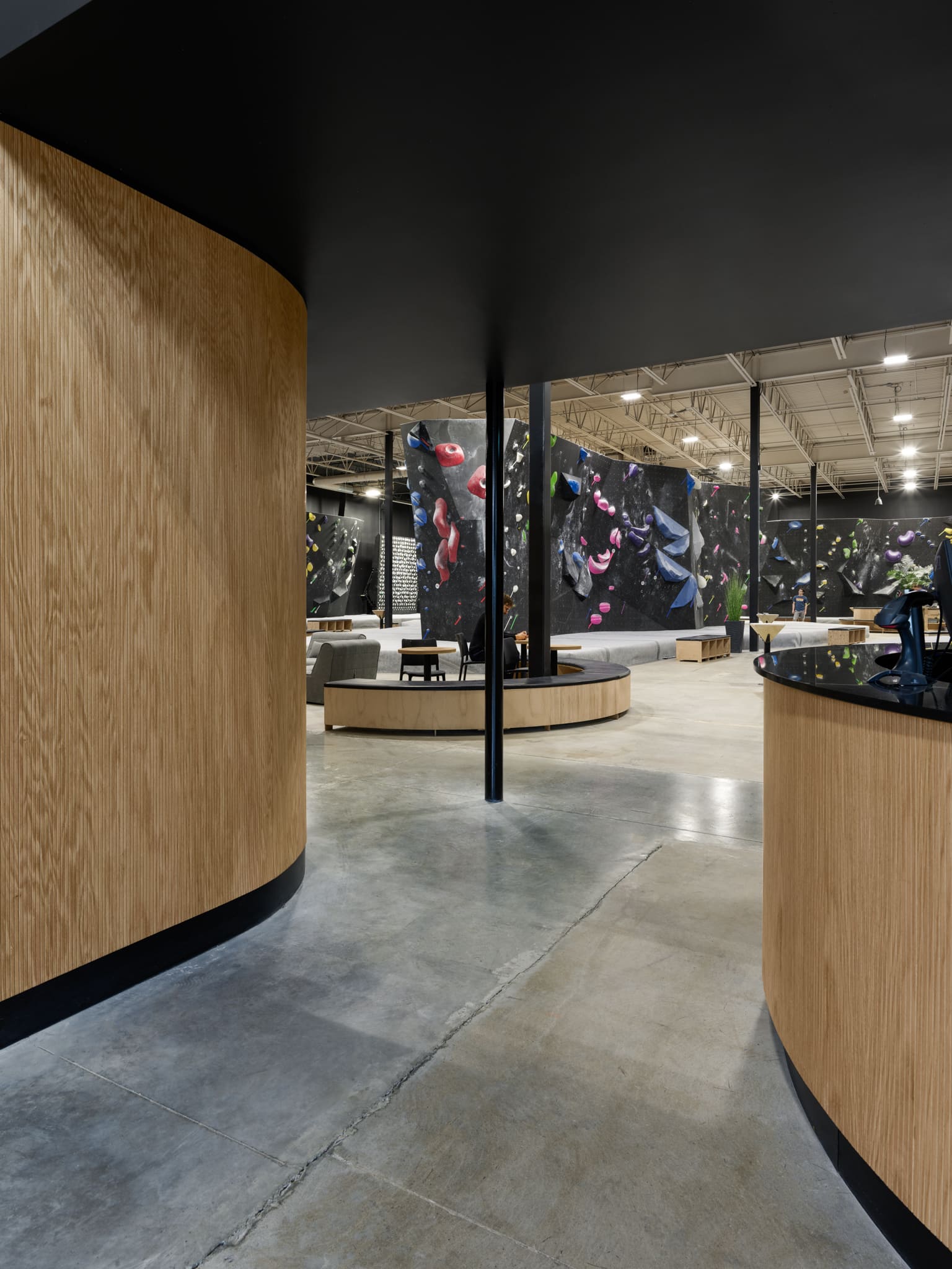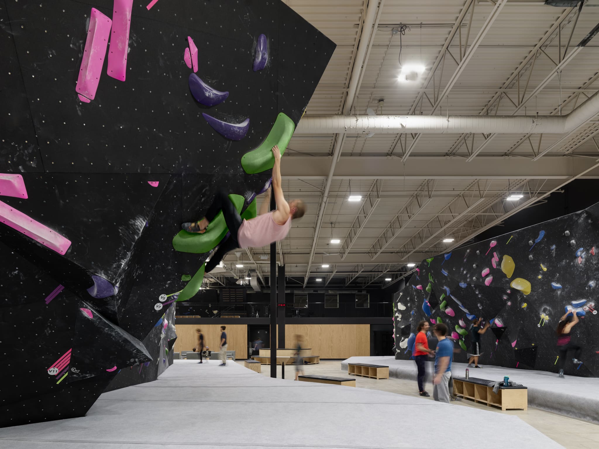 La disposition de la mezzanine introduit une échelle intime et crée une transition douce vers les installations d’escalade. Cette plateforme surélevée devient un espace libre qui peut être adapté en fonction des besoins.