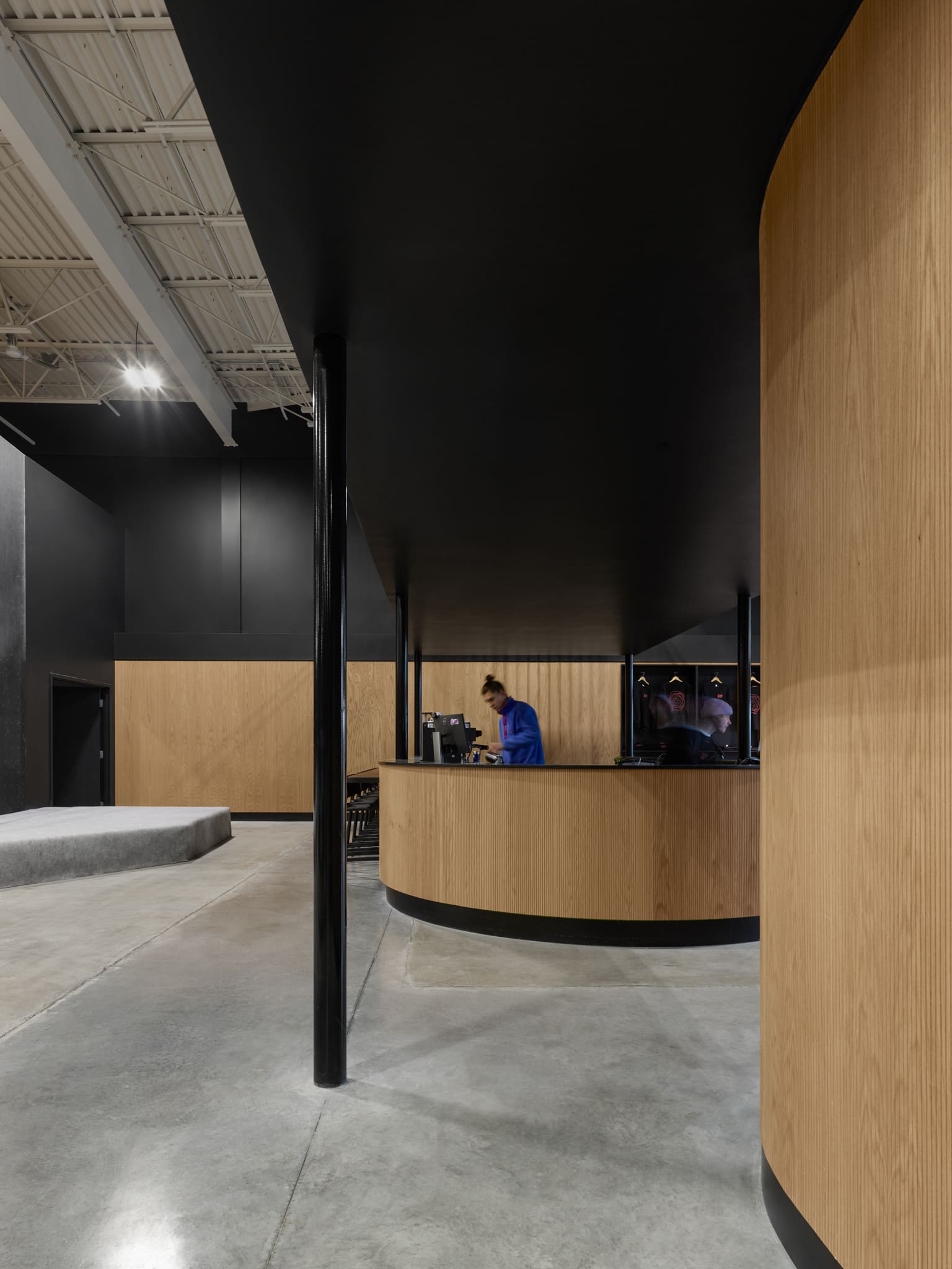 Le caractère singulier du centre se découvre dès l’entrée, où l’ espace d’accueil se jumelle à un espace café. Les surfaces foncées, les parois courbes et la disposition de places assises en font un premier lieu d’arrêt chaleureux. L’utilisation généreuse de bois suggère une ambiance domestique et familière.