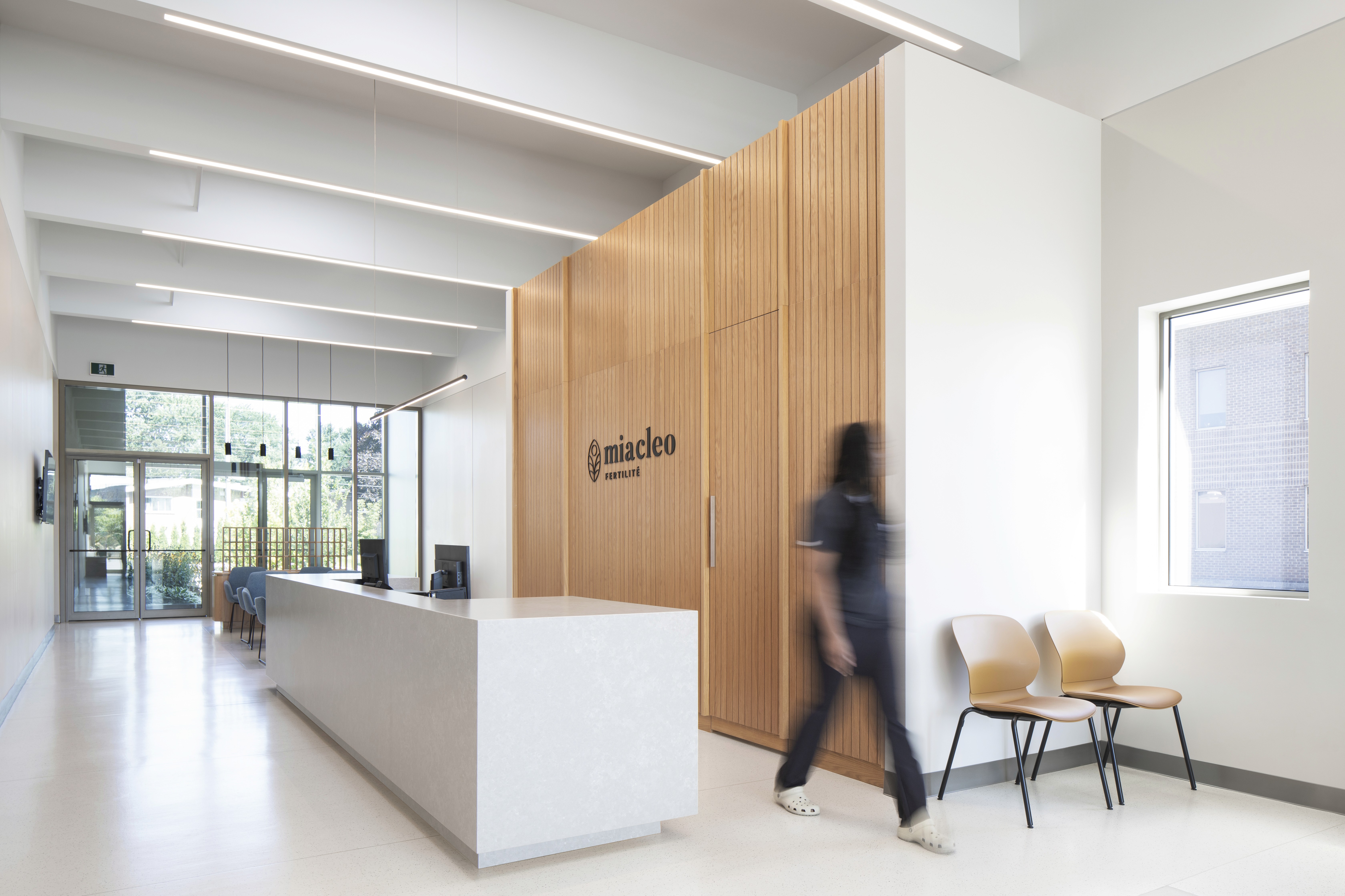 Le projet Miacleo transforme un bâtiment existant aux qualités spatiales limitées en une clinique de fertilité d’excellence sur la Rive-Sud, alliant technologie et bien-être.