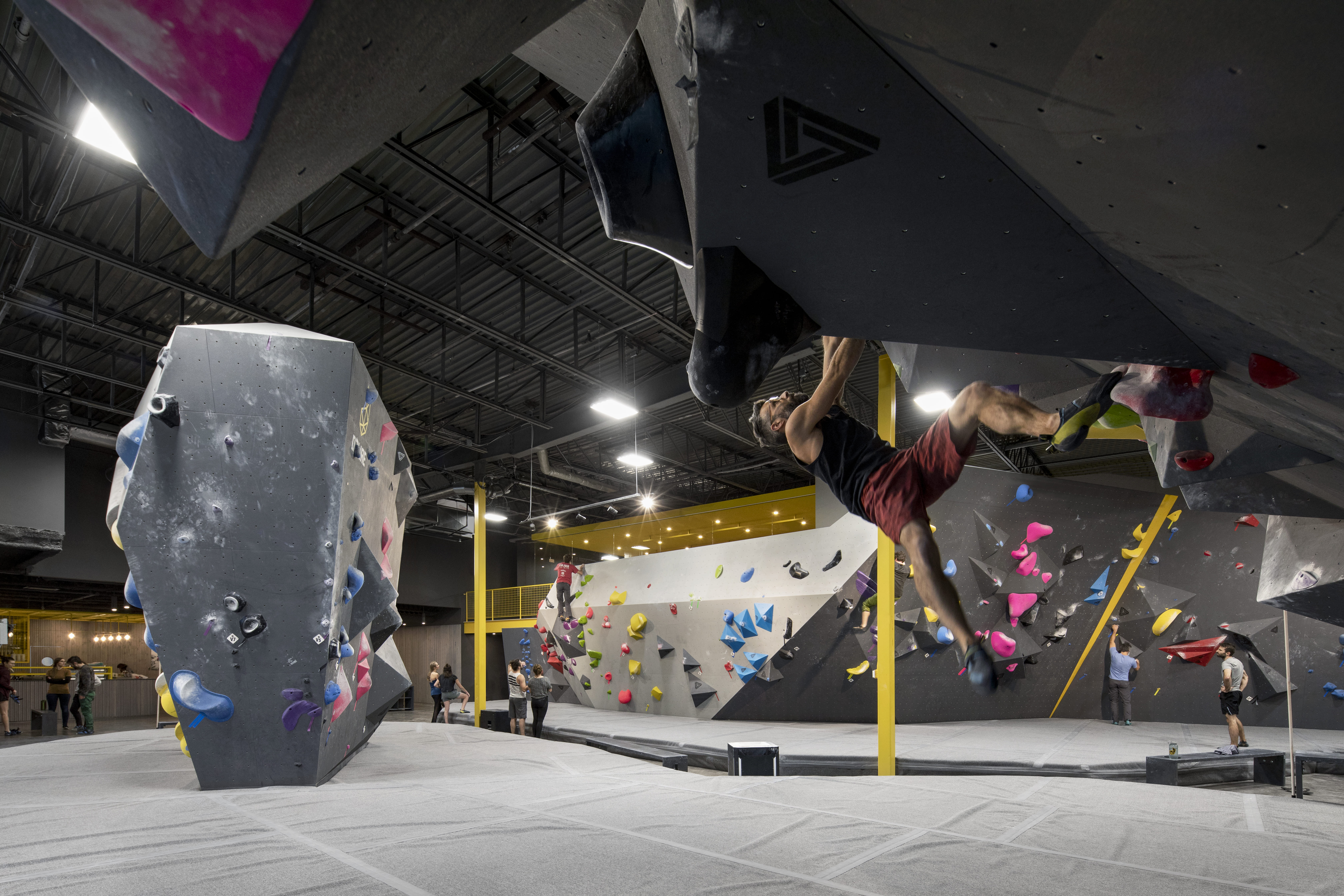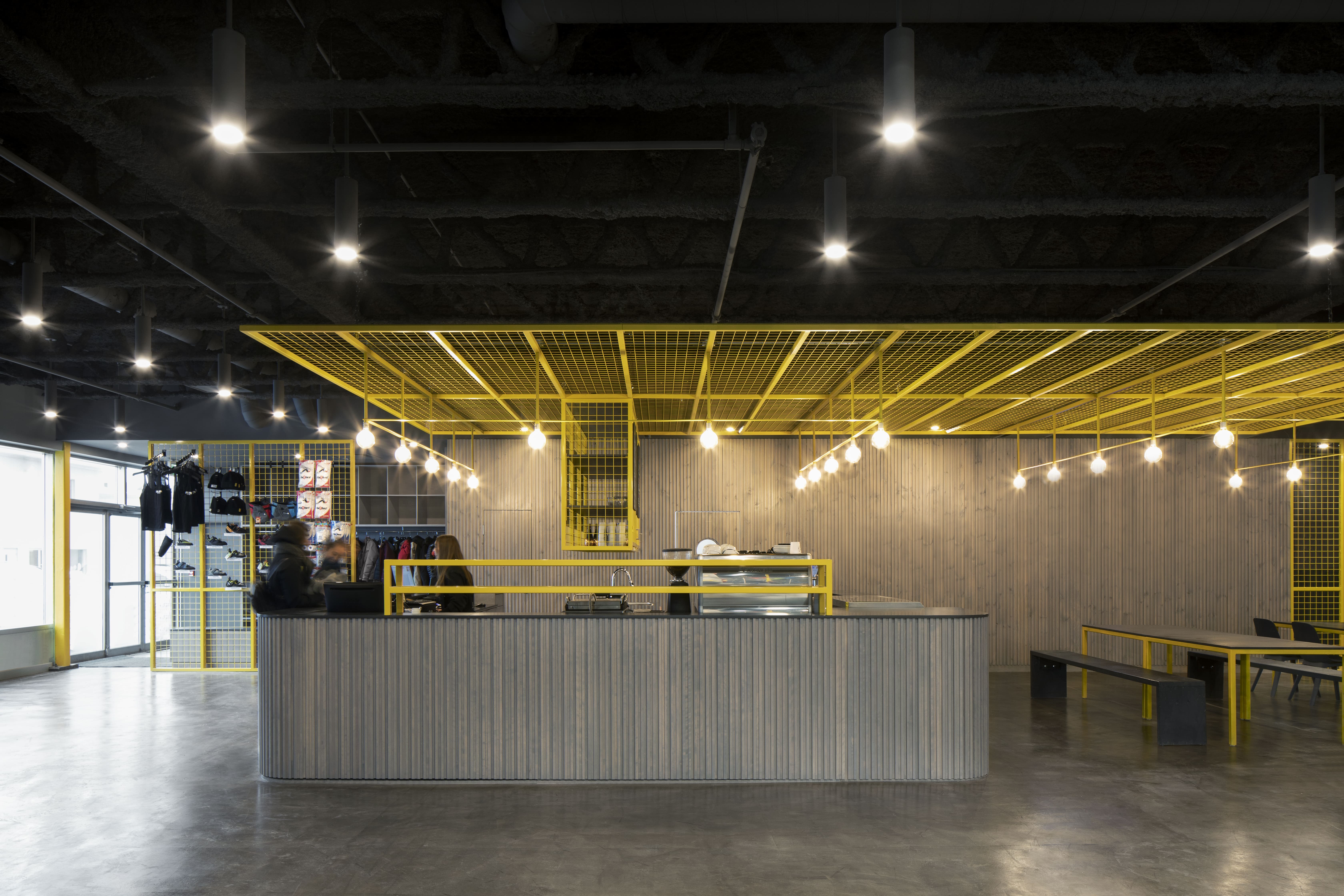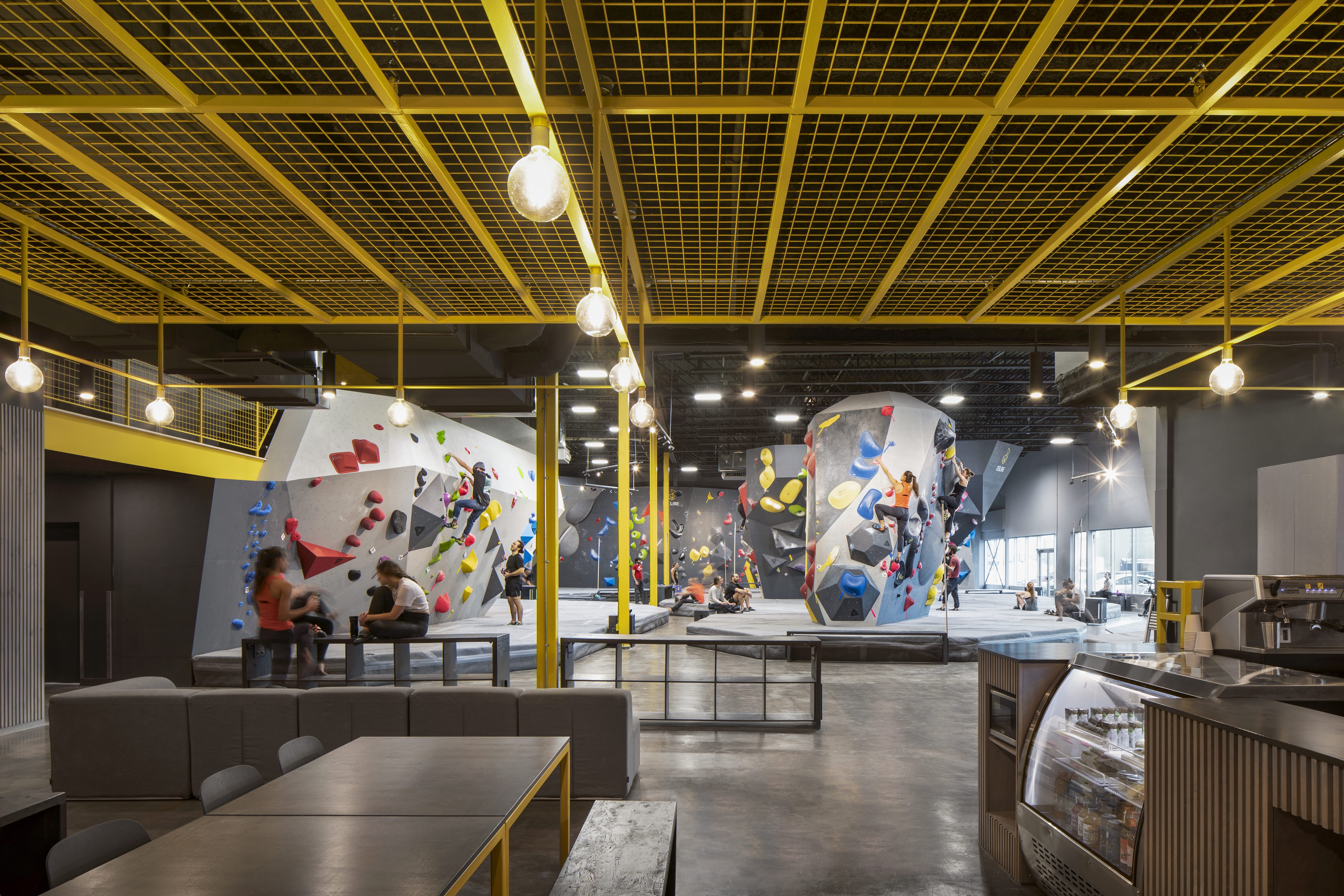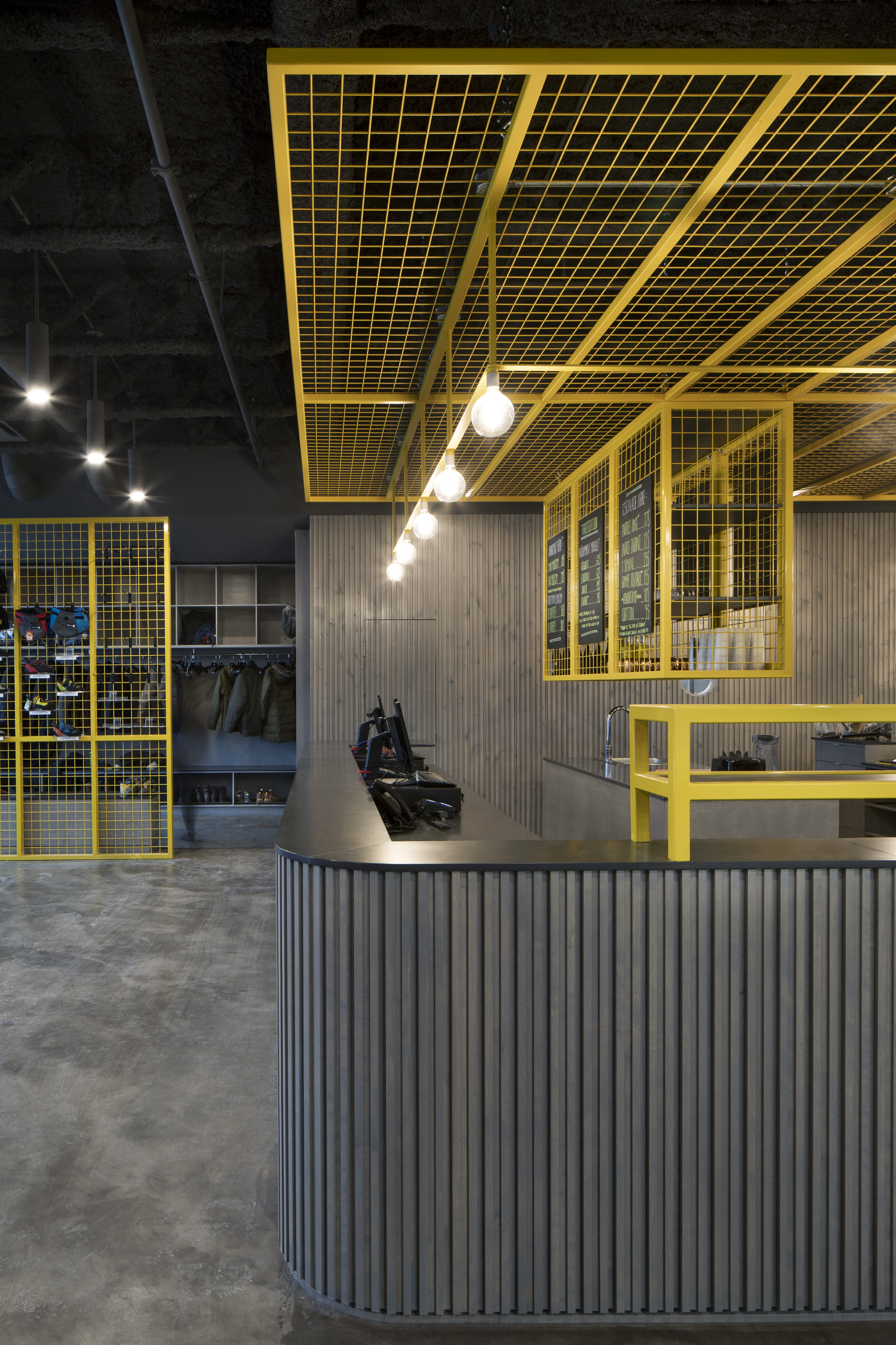 Déclinés en deux tons principaux, les matériaux mis en œuvre contribuent à la lisibilité des espaces. Un parement en bardeaux de bois habille les murs encadrant la zone d’accueil, ainsi que le mobilier d’accueil lui-même. Sa teinte grisée se retrouve sur l’ensemble des murs de grimpe et des sols. Une série d’ouvrages en acier intègrent aussi bien la structure de l’édifice que les supports destinés aux articles en vente ou au menu du jour. Le jaune vif qui les colore illumine l’espace par petites touches, du plafond de la mezzanine aux prises d’escalade.