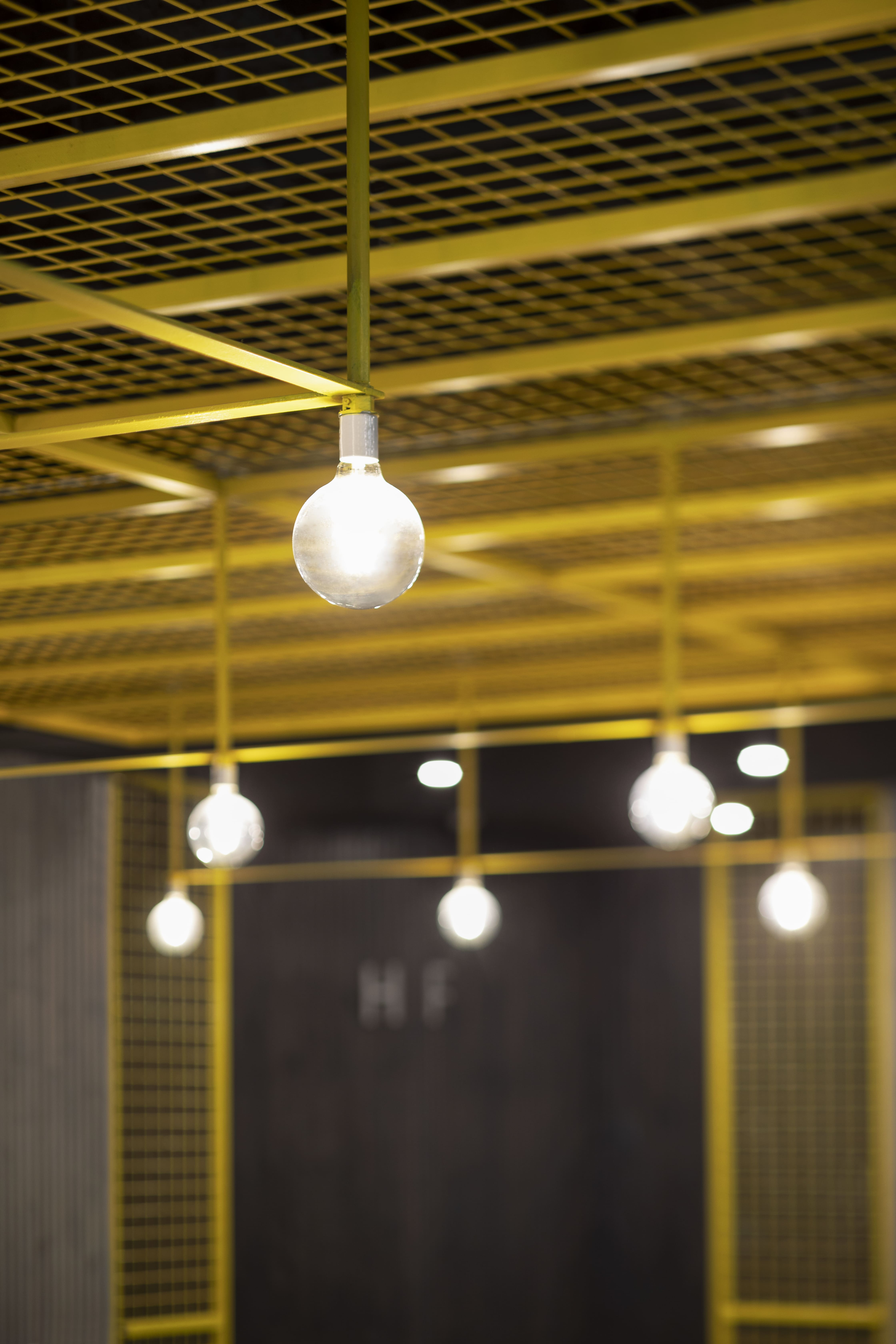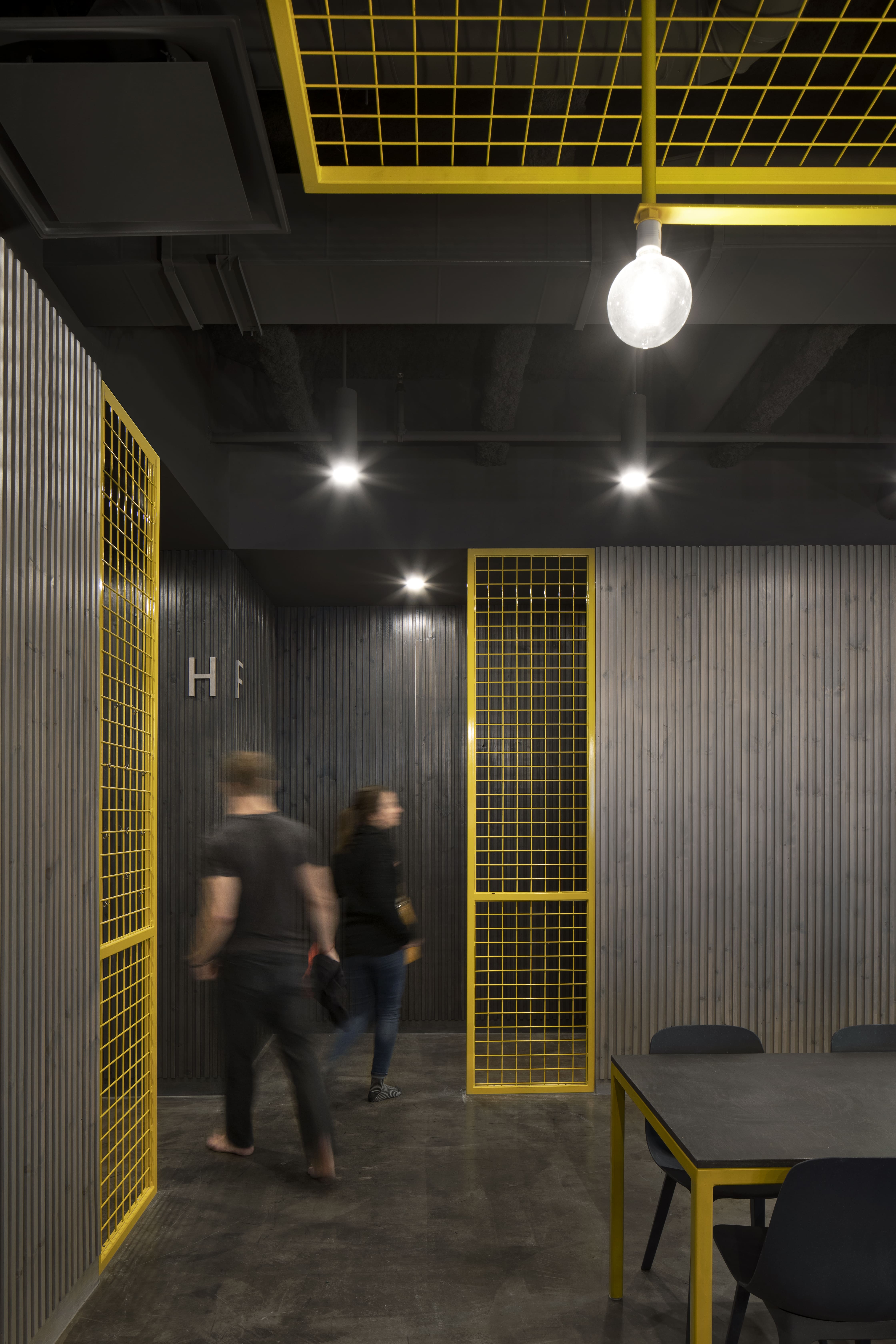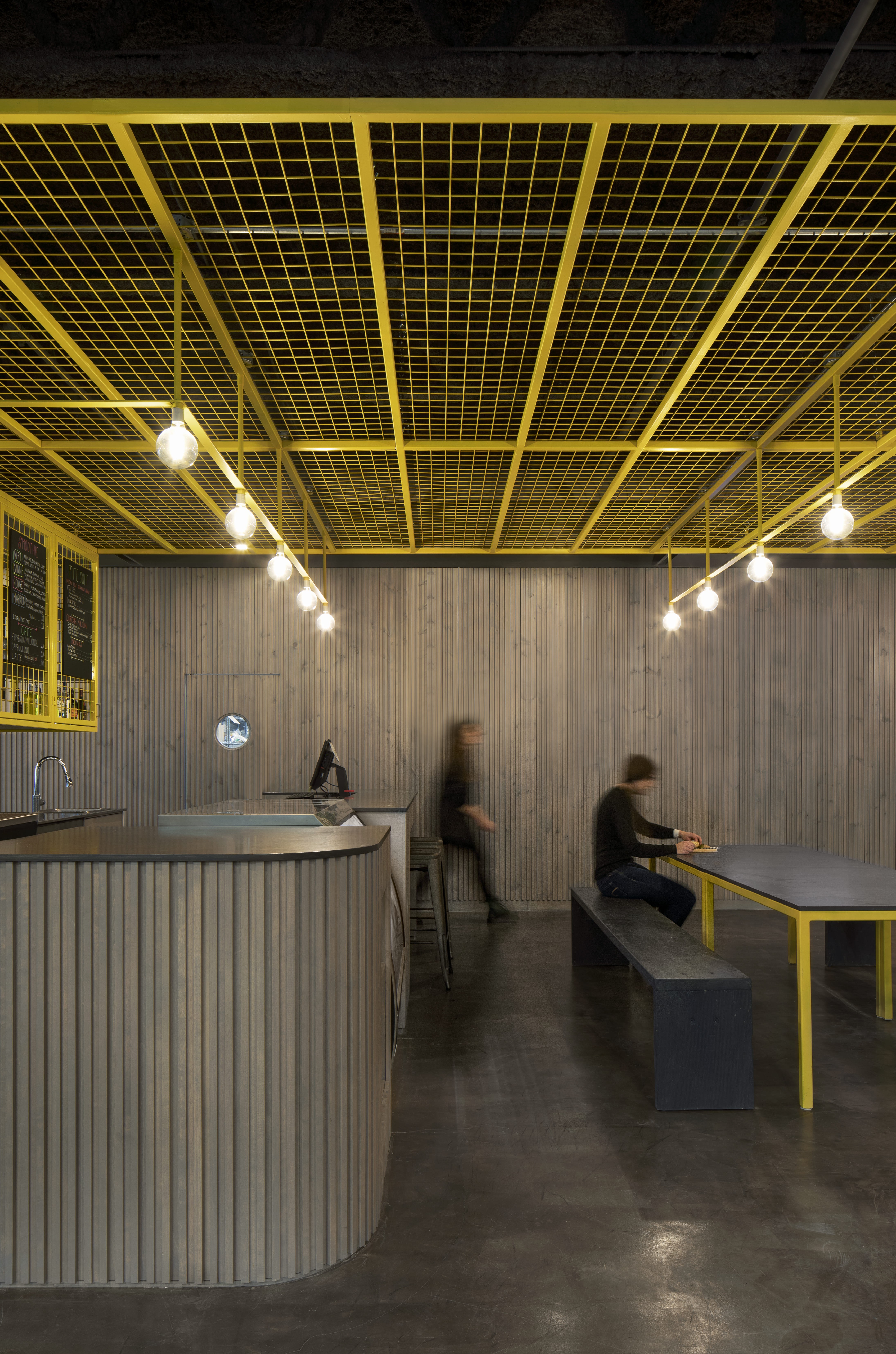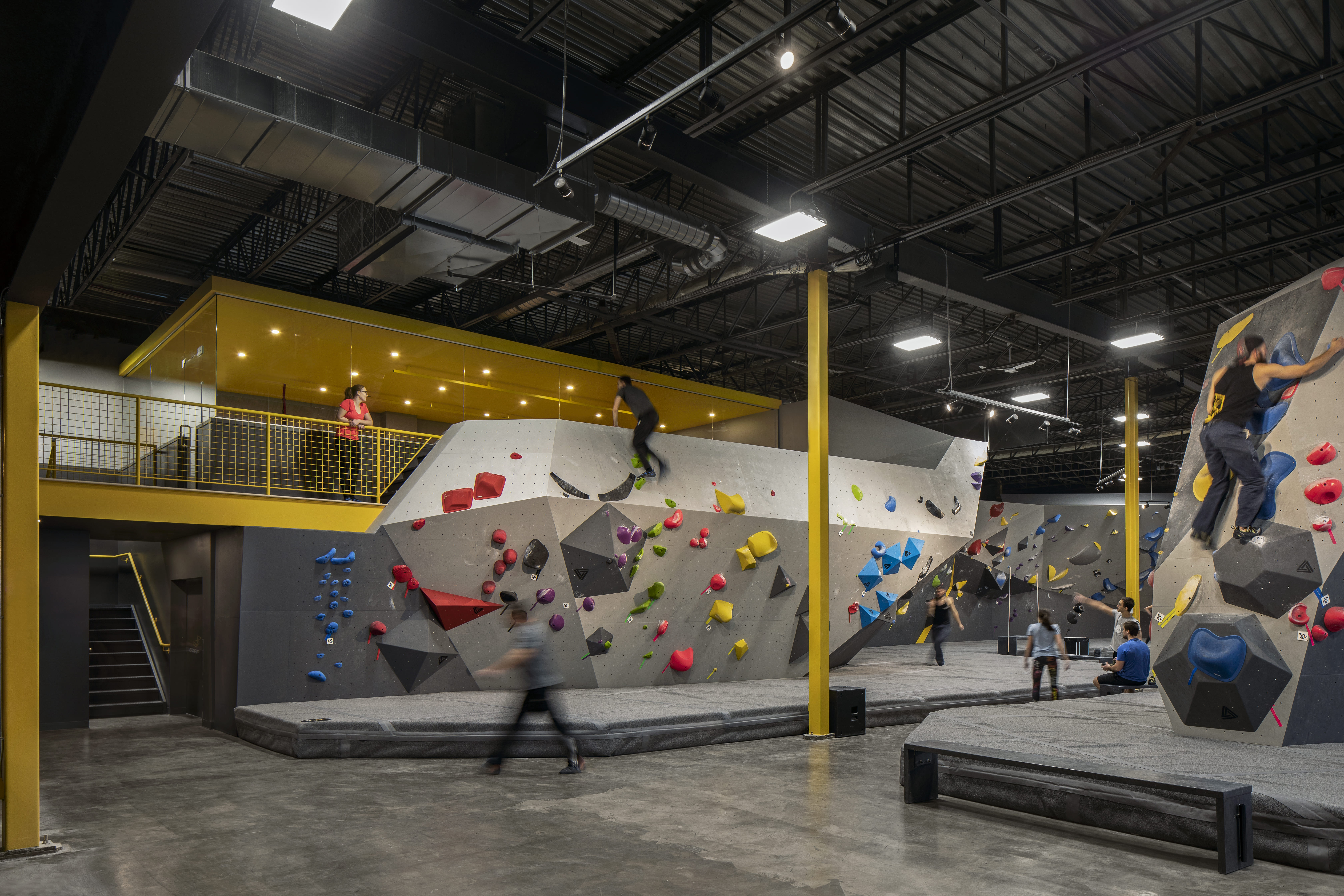 Déclinés en deux tons principaux, les matériaux mis en œuvre contribuent à la lisibilité des espaces. Un parement en bardeaux de bois habille les murs encadrant la zone d’accueil, ainsi que le mobilier d’accueil lui-même. Sa teinte grisée se retrouve sur l’ensemble des murs de grimpe et des sols. Une série d’ouvrages en acier intègrent aussi bien la structure de l’édifice que les supports destinés aux articles en vente ou au menu du jour. Le jaune vif qui les colore illumine l’espace par petites touches, du plafond de la mezzanine aux prises d’escalade.