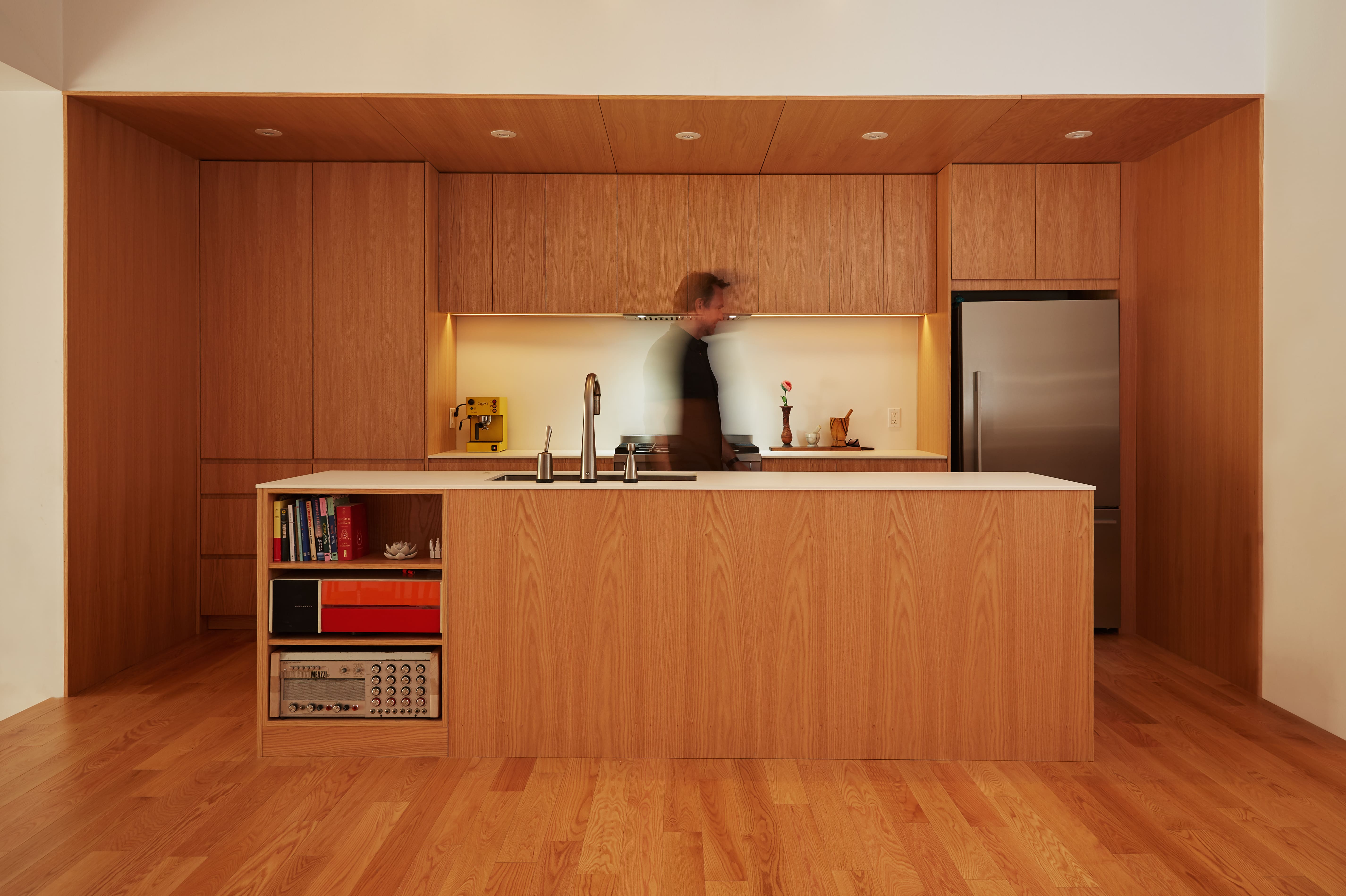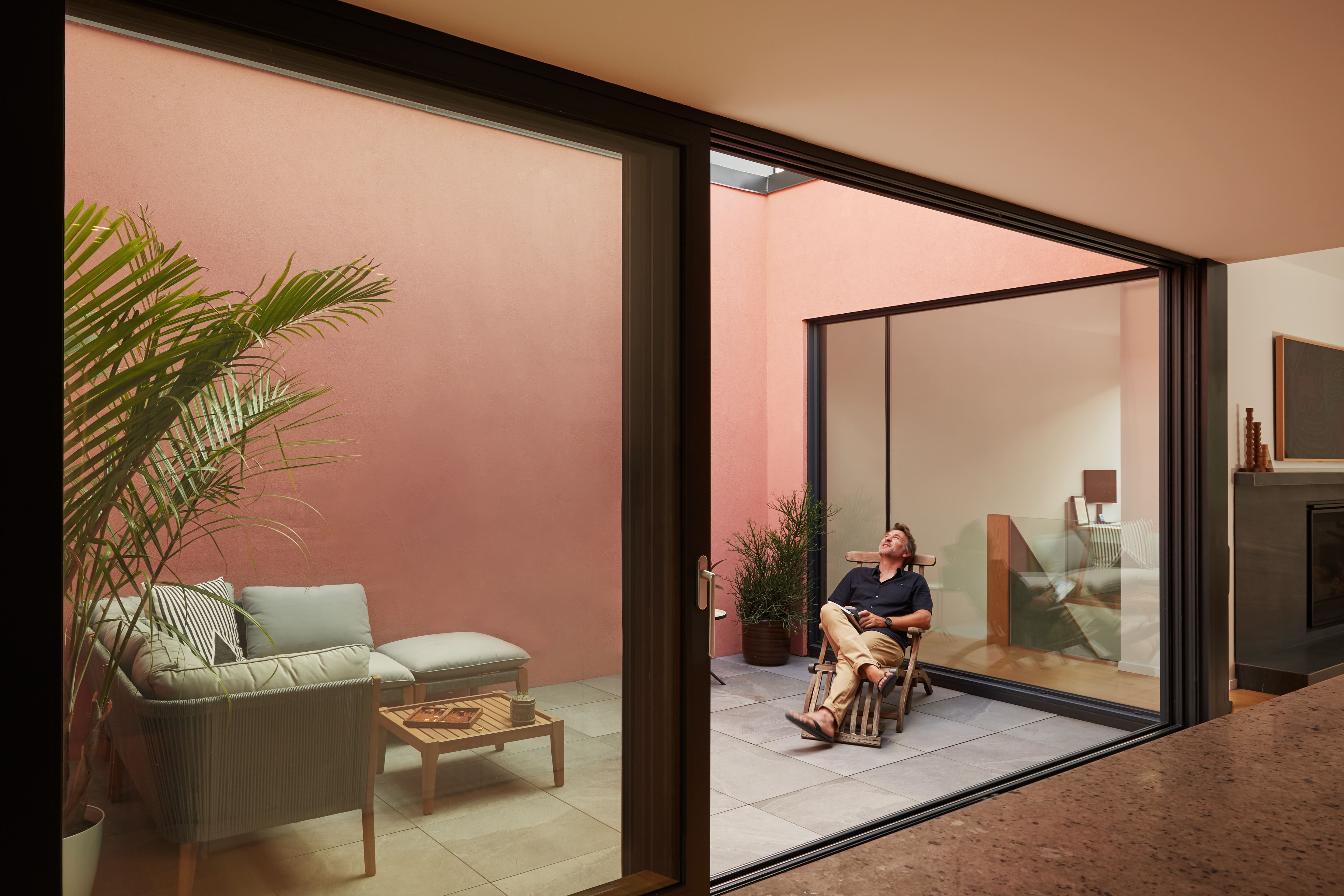Aussi, le projet est conçu en relation à deux espaces majeurs : une cour arrière, associée au logement inférieur, et un patio central, associé au logement supérieur. L’organisation des pièces est pensée de façon à maximiser les liens physiques et visuels à ces deux espaces, sans compromettre l’intimité de chacun des cocons familiaux.