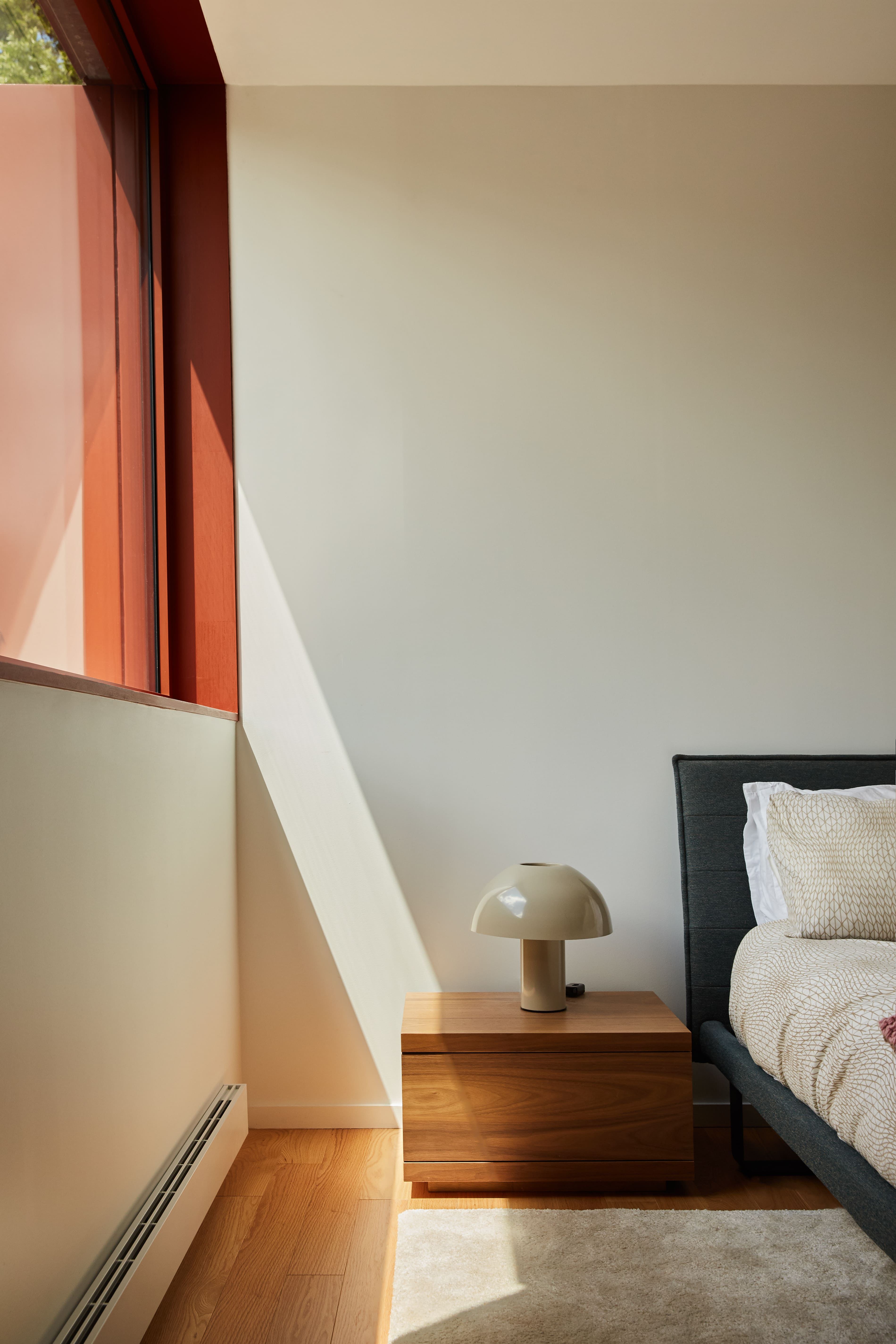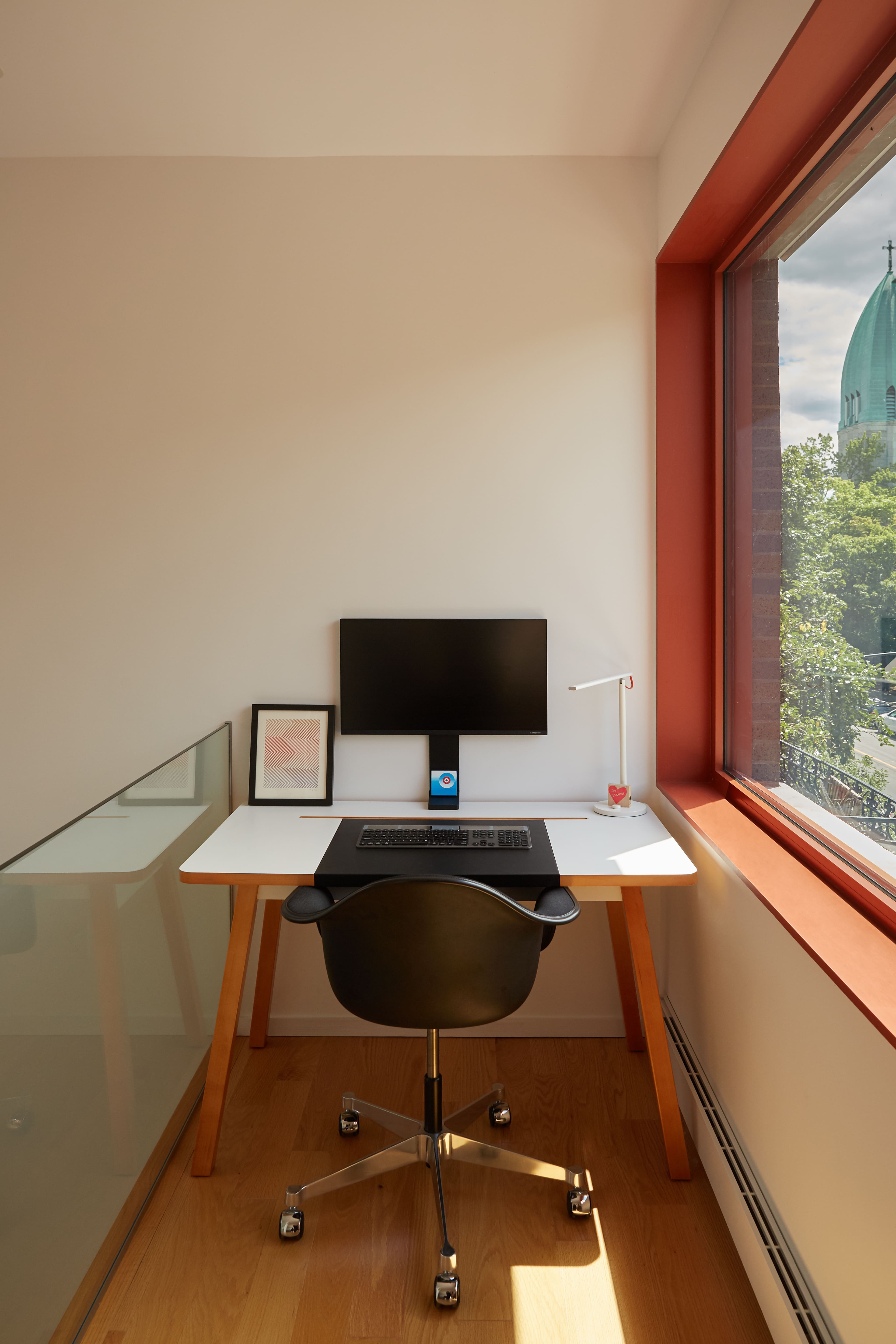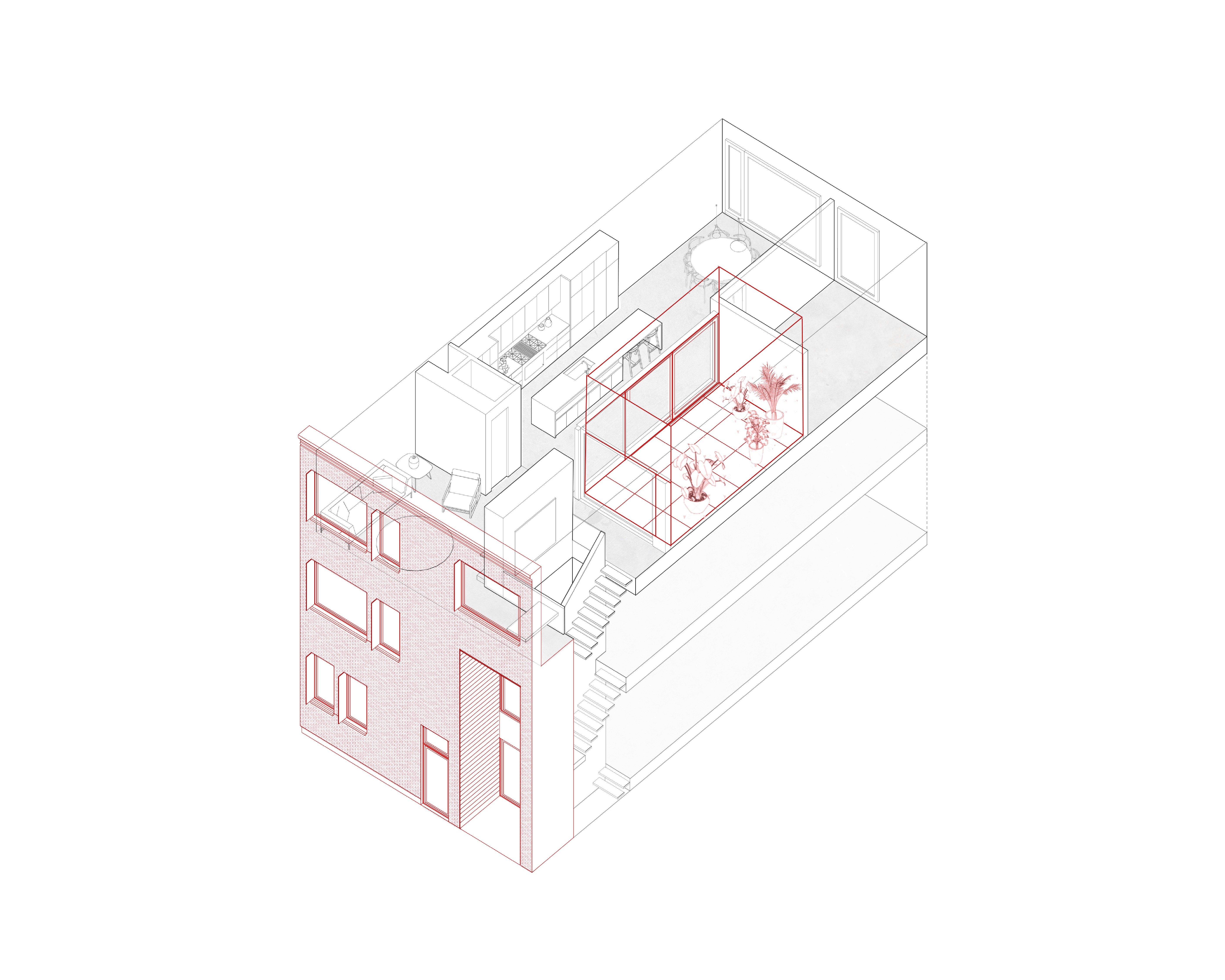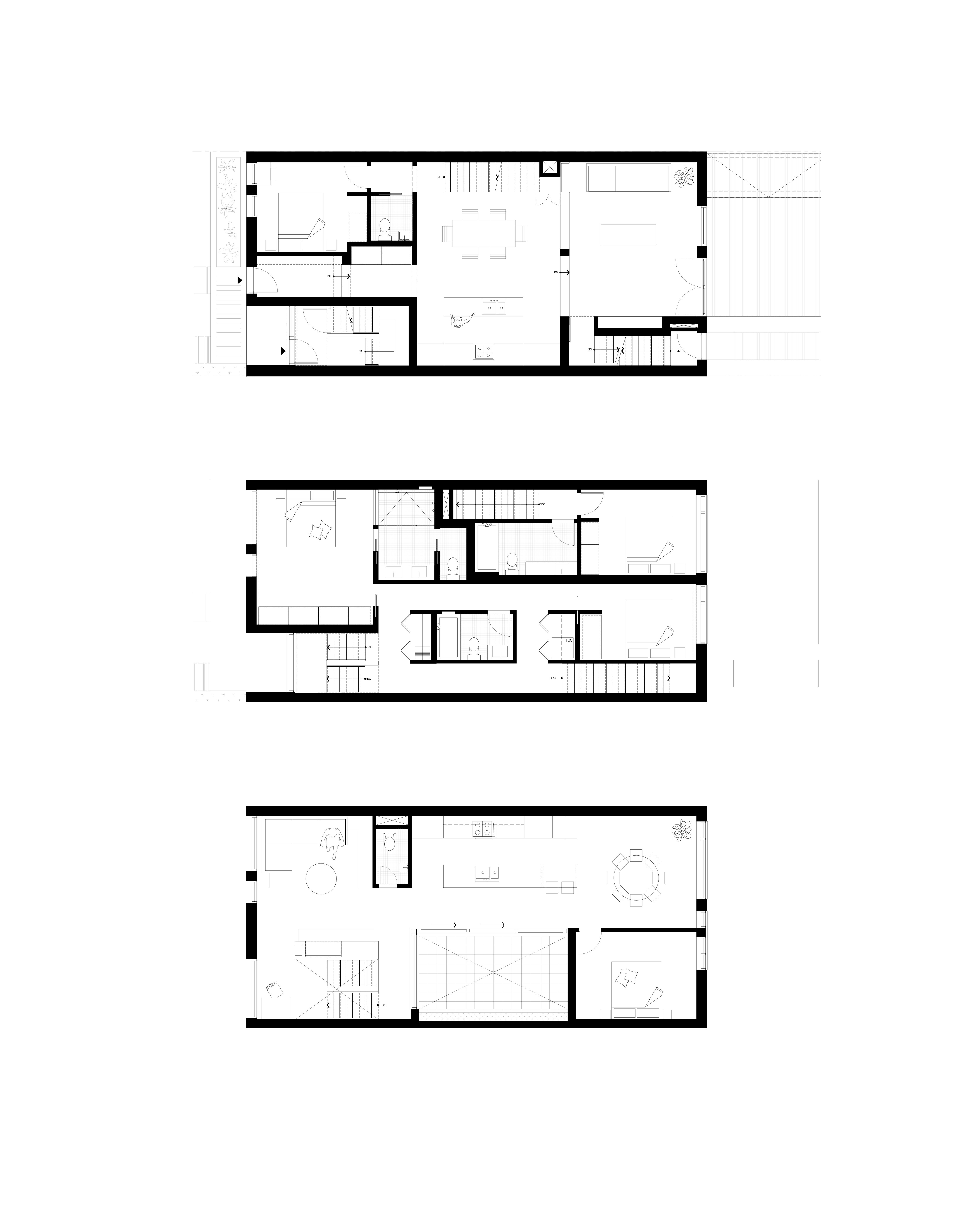 Développée sur trois étages, la construction superpose les deux unités, chacune bénéficiant d’un niveau complet, auquel s’ajoute une partie du niveau intermédiaire. L’idée est d’offrir des logements traversants, ouverts à la rue comme à l’arrière, et dont les qualités d’espace et de lumière seraient strictement équivalentes, à quelques pi² près. Un jeu de terrasses en escalier est ainsi donné au logement ne bénéficiant pas d’un contact direct avec le sol. Les zones jour et nuit sont quant à elles superposées afin de préserver la tranquillité de chacun.