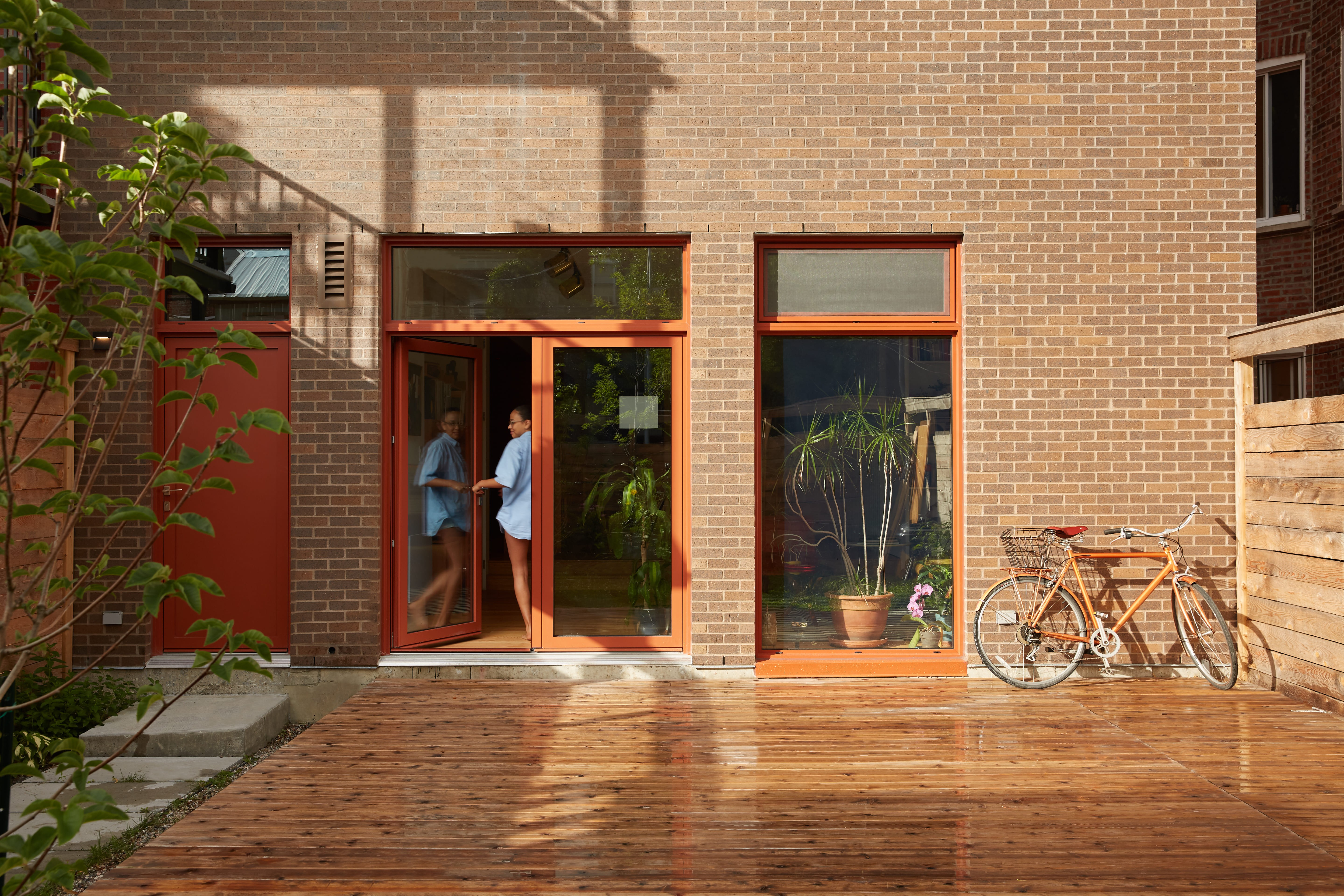 Une géométrie très simple et des ouvertures généreuses affirment le caractère contemporain du monolithe, tout en assurant son intégration au contexte environnant. Les alignements du front à rue sont respectés, de même les gabarits et les matérialités. Les dégradés gris-bruns de la brique de façade reprennent ainsi les couleurs alentours. Deux entrées privatives permettent au frère et sœur de se sentir « chacun chez soi », et pourtant très proche de l’autre.