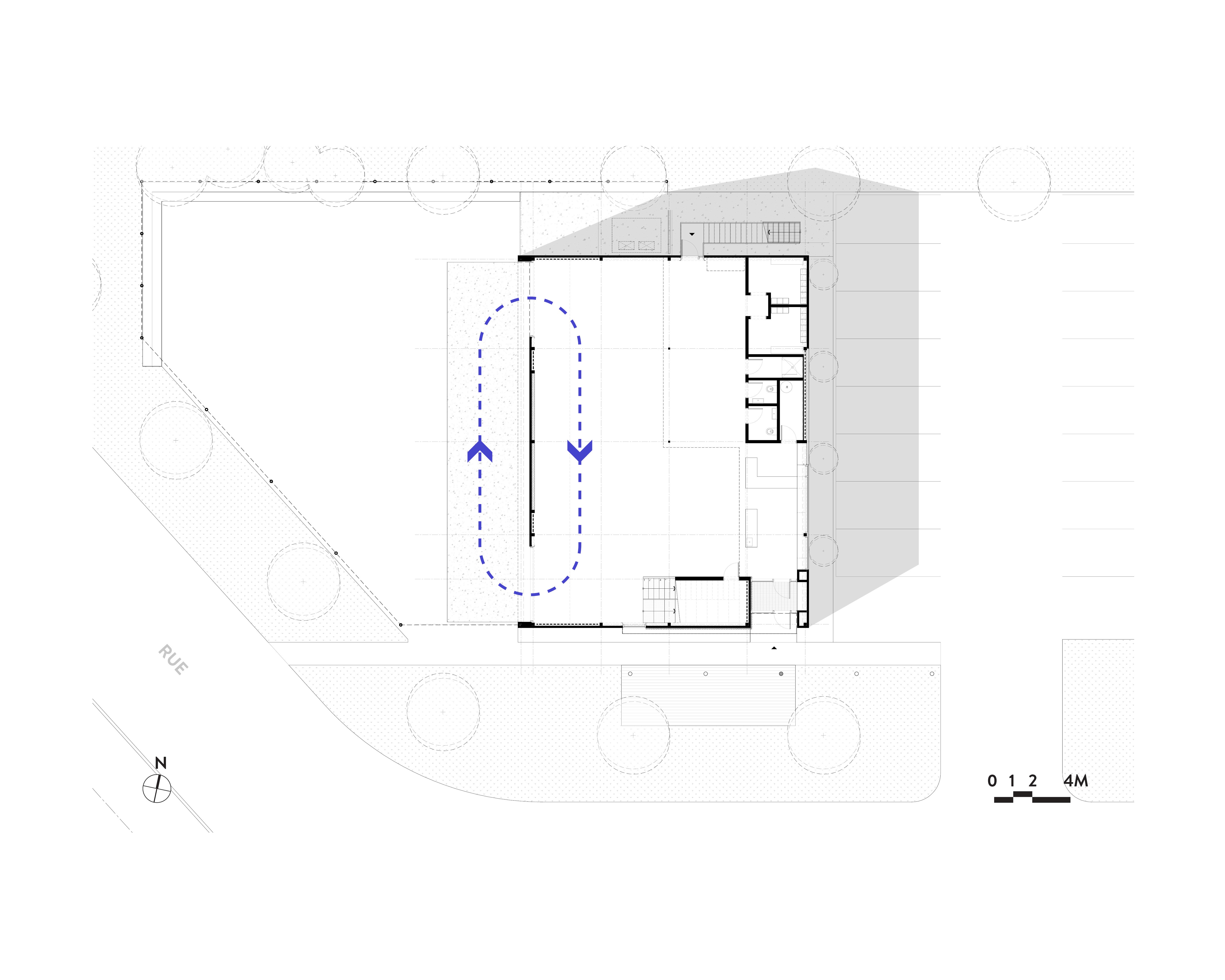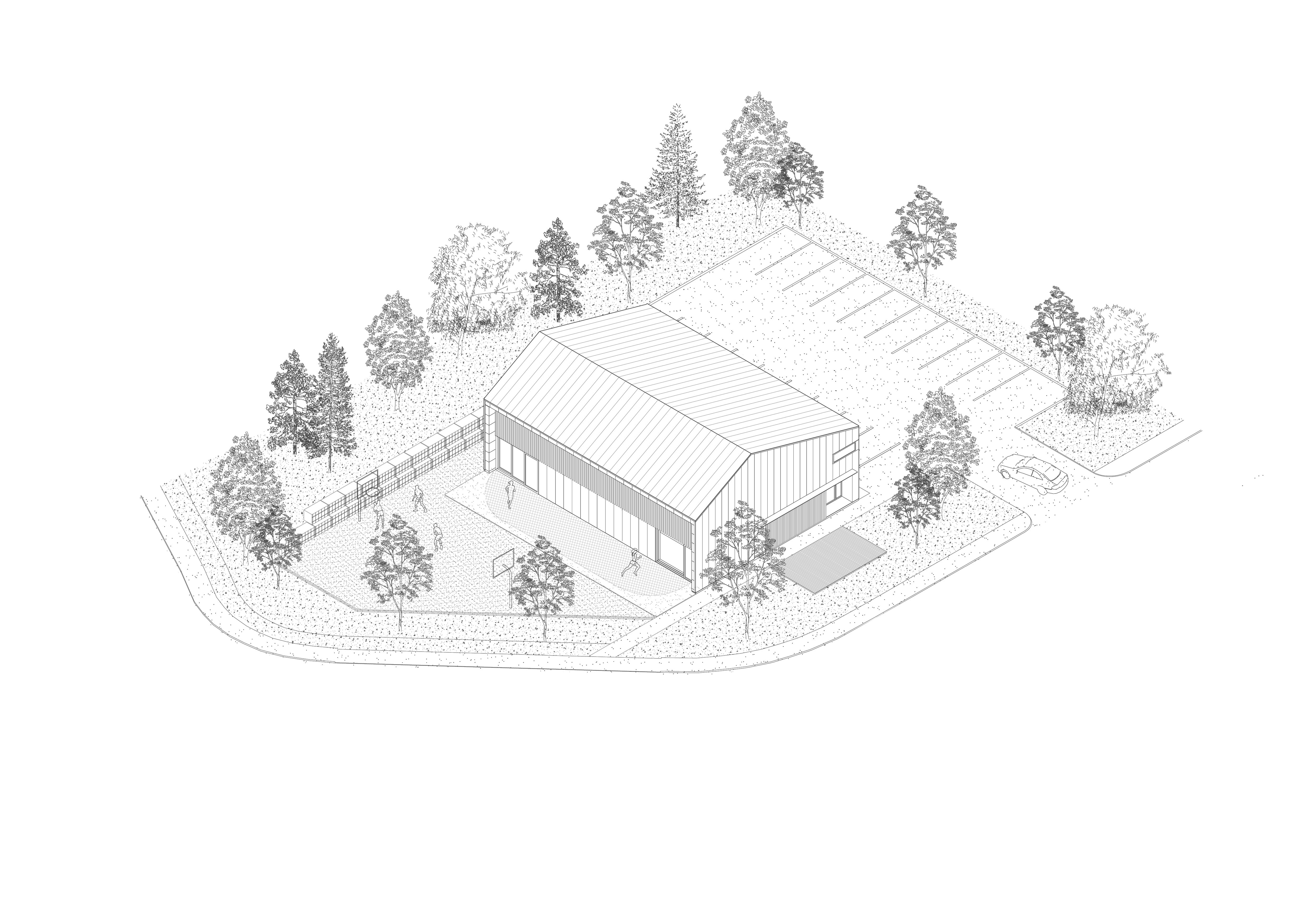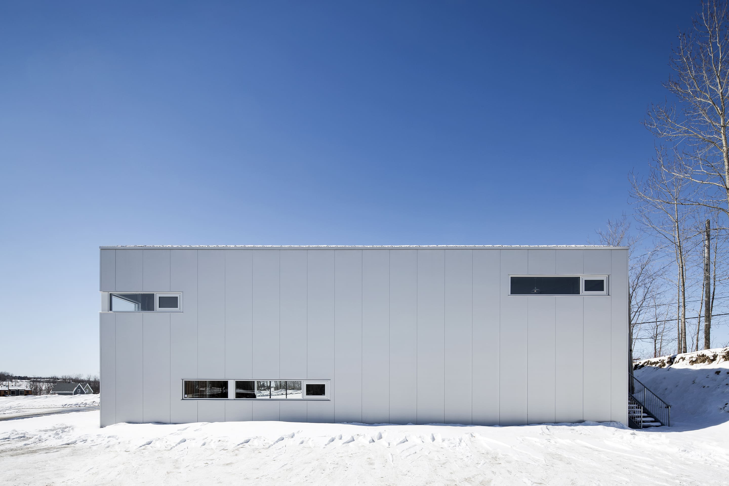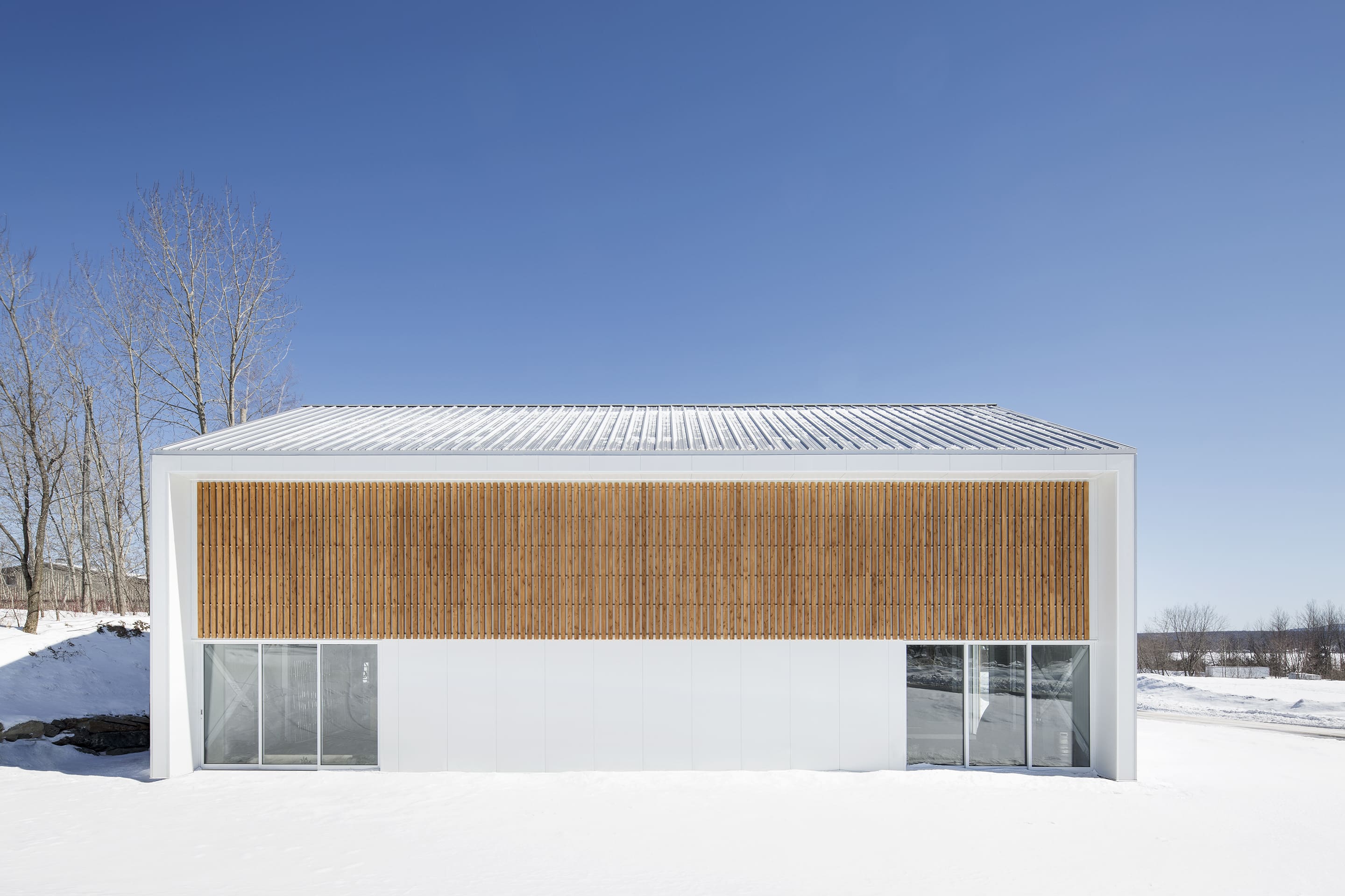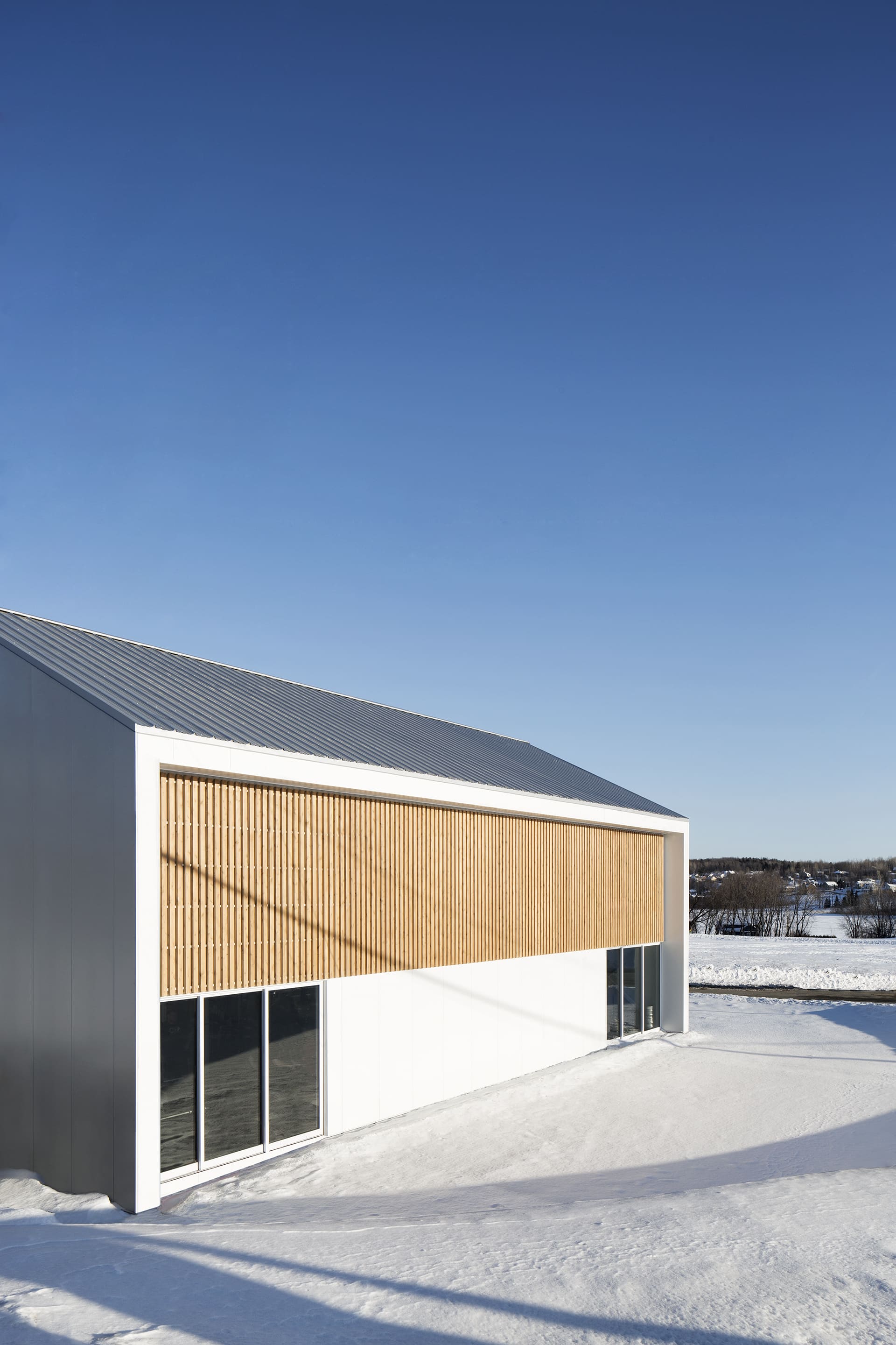 La forme compacte du nouveau bâtiment, en plus de limiter l’étendue des fondations et la surface des murs extérieurs, permet de libérer une portion importante du terrain, créant ainsi une zone d’entraînement extérieure reliée aux activités intérieures grâce à l’ouverture de grandes portes coulissantes vitrées.