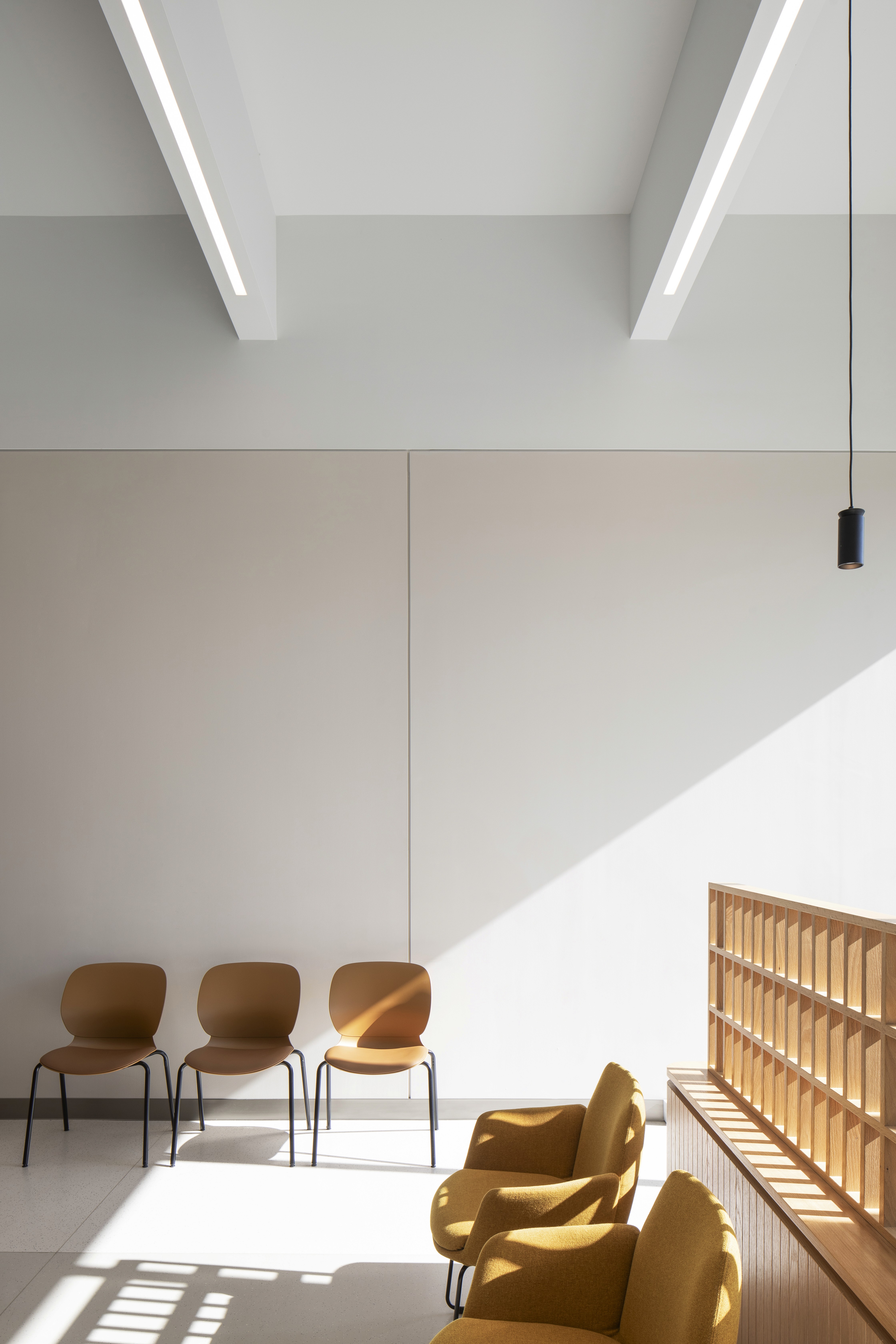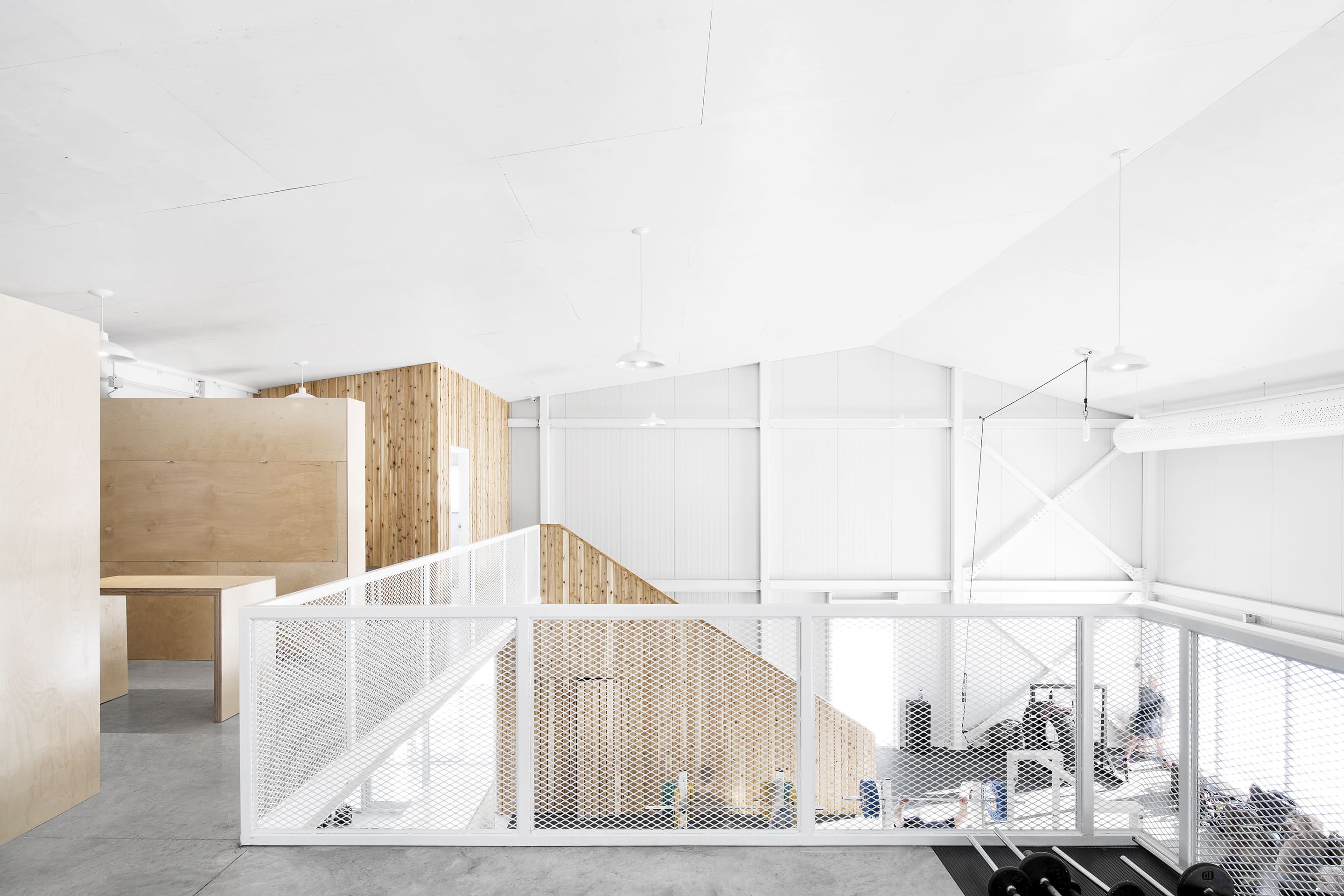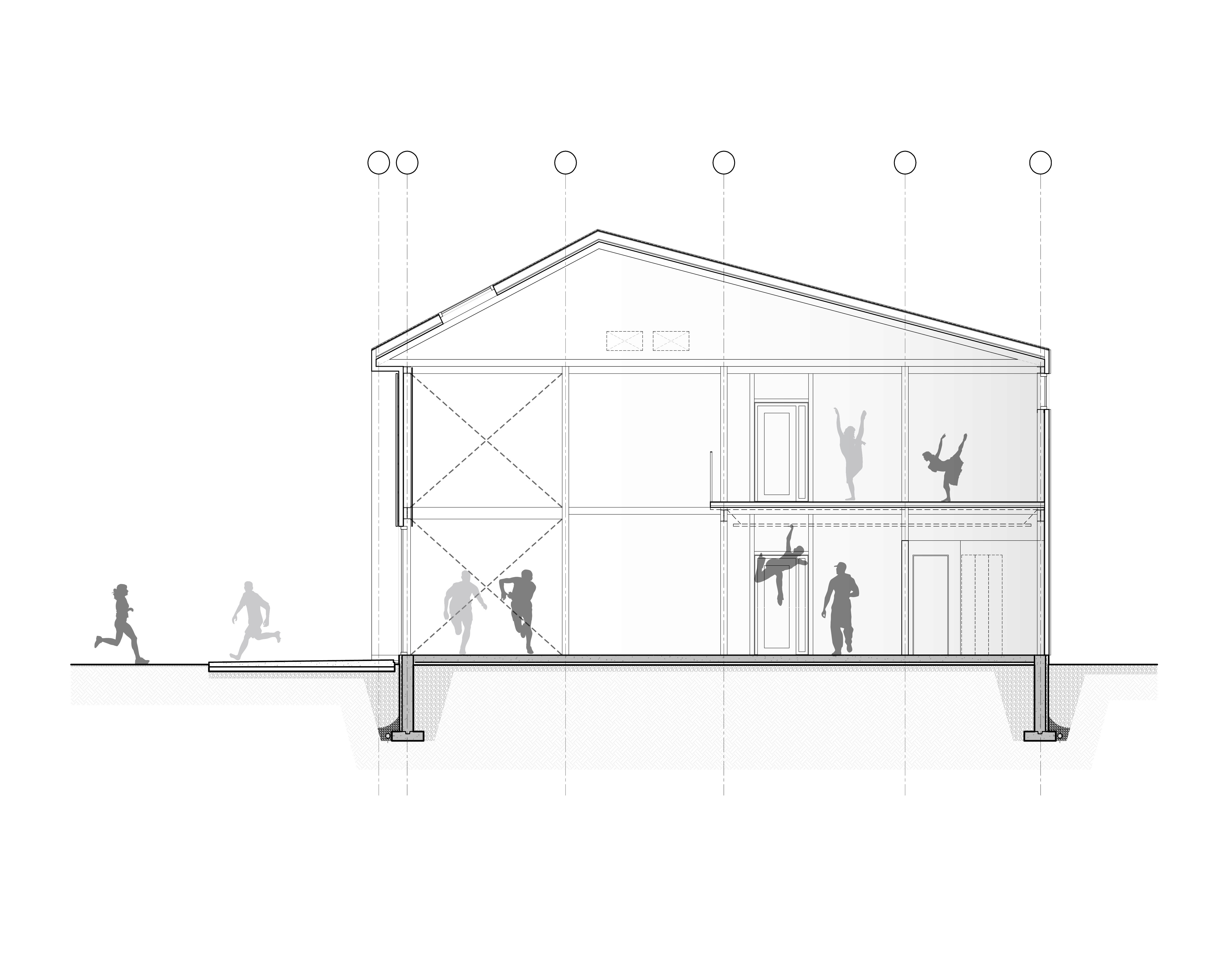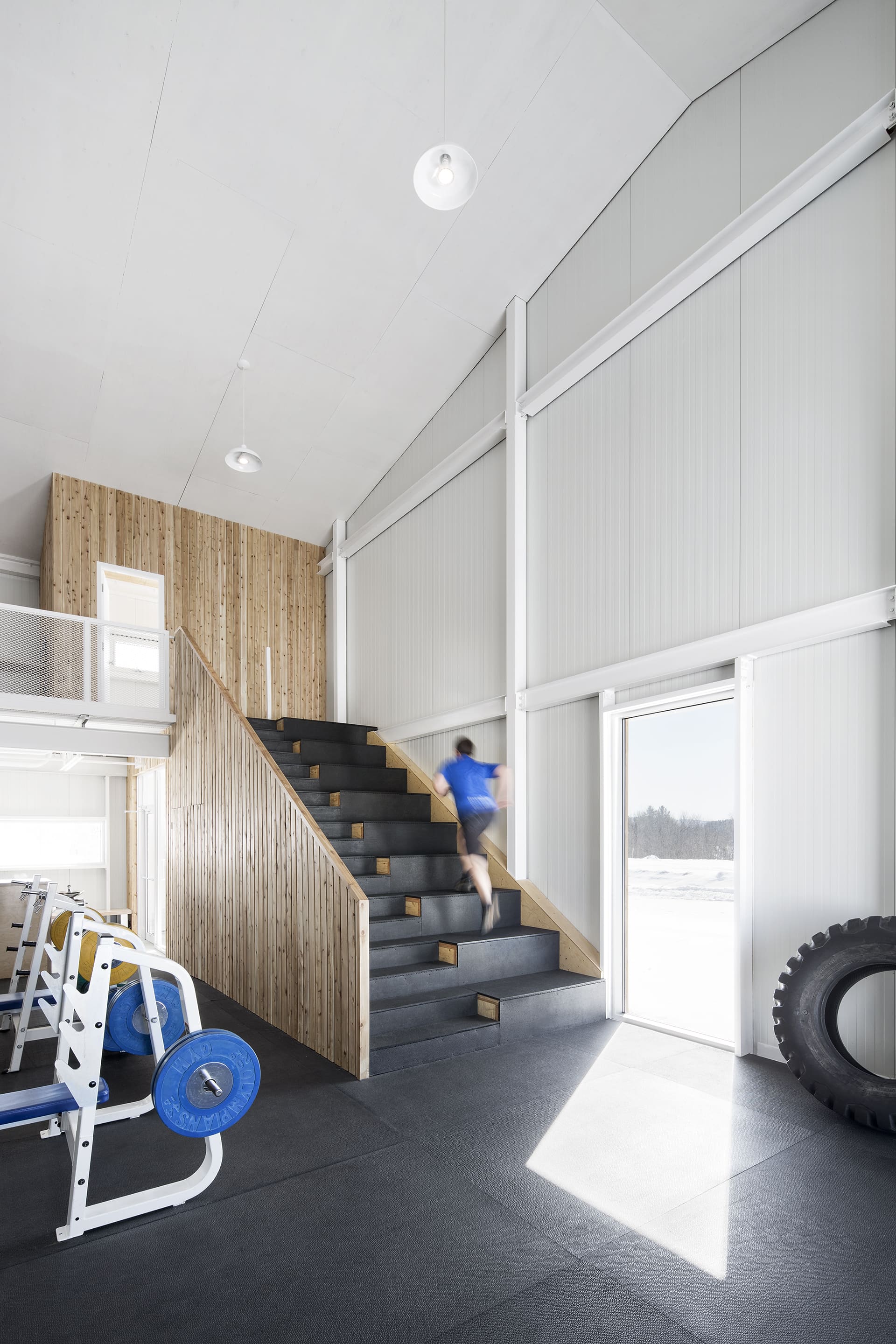 Le projet parvient à rendre utile chaque élément constructif qui le compose, qu’il s’agisse de la structure de la mezzanine soutenant des barres horizontales, des grandes marches reliant les 2 étages aménagées comme paliers d’entraînement, ou de la structure de la toiture à laquelle sont fixés de grands anneaux permettant aux gymnastes de se suspendre à plus de 30 pieds dans les airs.