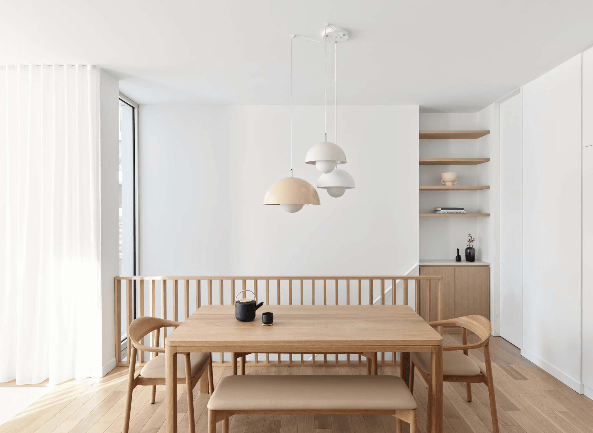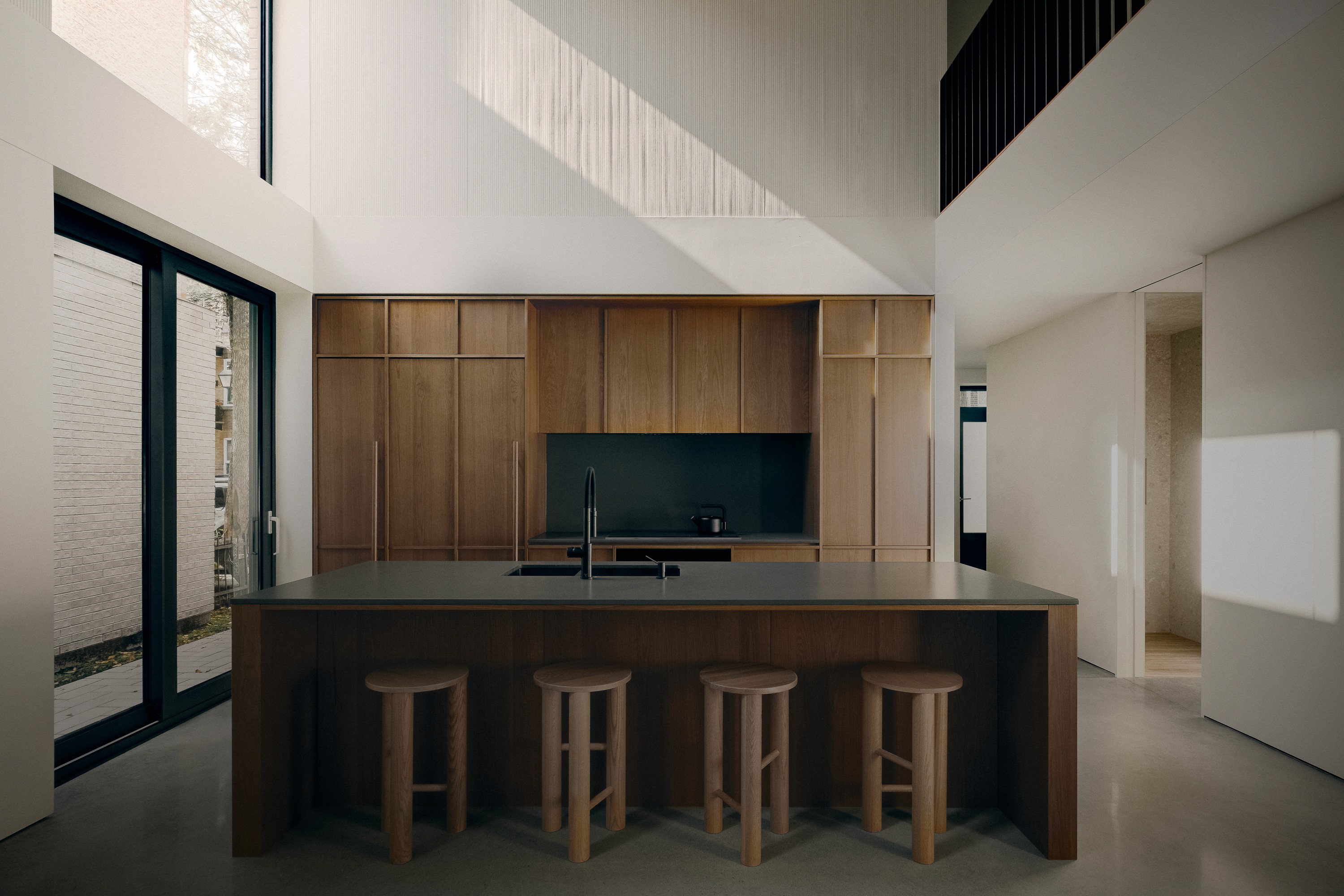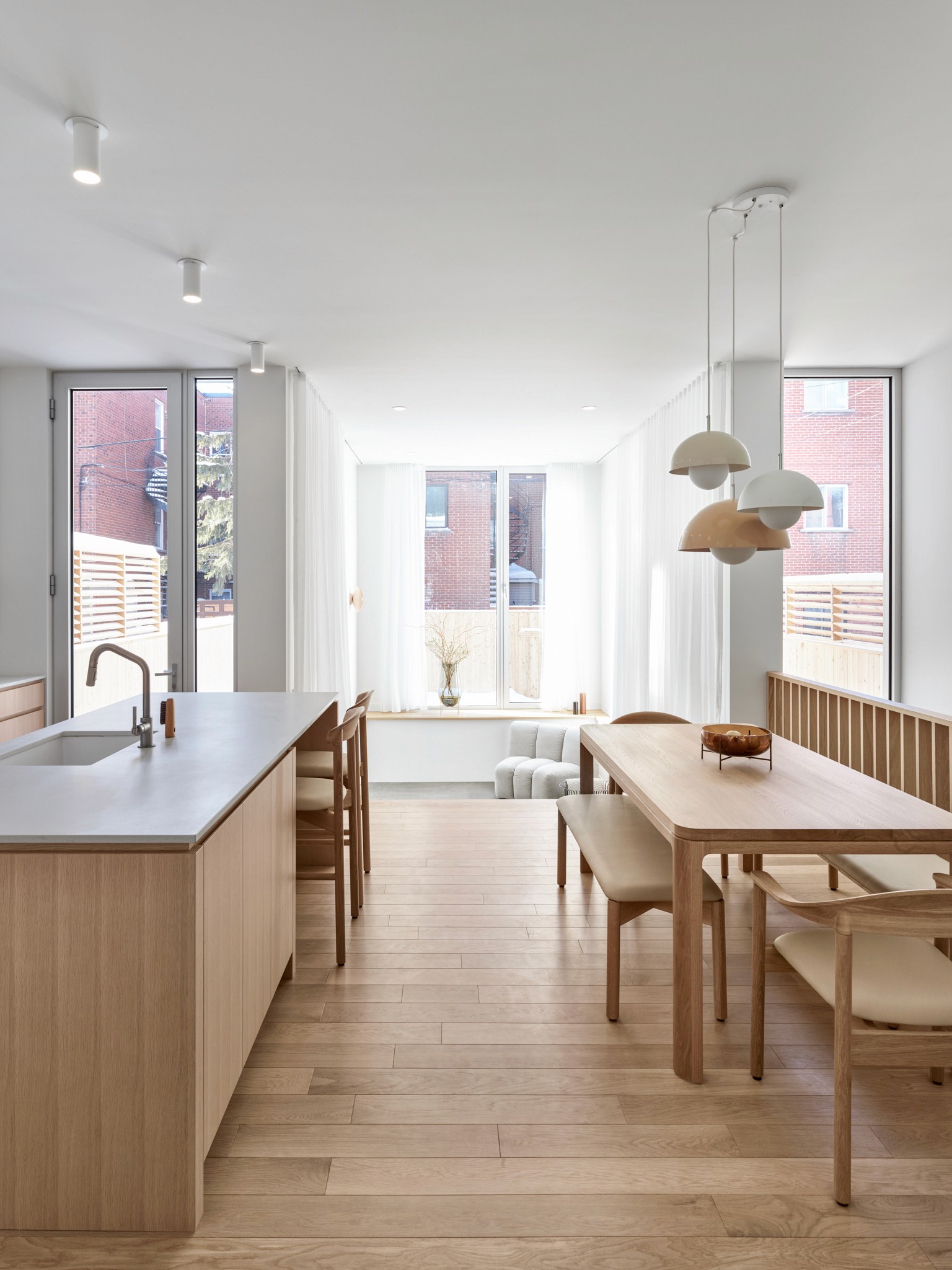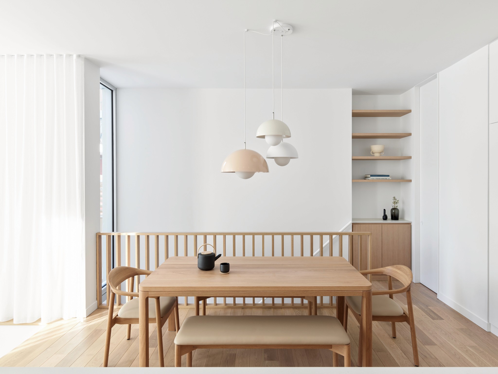 La conversion d’un duplex en maison unifamiliale force également à repenser et rééquilibrer la relation entre les espaces de cohabitation et ceux de l’intime. L’un des gestes centraux du projet est le déplacement de la cuisine à l’intérieur du carré originale du bâtiment, permettant de dégager l’annexe où autrefois elle était restreinte.