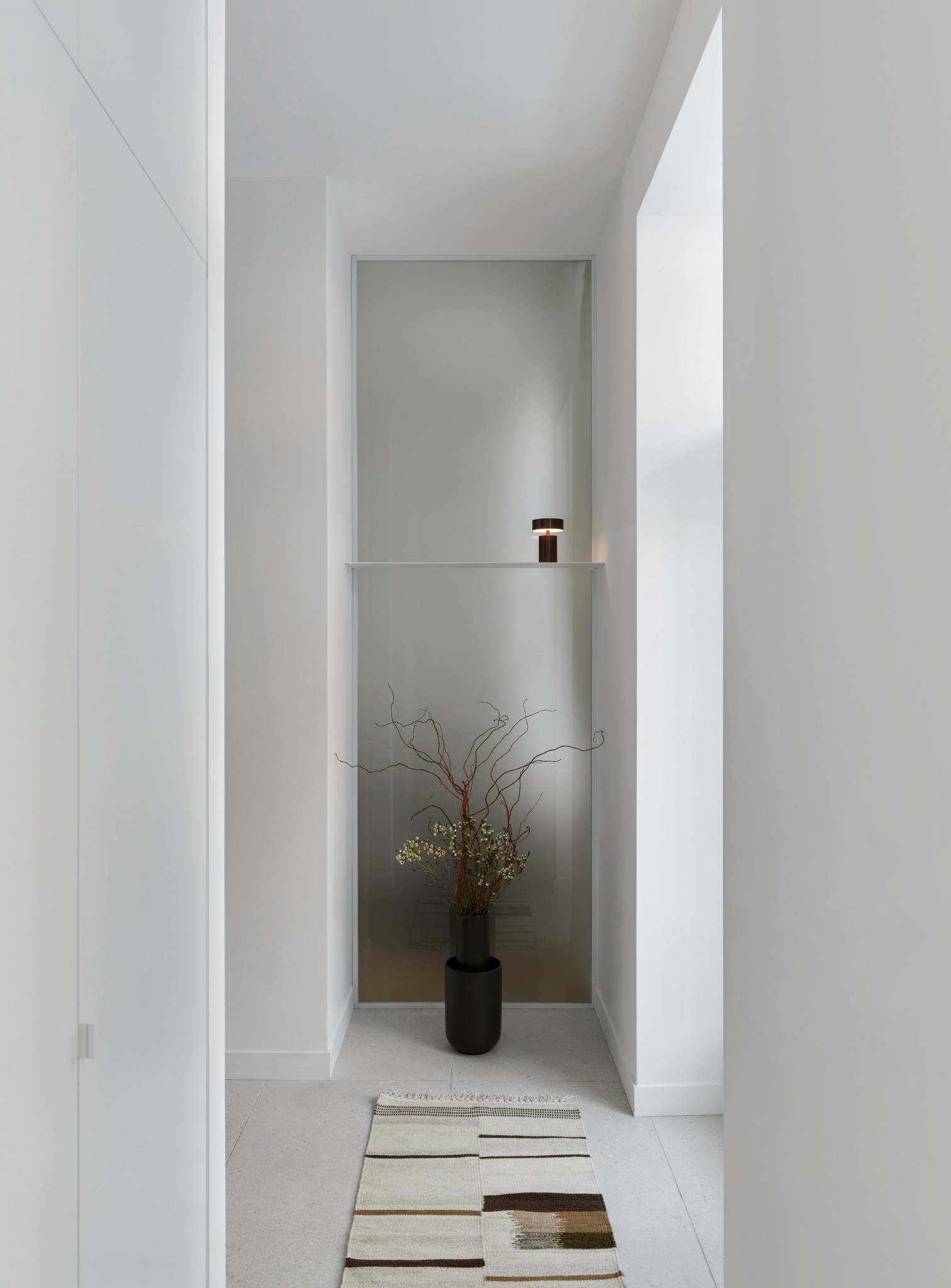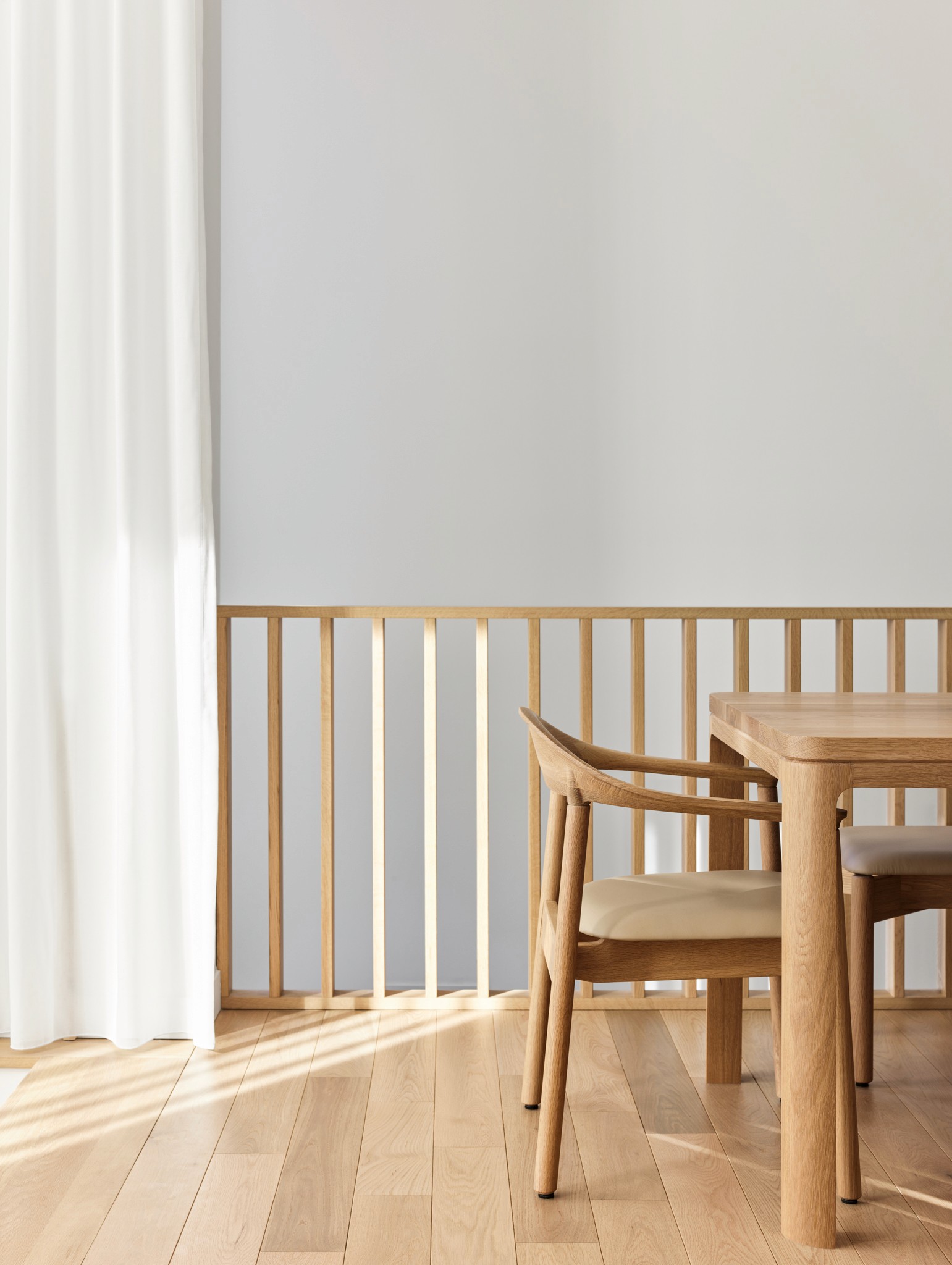 Au rez-de-chaussée, l’expérience propose une transition. Du vestibule clos, où seul un mur de verre opaque donne l’indice des autres pièces, on avance dans un salon entrouvert, avant d’arriver à un espace dégagé où se rencontre la cuisine, la salle à manger la salle familiale.
