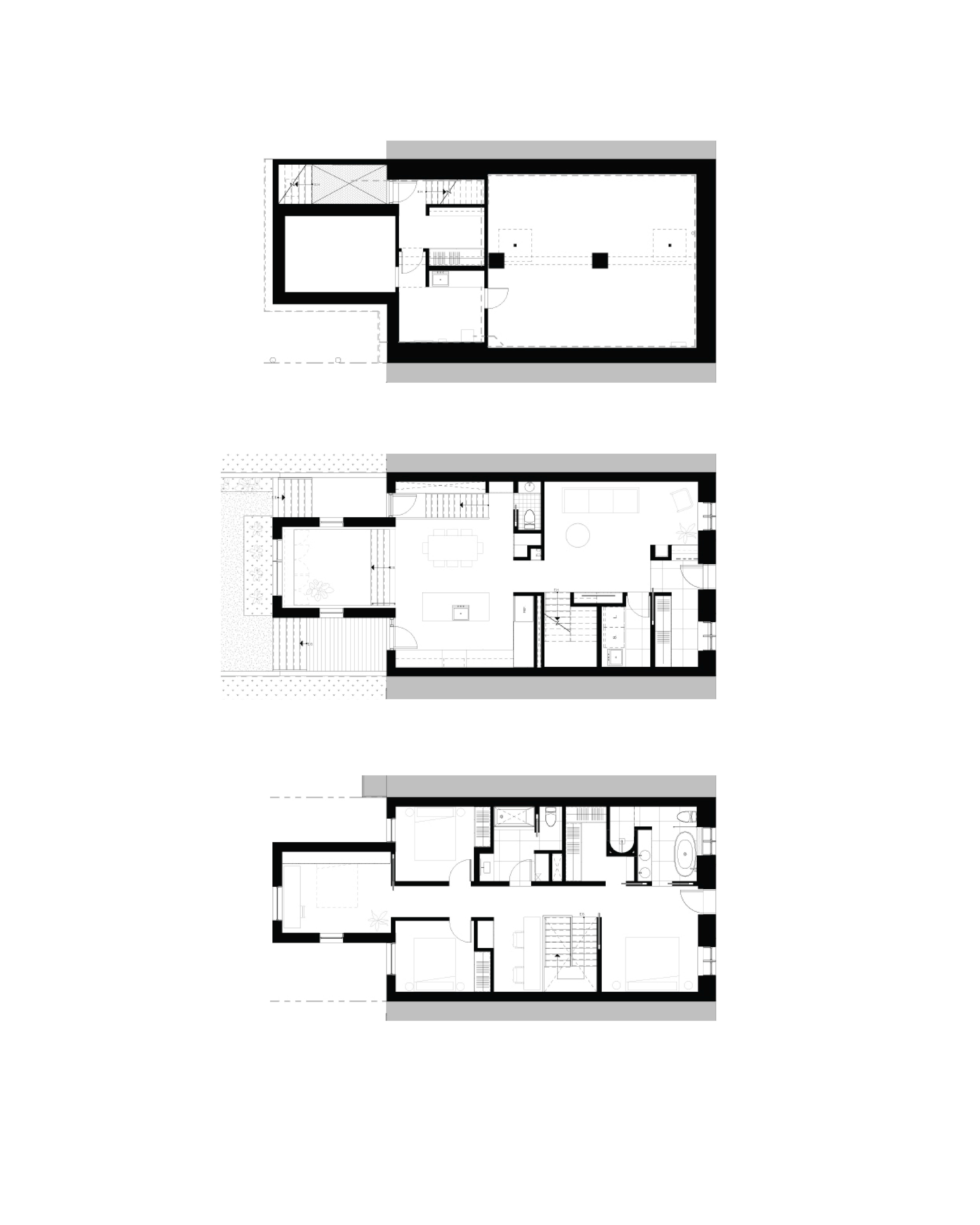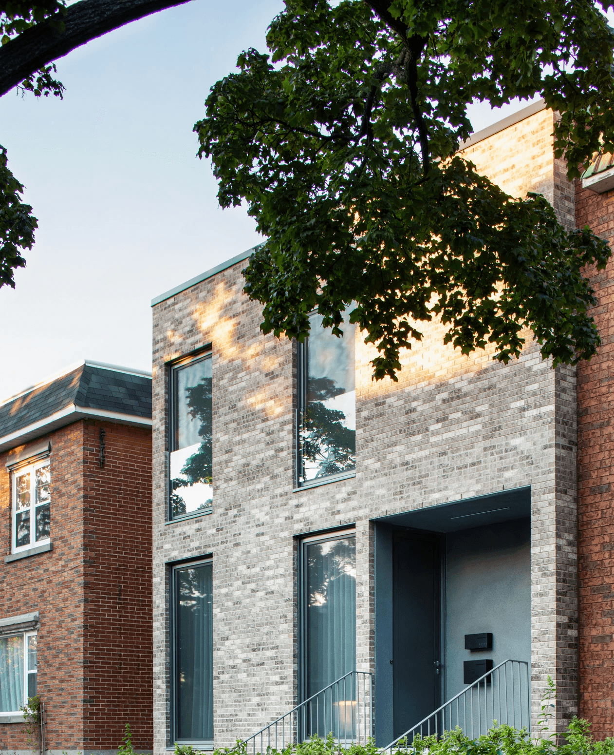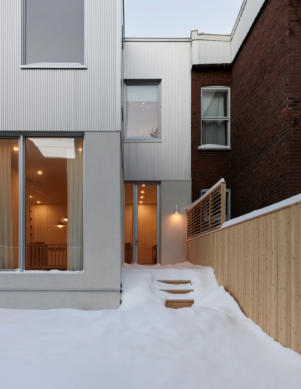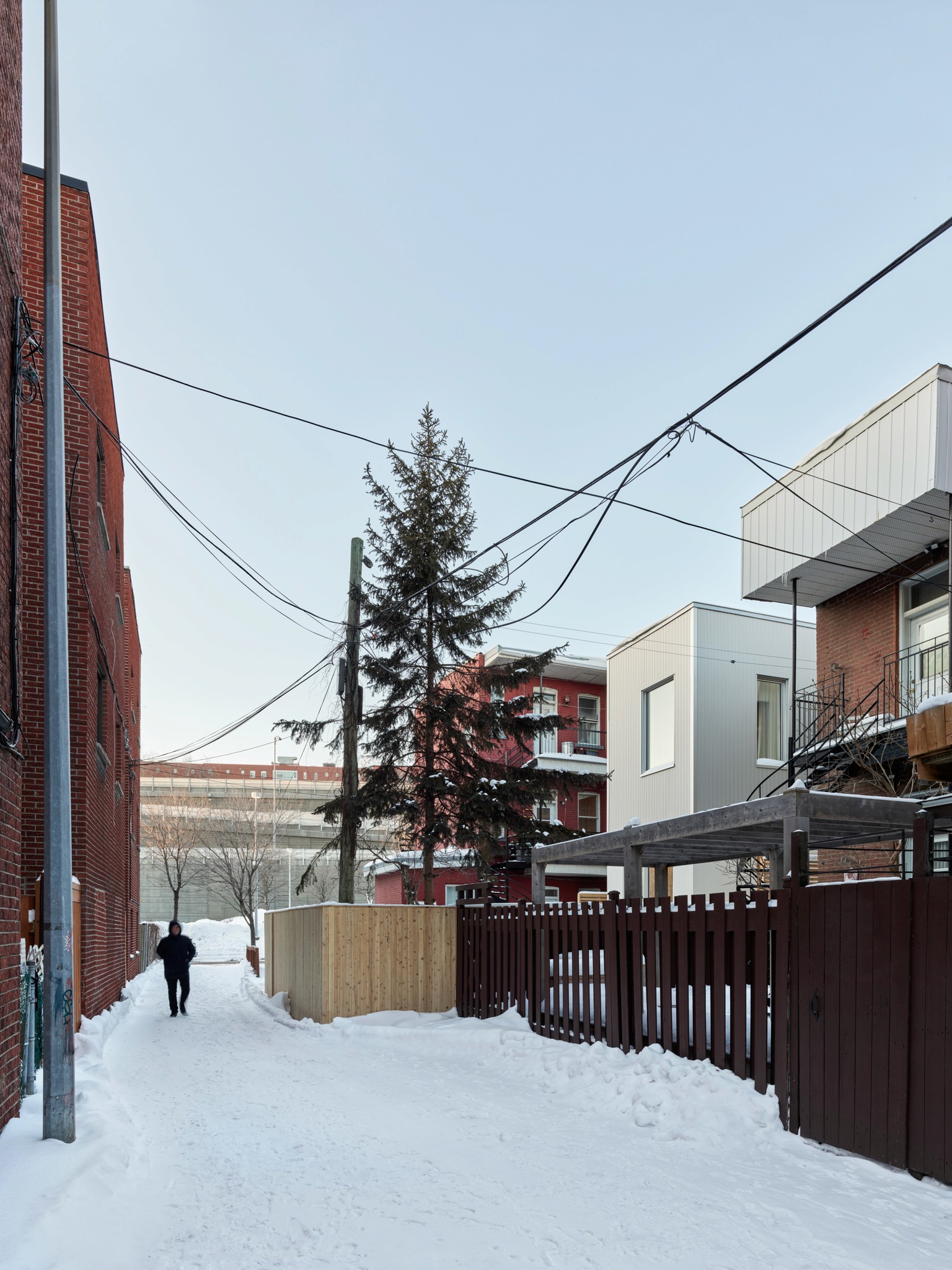 Le projet Laporte conserve la même implantation et volumétrie que le bâtiment initial. C’est plutôt l’intérieur qui se transforme. Les deux logements sont fusionnés en repositionnant l’escalier au centre de l’habitation. Cette stratégie de reconfiguration vise également à ouvrir les pièces de vie du côté de la ruelle. La lumière du sud-ouest peut alors s’inviter plus facilement dans les espaces du quotidien.