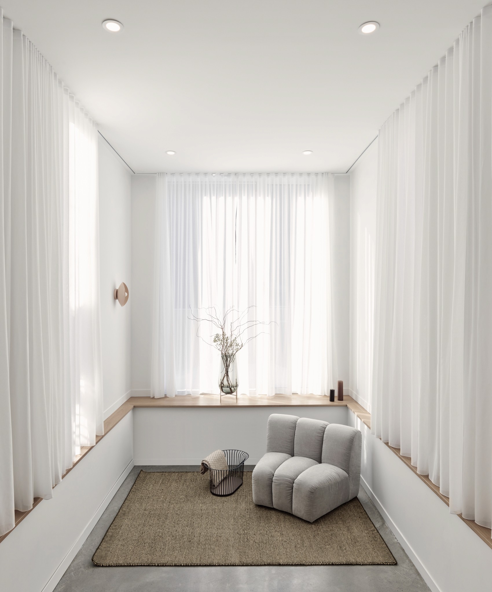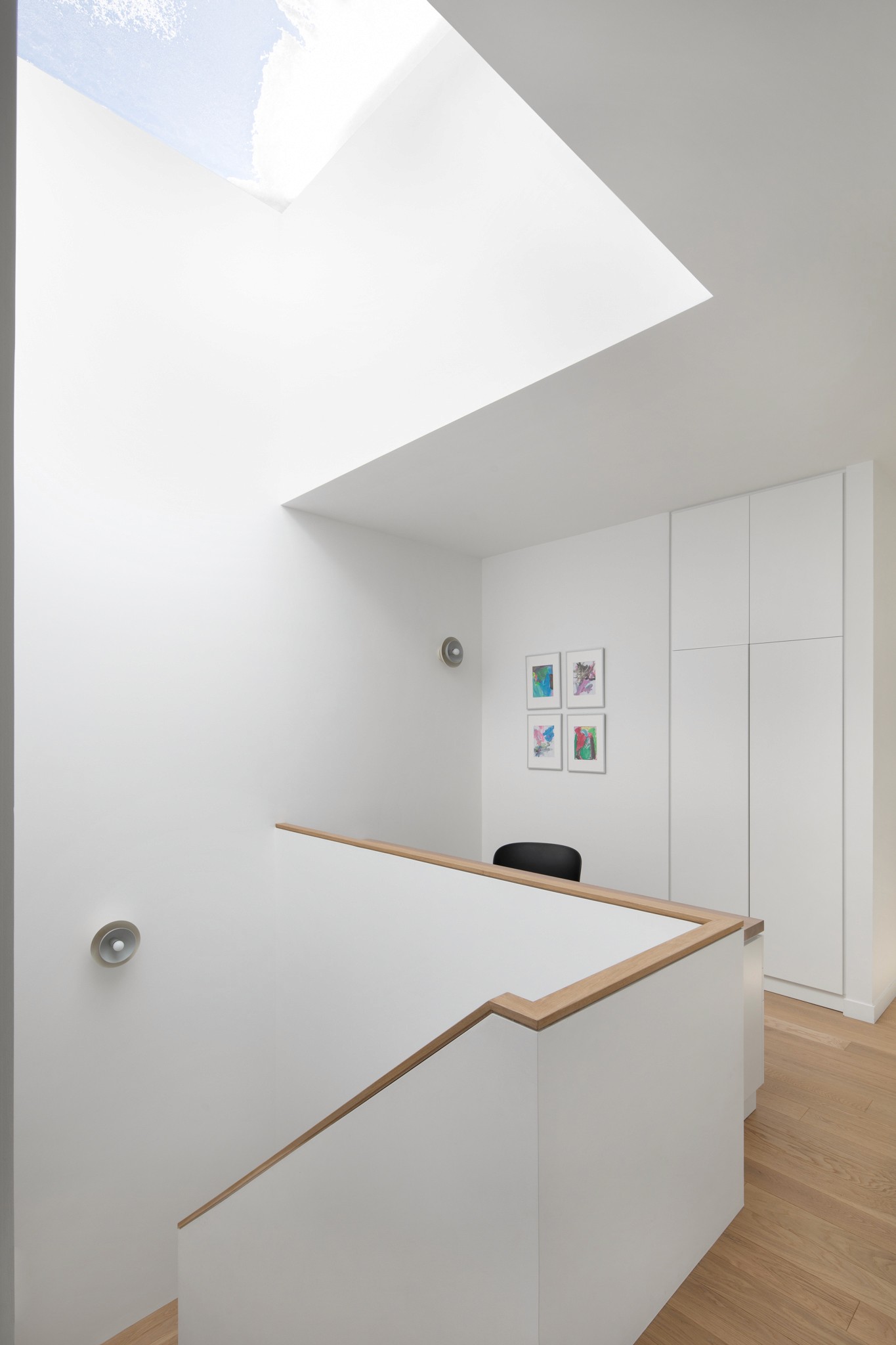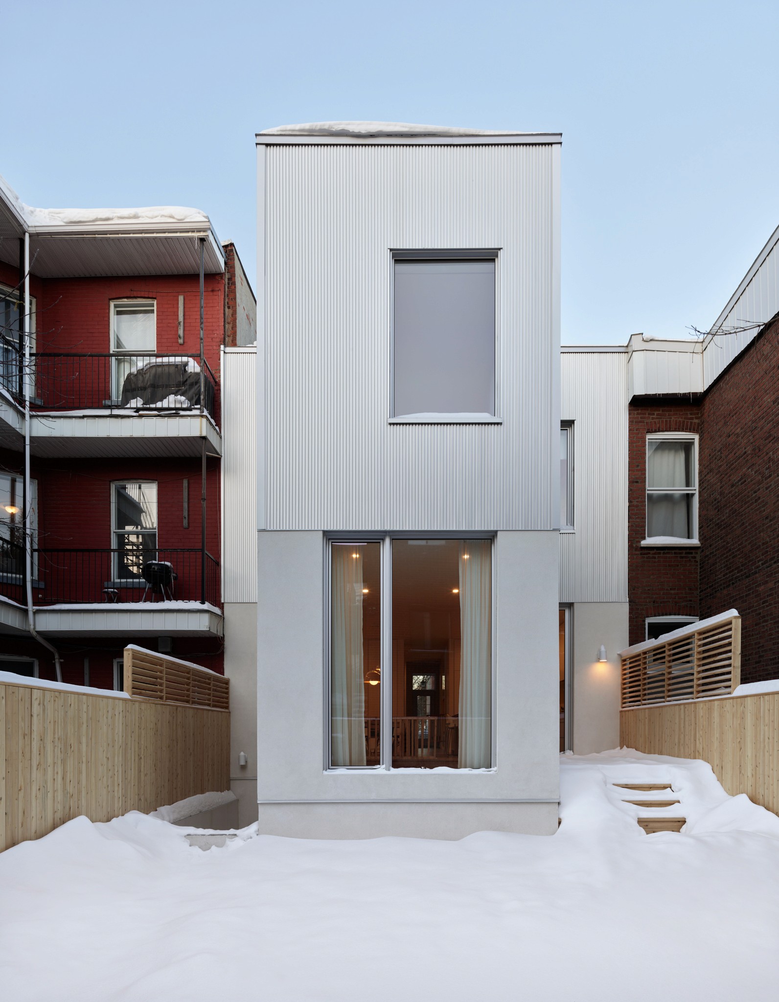 À l’arrière, le premier étage est enduit d’un crépi blanc, presque neige. Le deuxième étage propose un parement métallique réfléchissant, rappelant les parapets de tôle qui couronnent les bâtiments voisins. Ce choix de matérialité permet de refléter la lumière vers les pièces intérieures, créant un jeu d’illuminations miroitantes.