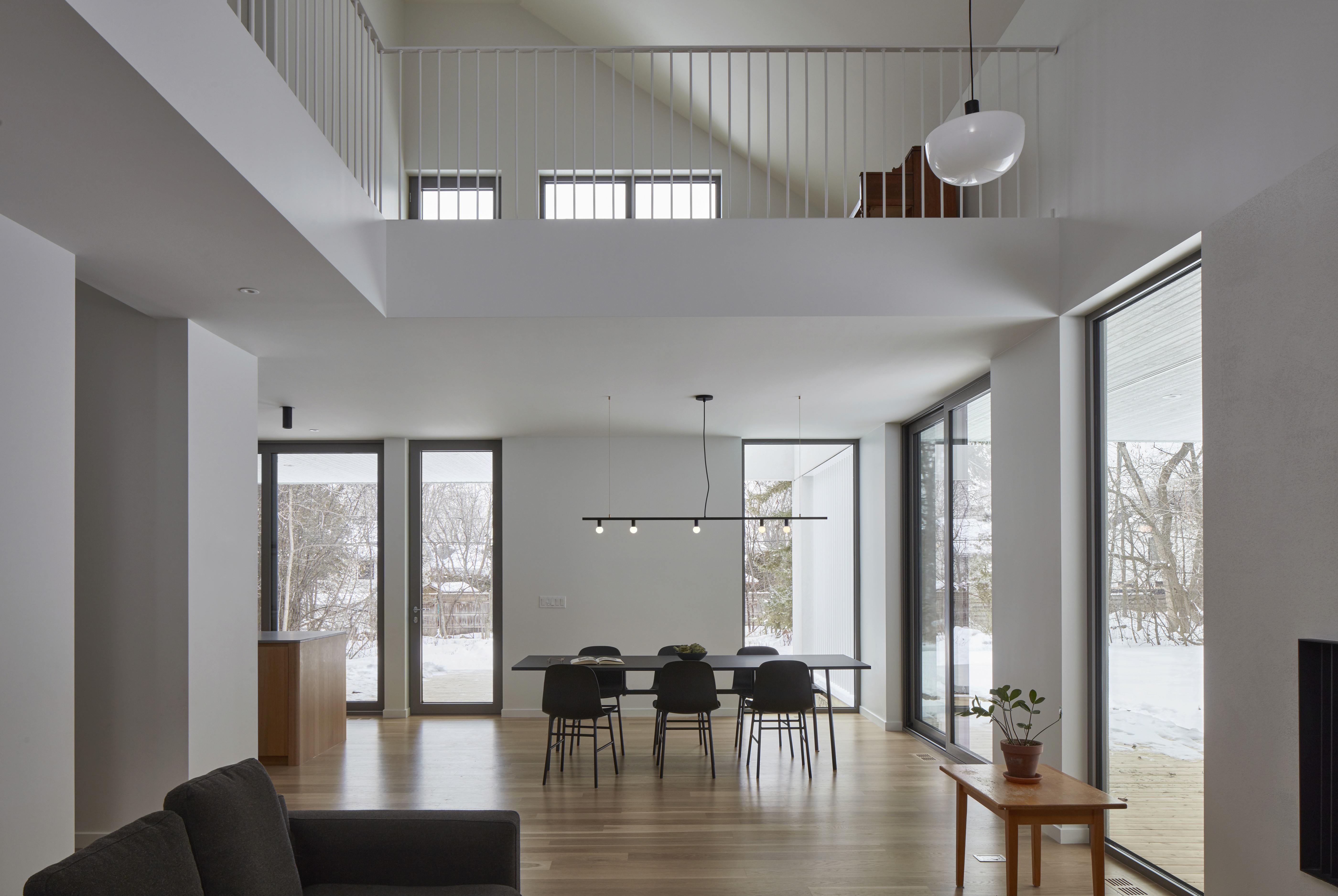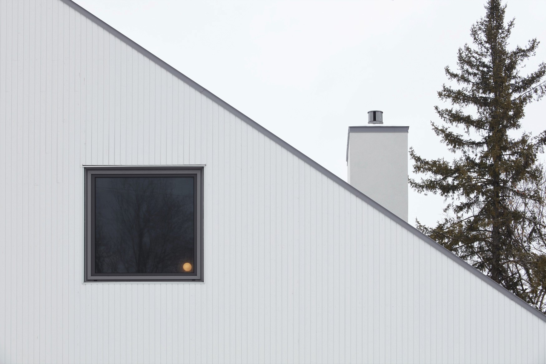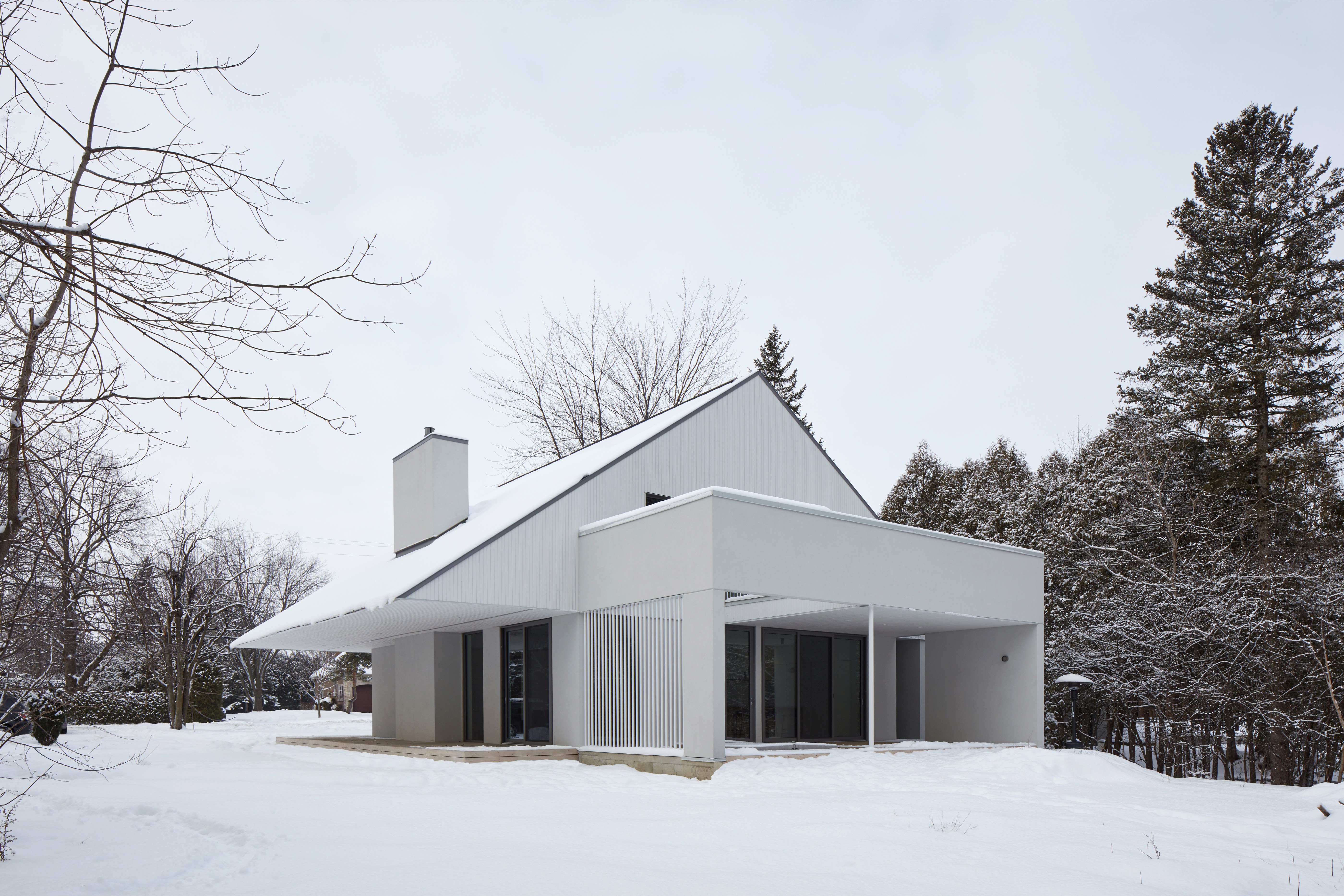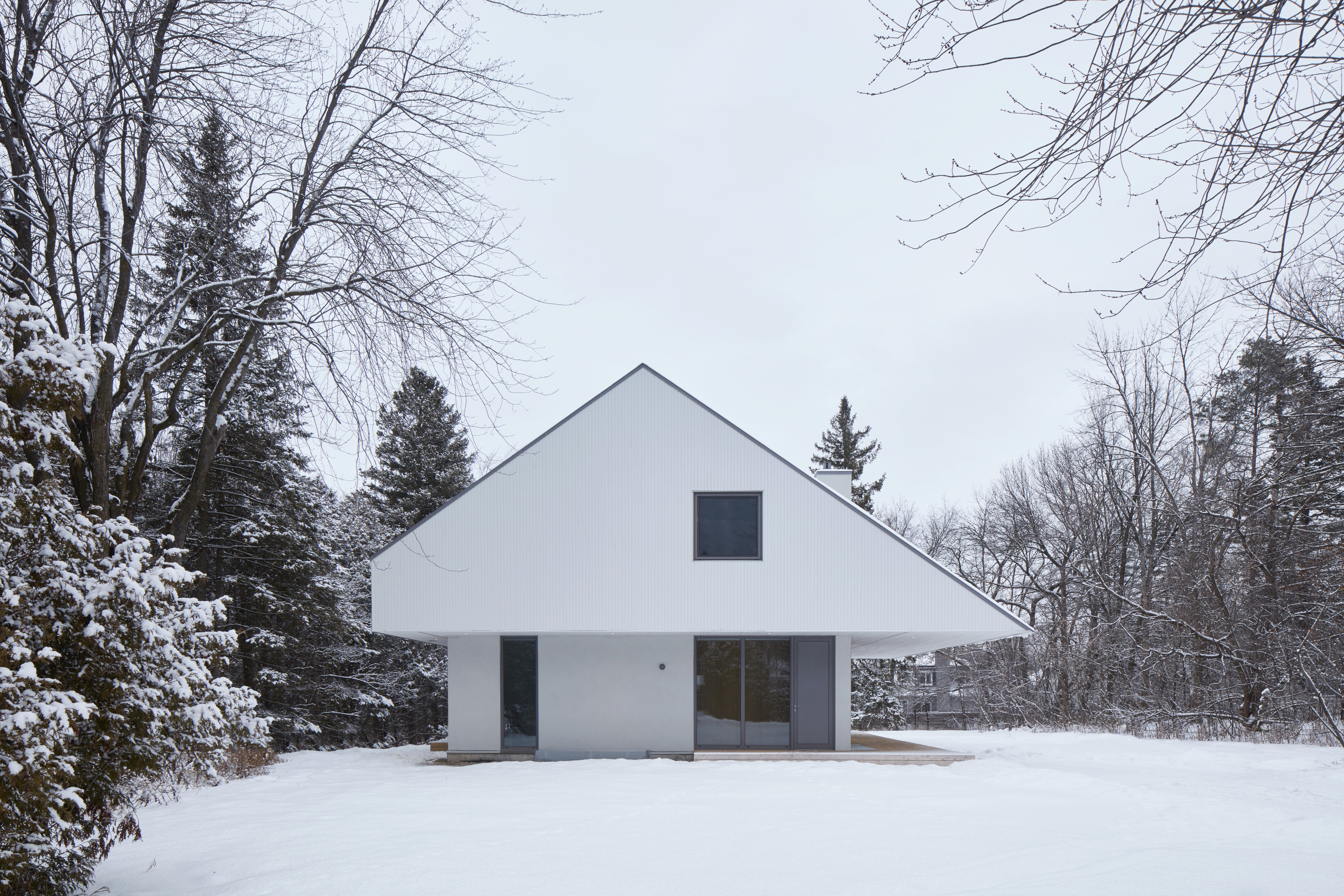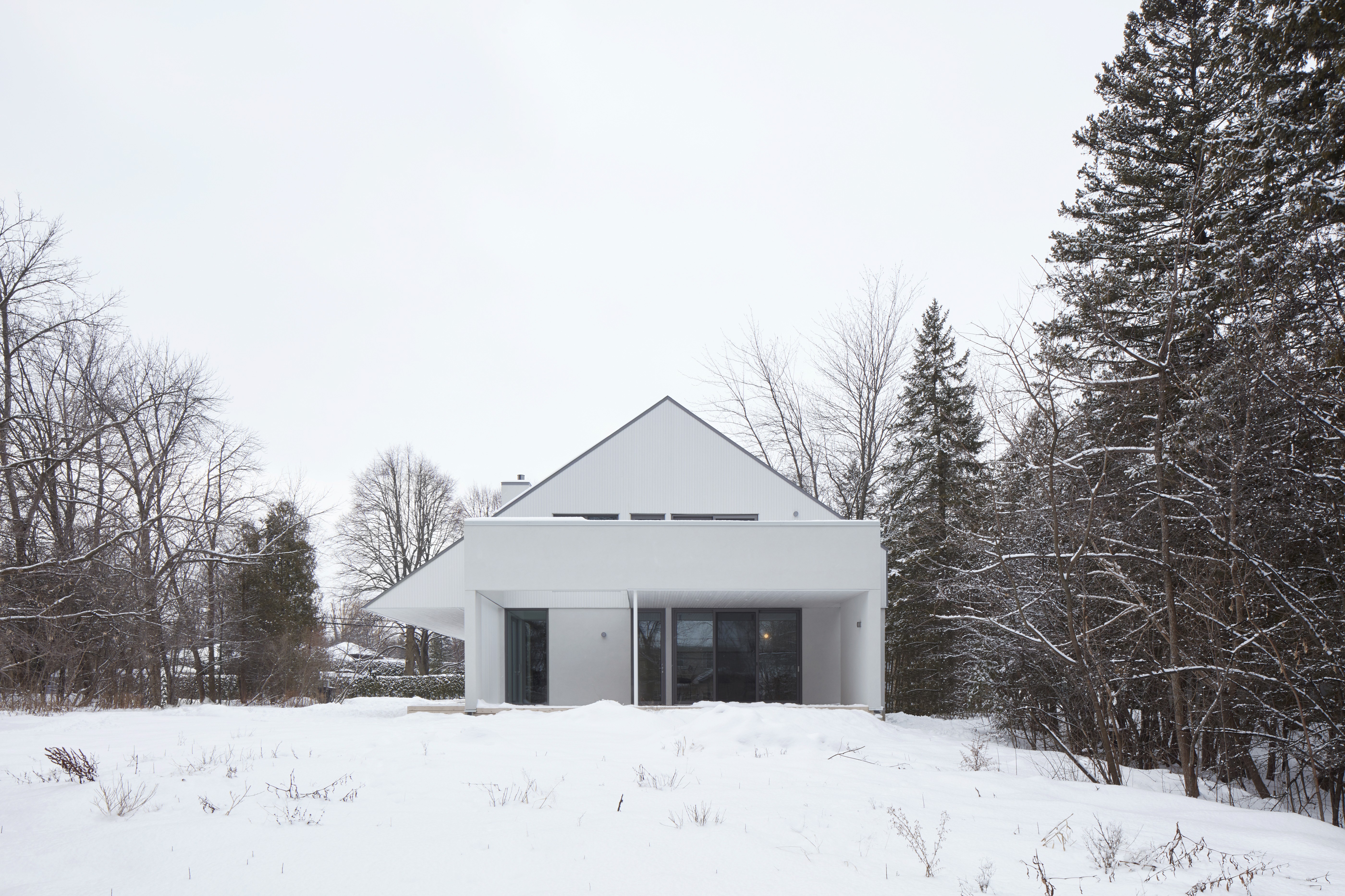 Une maison pensée comme un clin d’œil au patrimoine québécois, évoquant les formes traditionnelles de toiture pour créer une relation singulière avec son environnement.