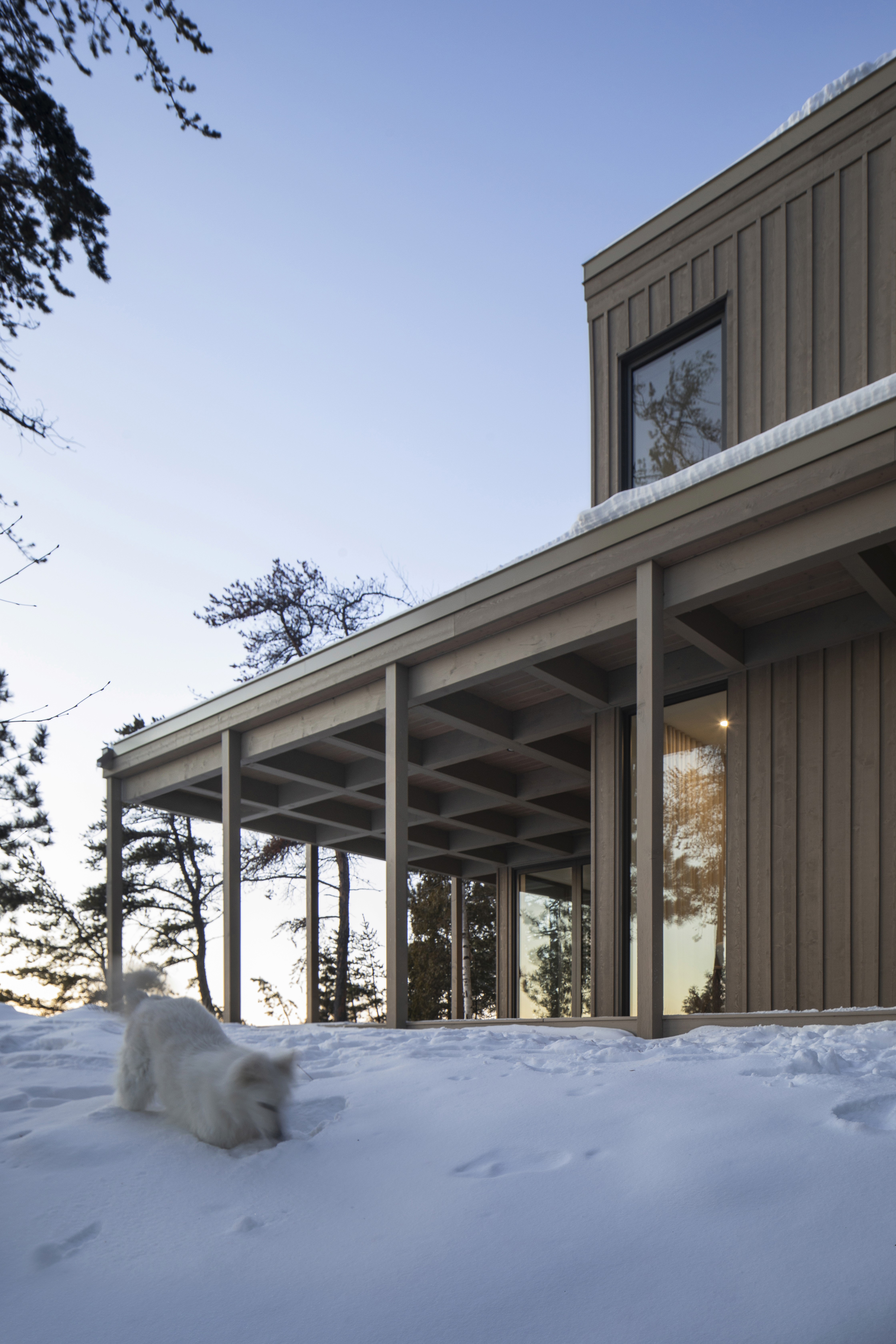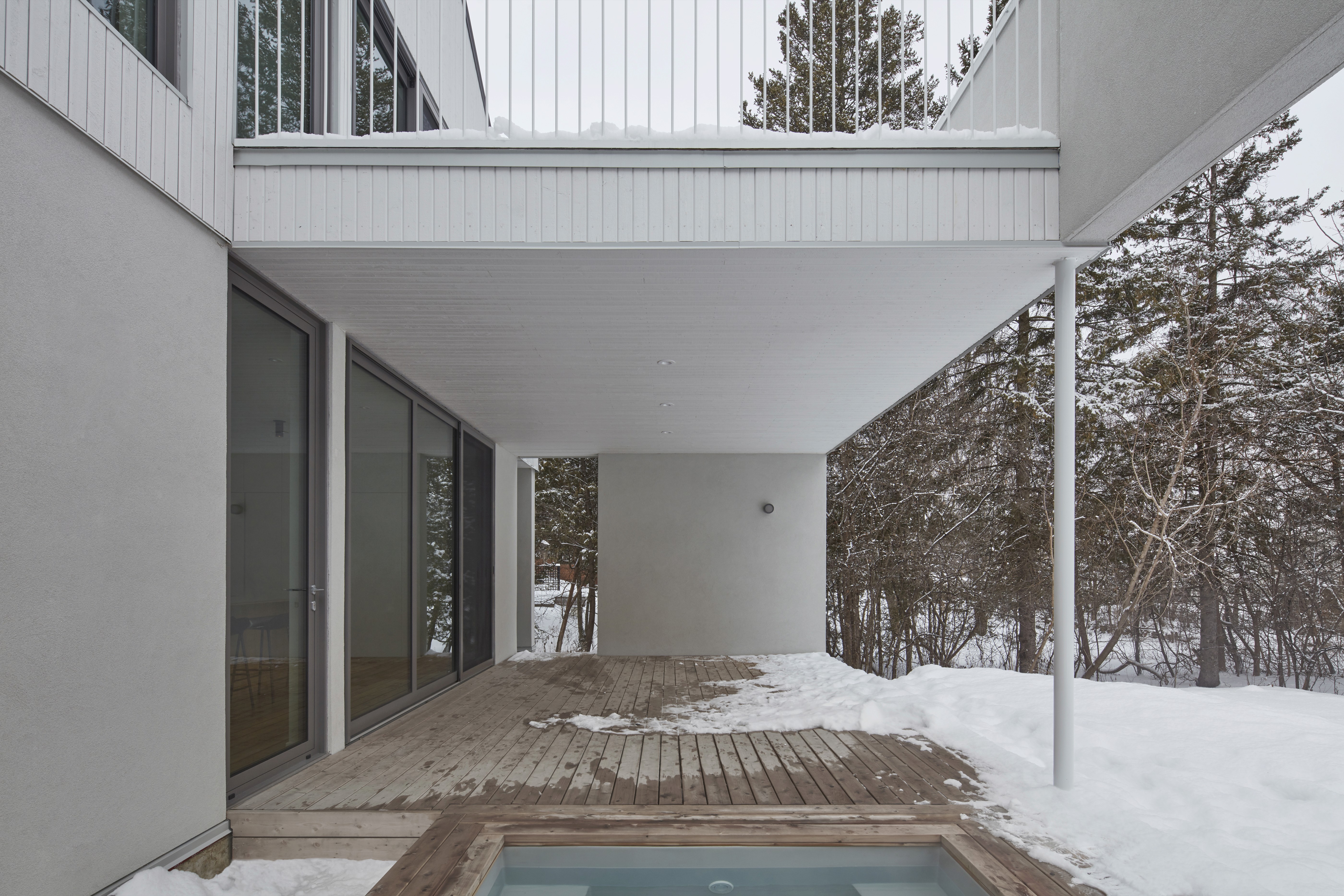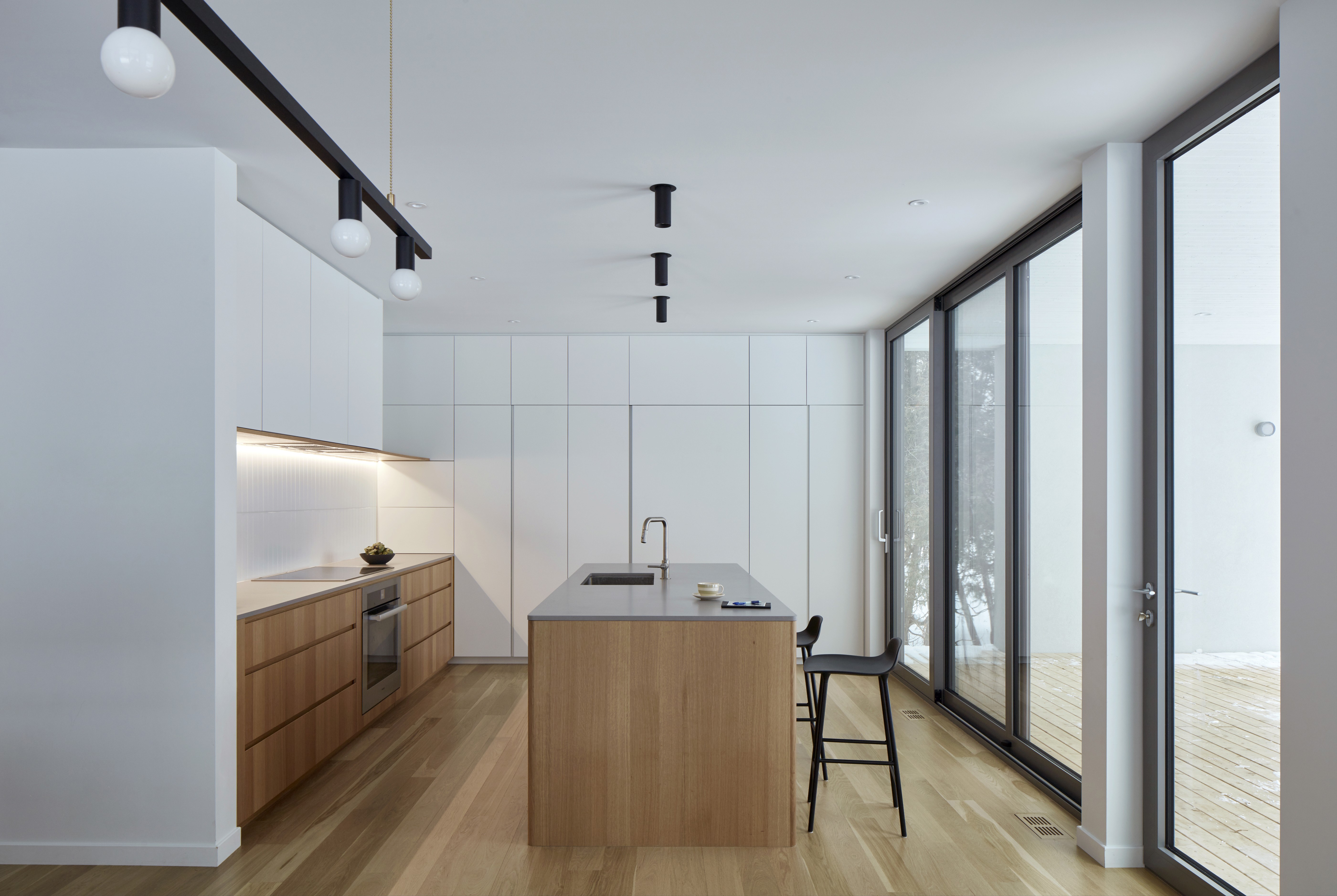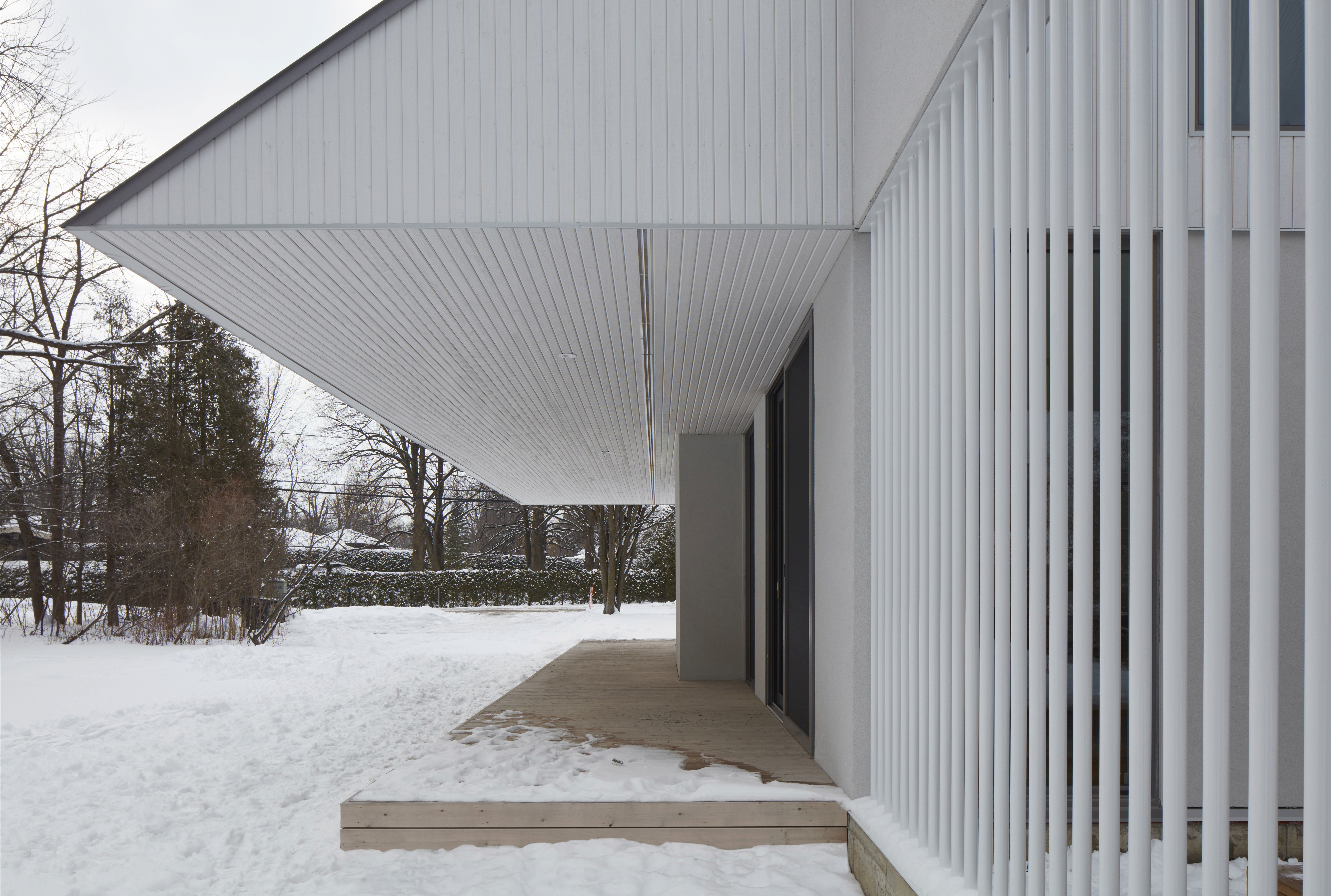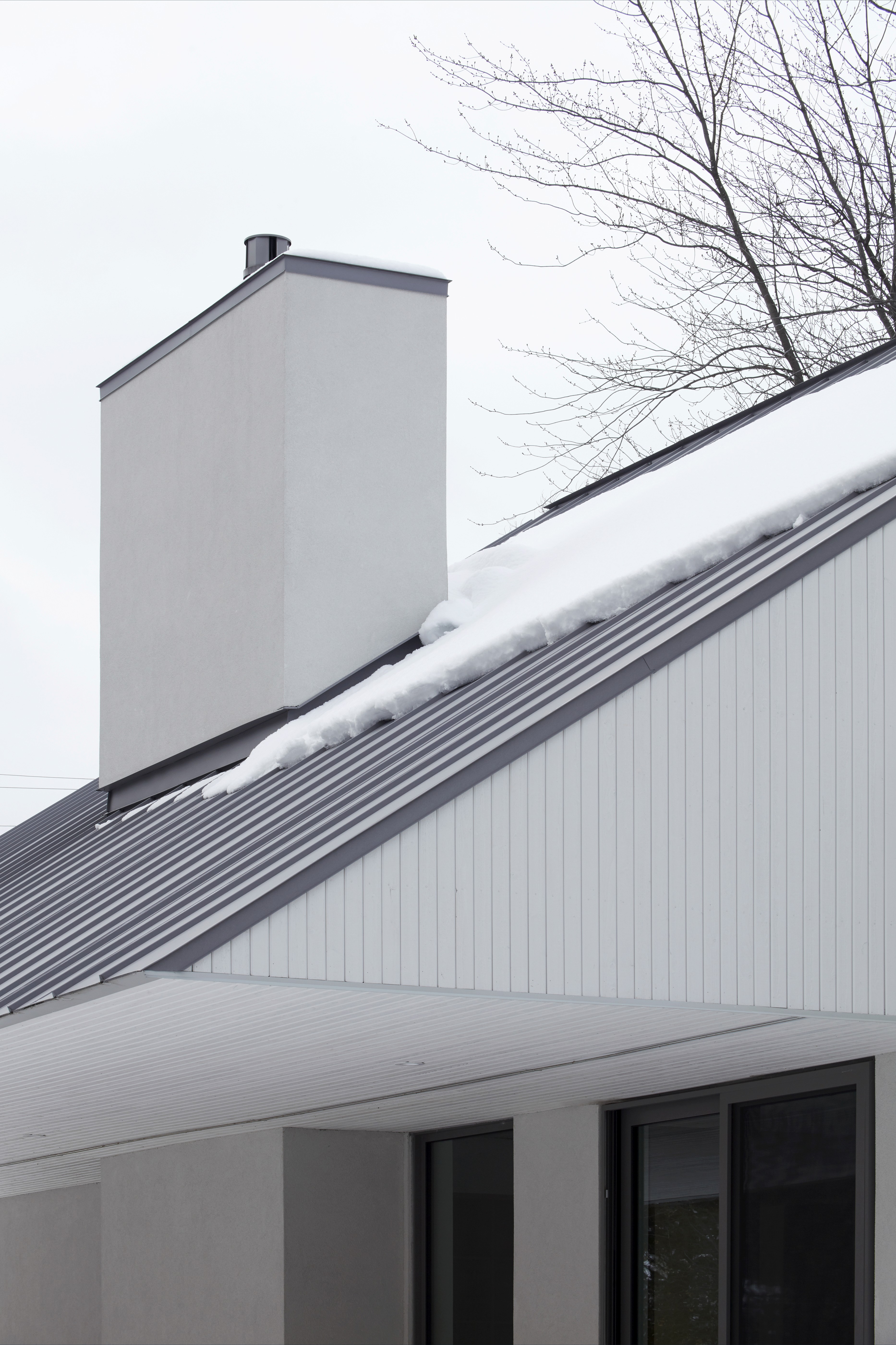 Une maison pensée comme un clin d’œil au patrimoine québécois, évoquant les formes traditionnelles de toiture pour créer une relation singulière avec son environnement.