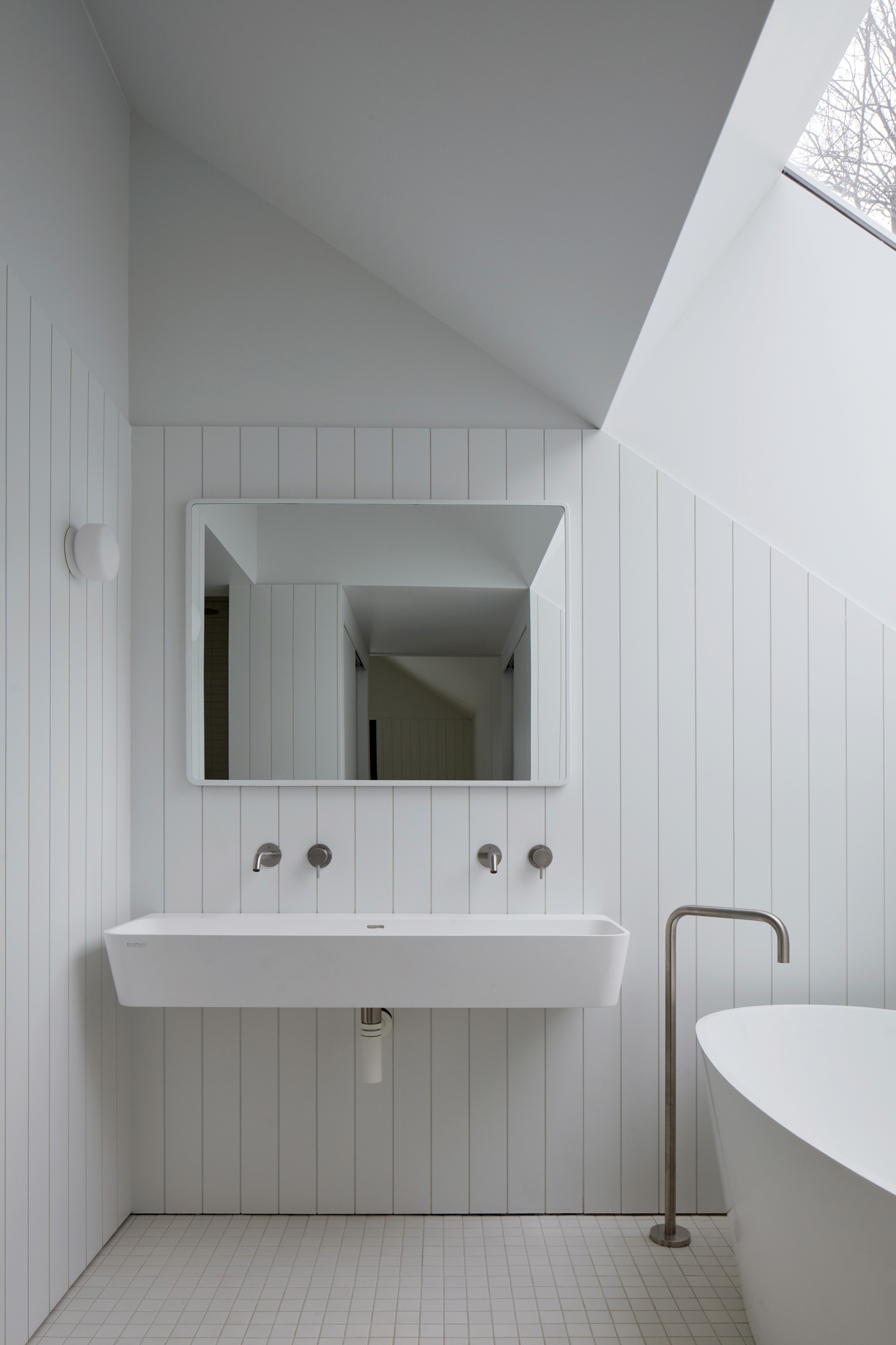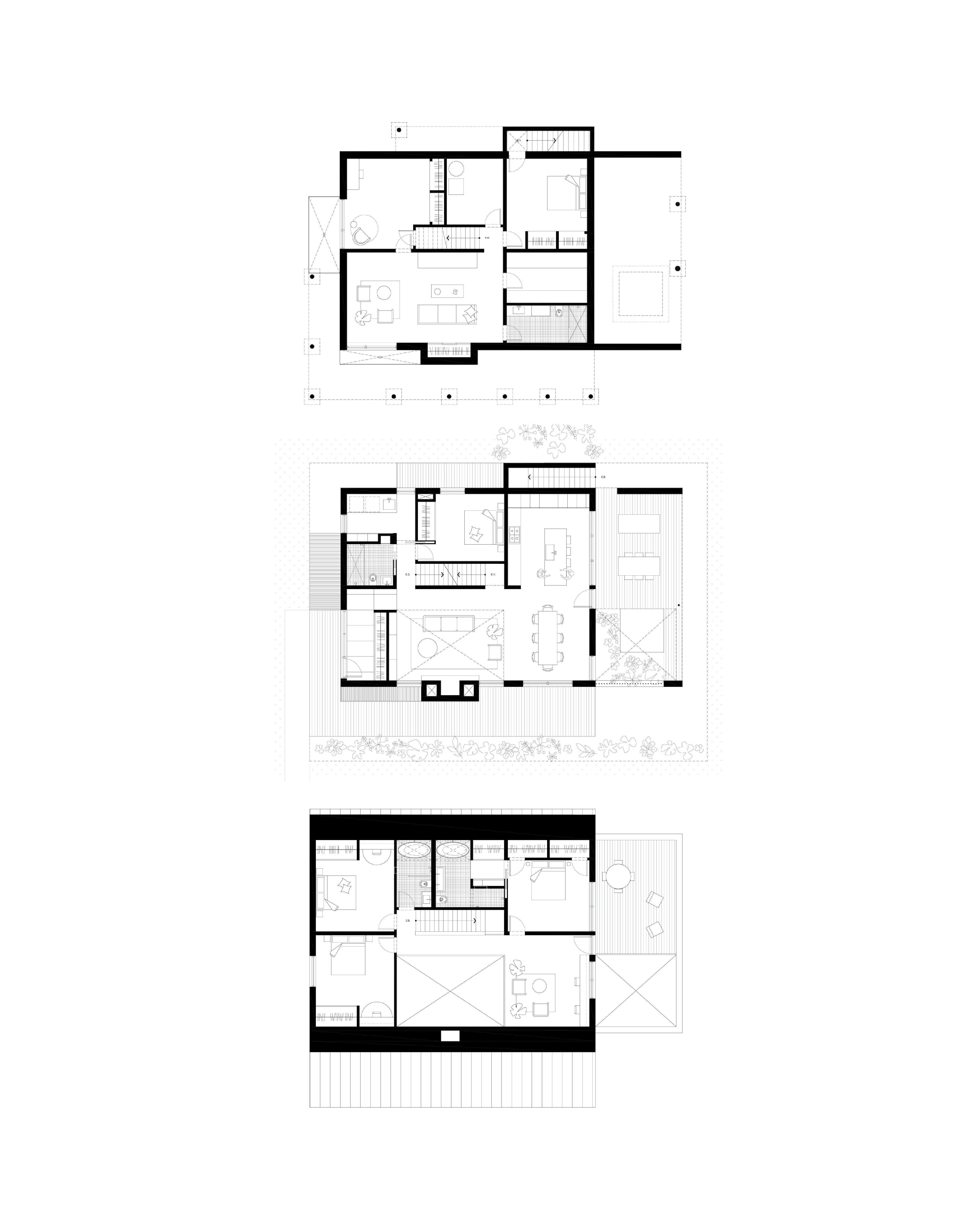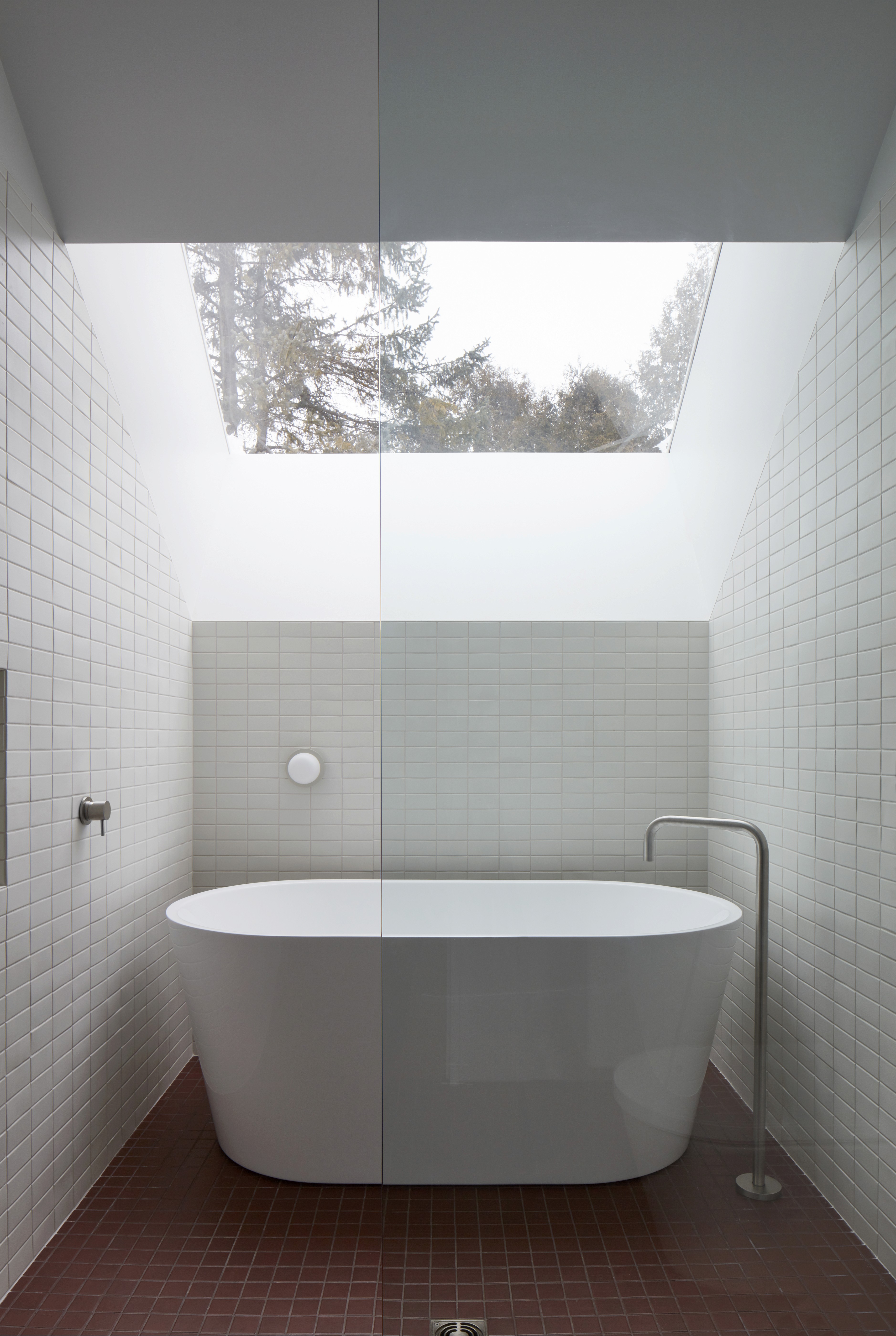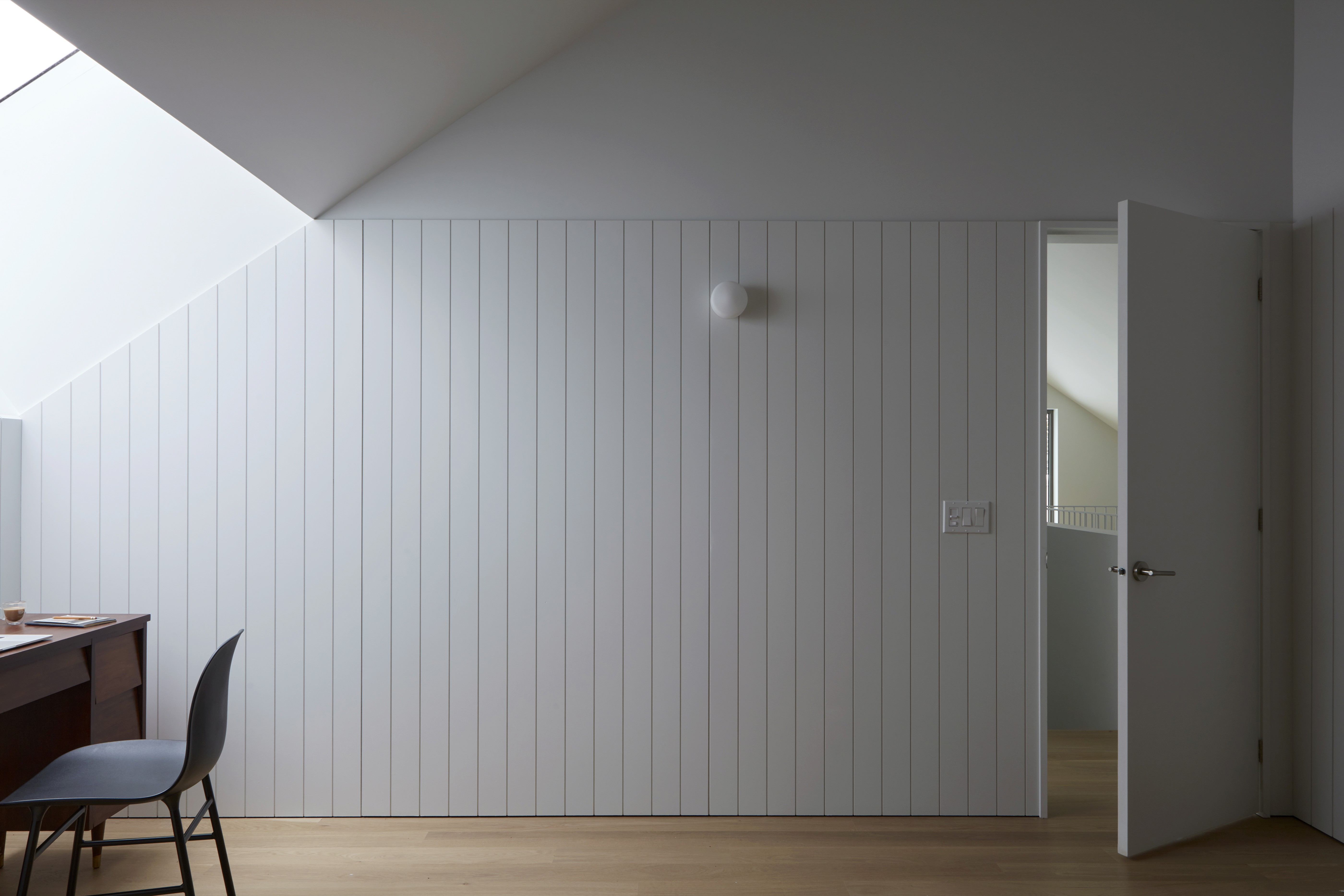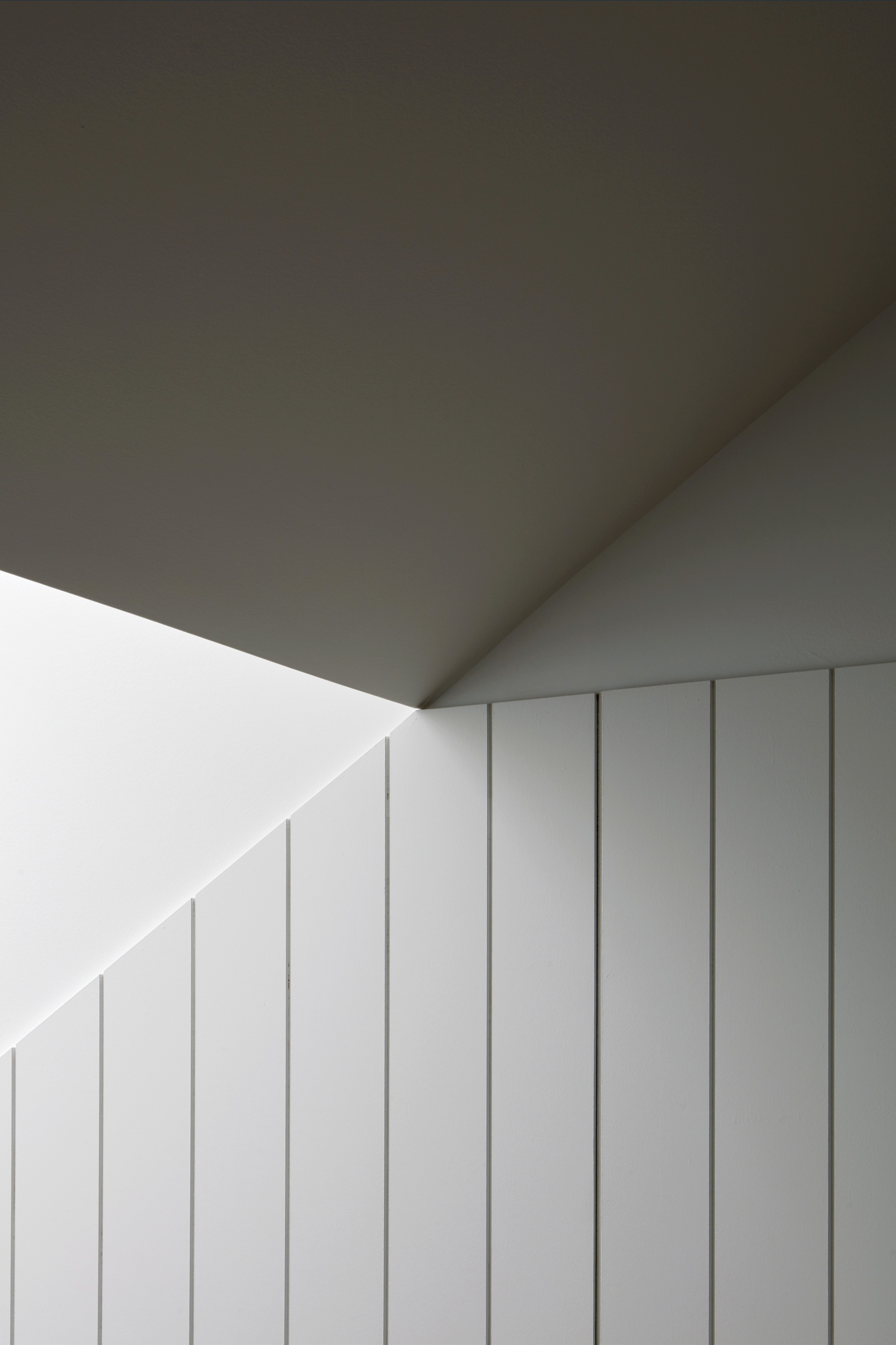 La relation avec le paysage s’incarne aussi dans le cadrage des vues par les fenêtres et les lanterneaux du deuxième niveau. Les chambres, salles de bain et salle de lecture épousent la forme de la toiture sans être écrasées, grâce au toit cathédrale. Une grande terrasse jouxte la chambre des maîtres et la salle de lecture situées à l’arrière.