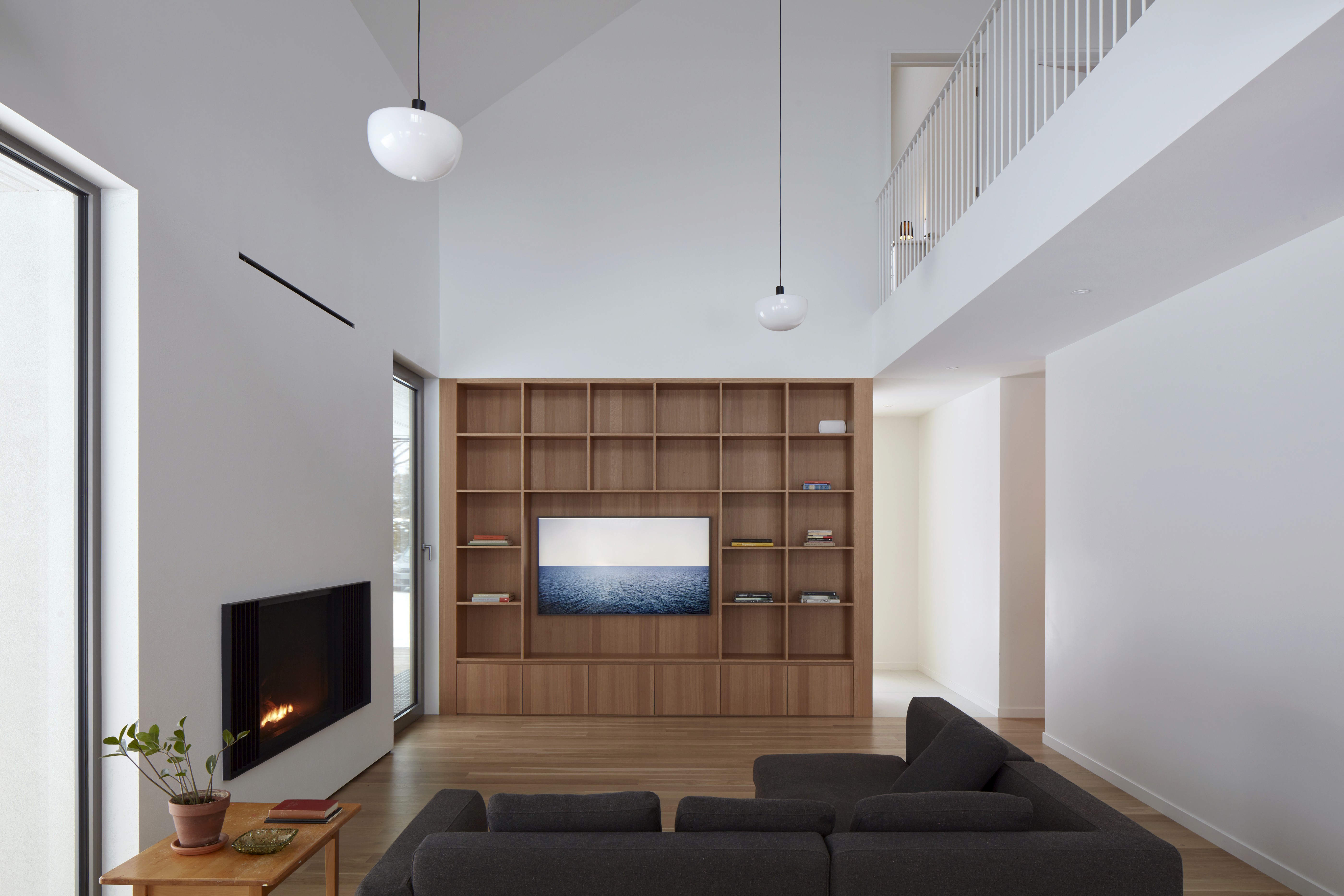 Alors que l’étage, plus intime, constitue un espèce de cocon, le rez-de-chaussée se veut plus ouvert. Les espaces de vie communiquent entre eux et vers le dehors. La cuisine et la salle à manger donnent, à l’extérieur, sur une cuisine couverte et une zone spa, accroissant le potentiel d’animation de la cour arrière. Le salon, où se trouve un large foyer, profite d’une double hauteur.