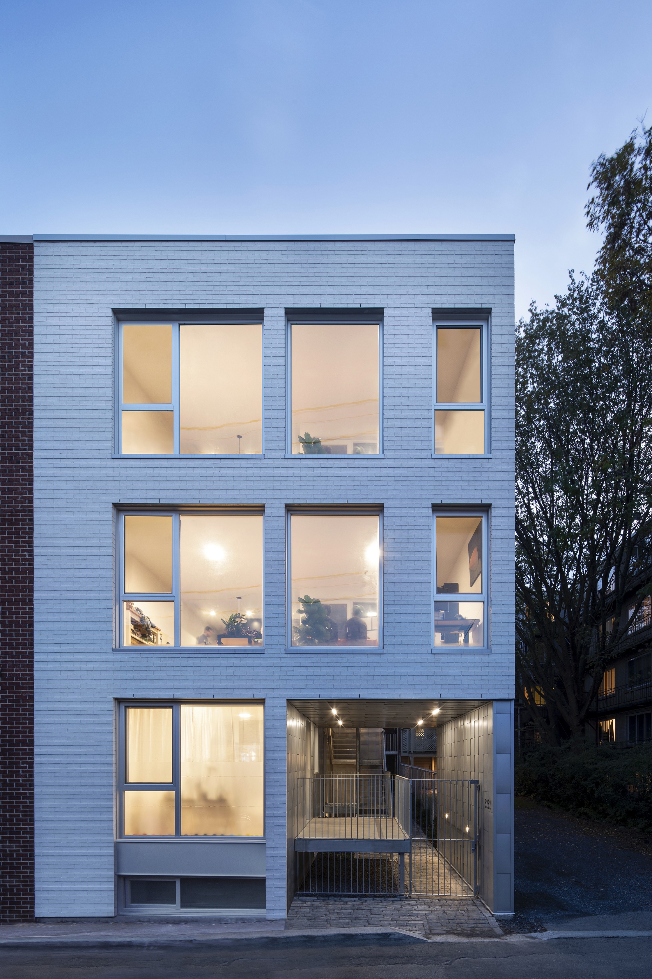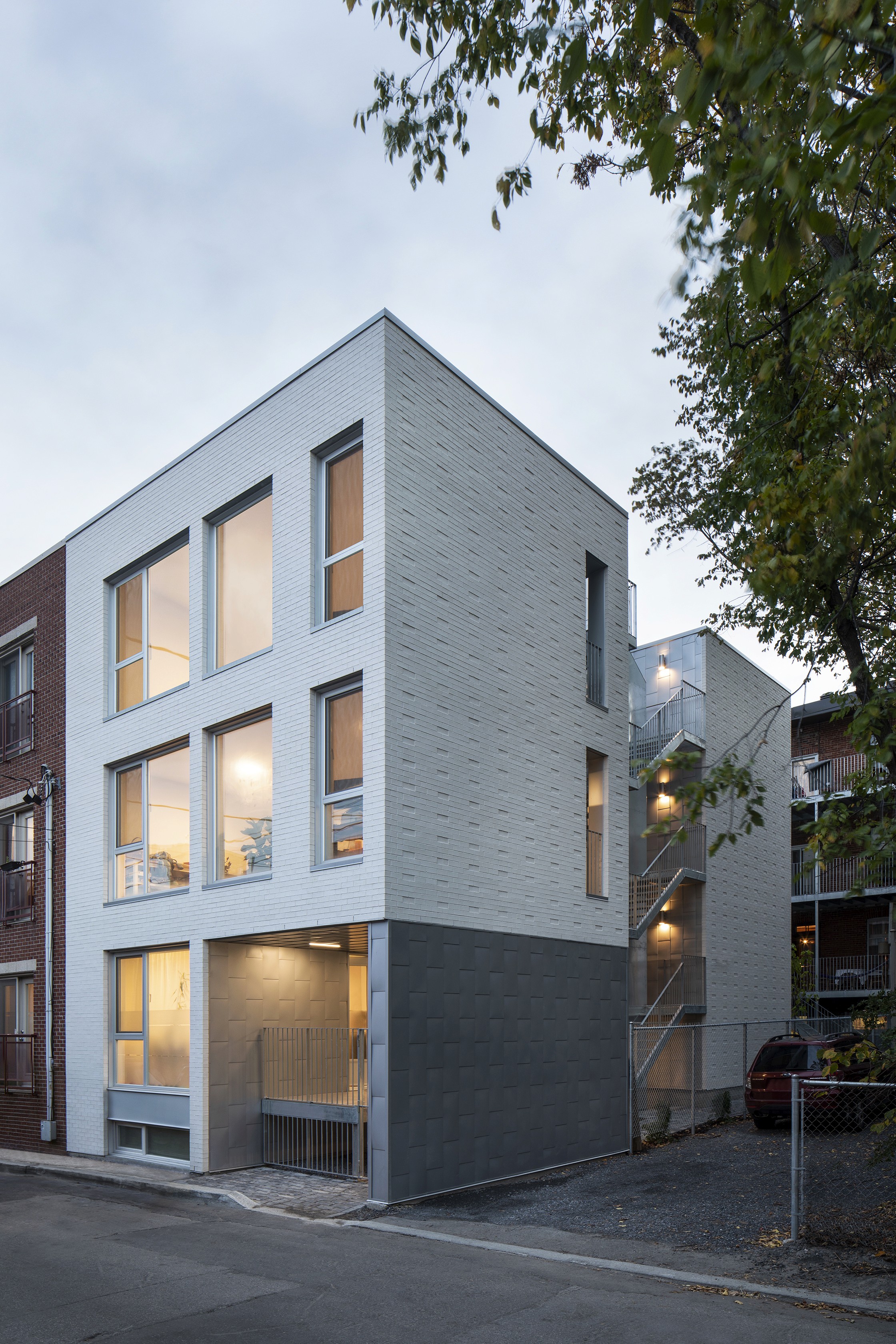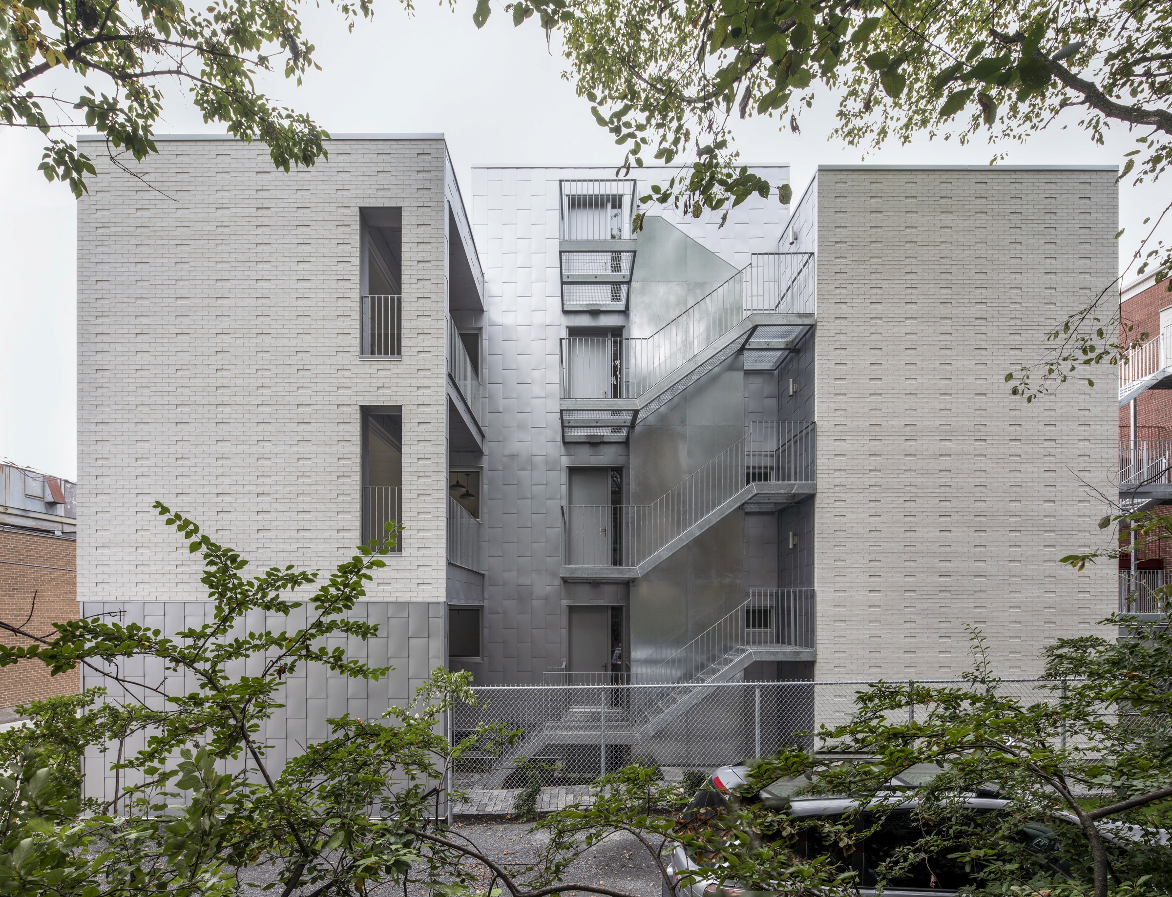 Variation inattendue sur le thème du triplex montréalais, le projet comporte deux petites unités de 2 étages, accessibles du rez-de-chaussée, un logement d’un seul niveau, au premier étage, et un quatrième logement avec mezzanine donnant sur le toit.