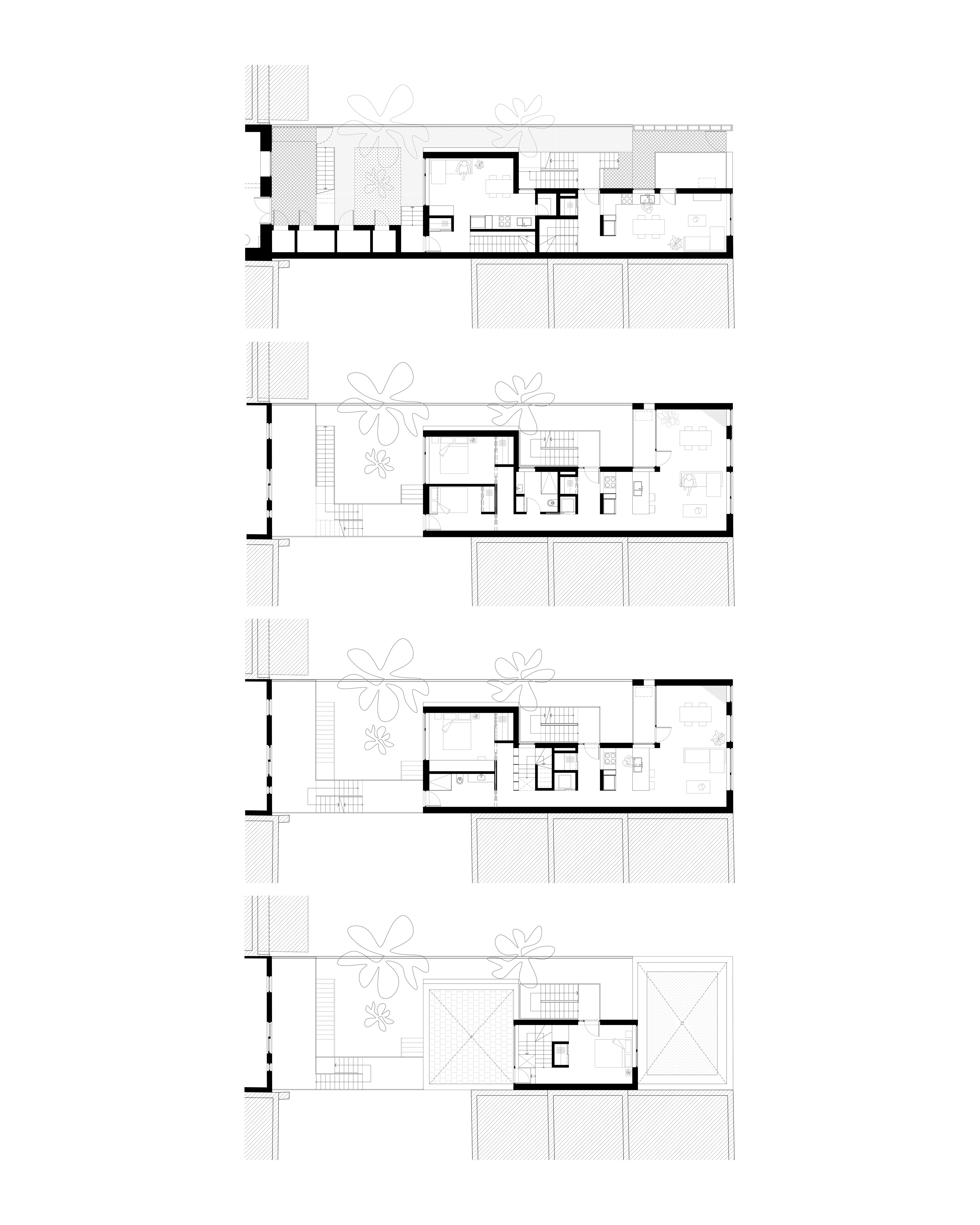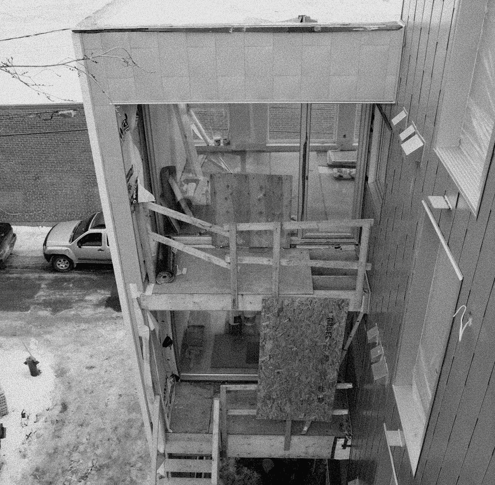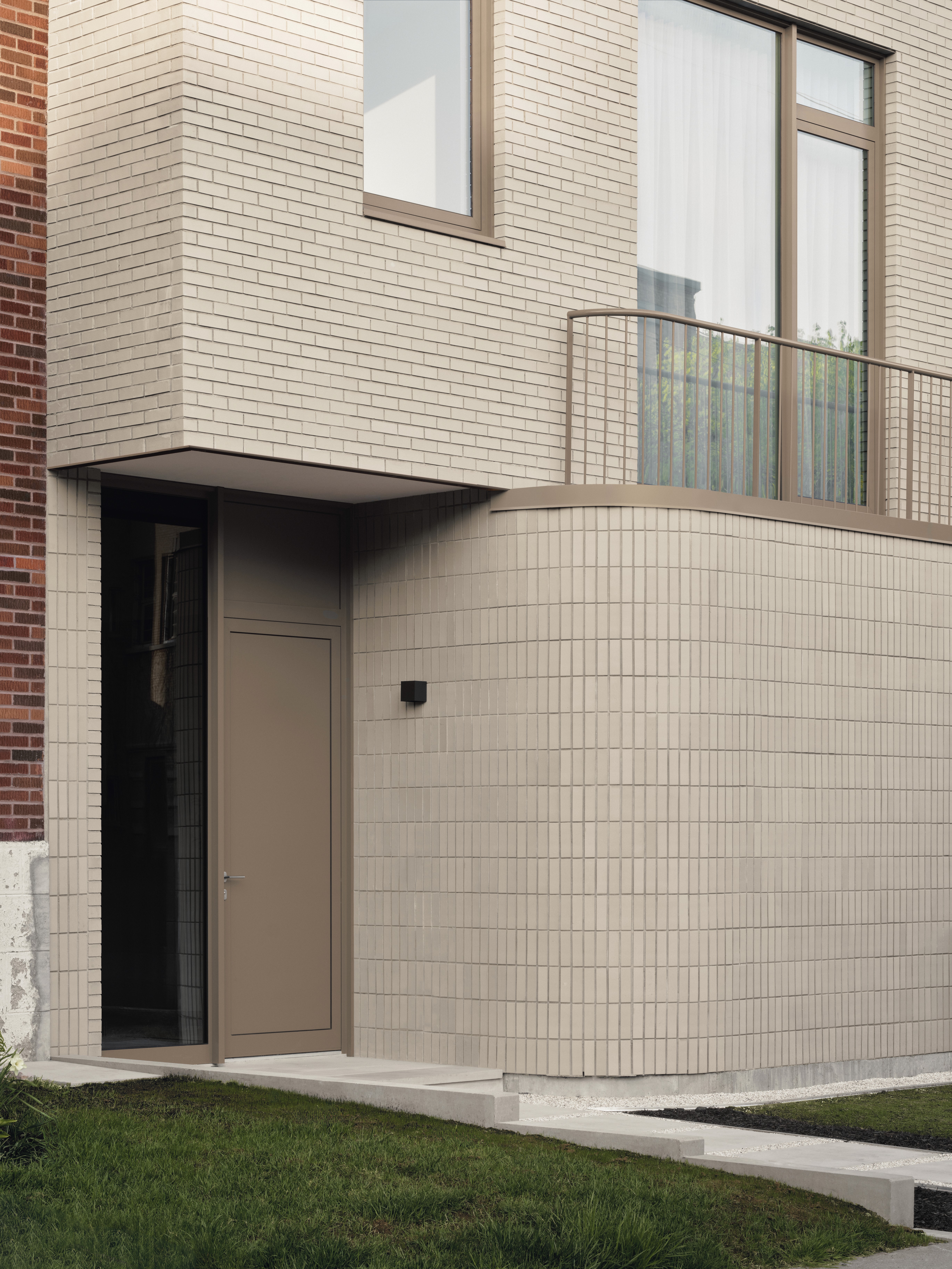 Variation inattendue sur le thème du triplex montréalais, le projet comporte deux petites unités de 2 étages, accessibles du rez-de-chaussée, un logement d’un seul niveau, au premier étage, et un quatrième logement avec mezzanine donnant sur le toit.