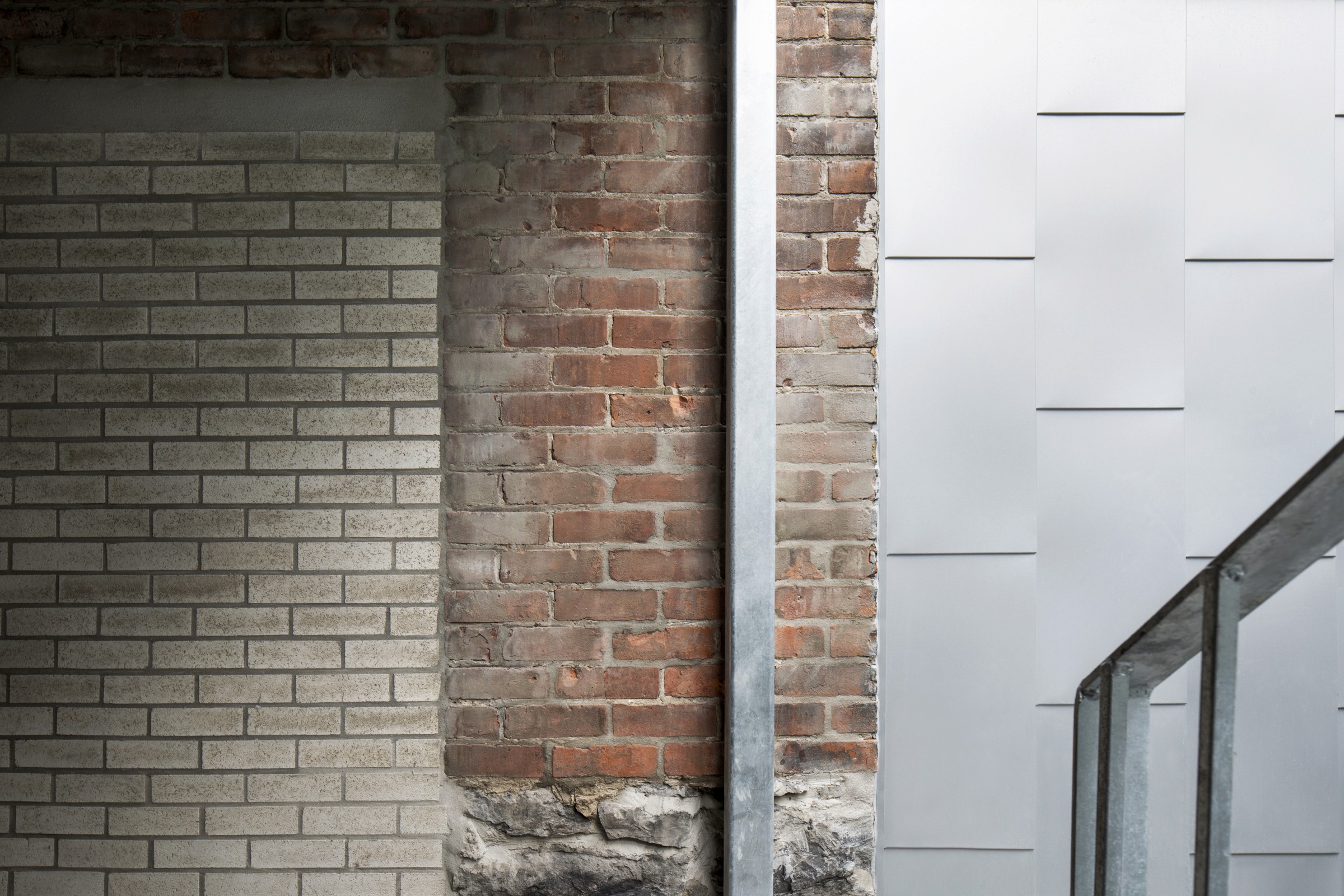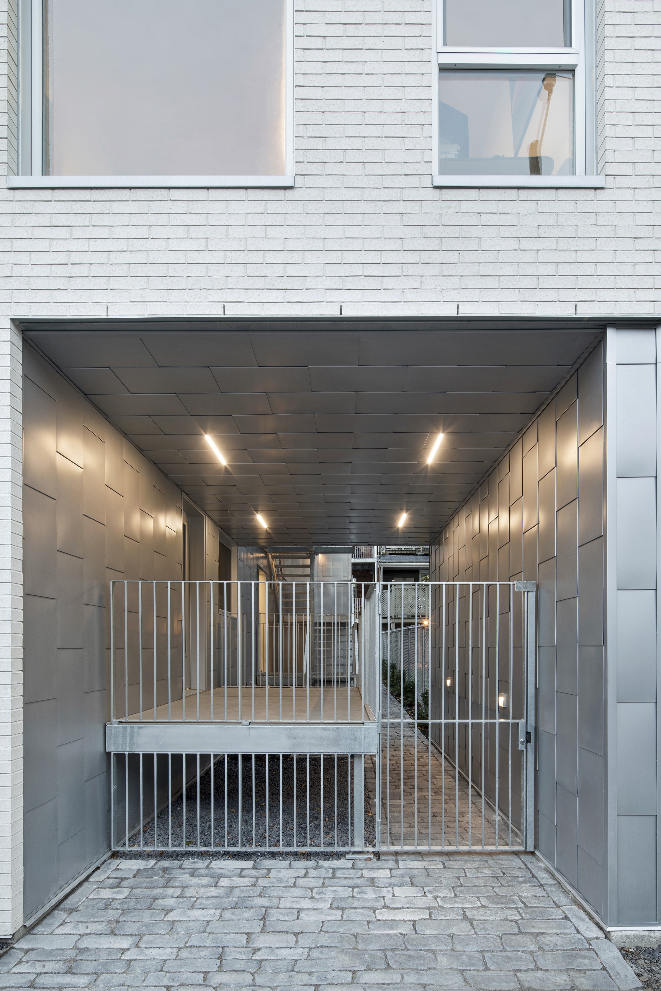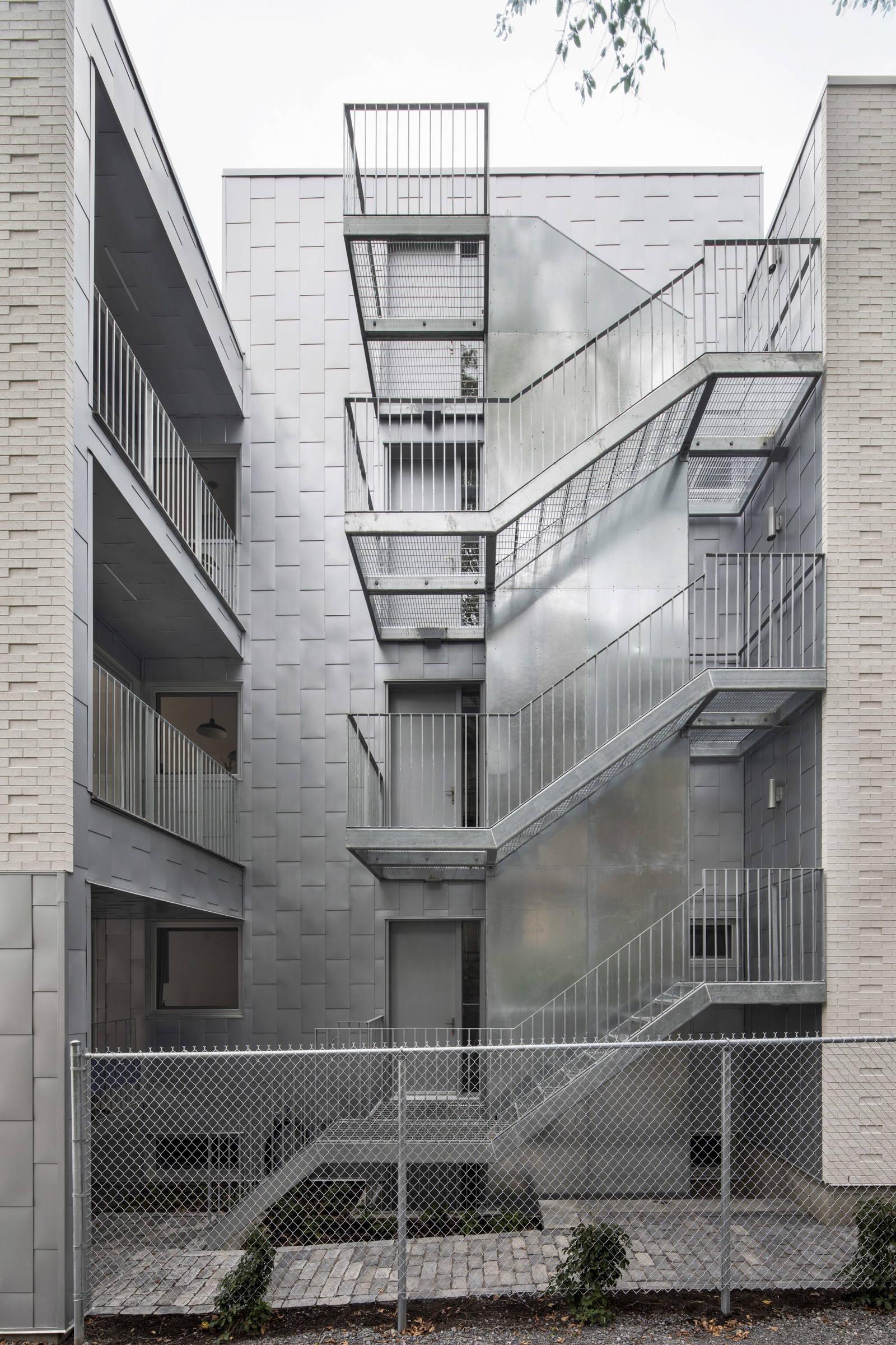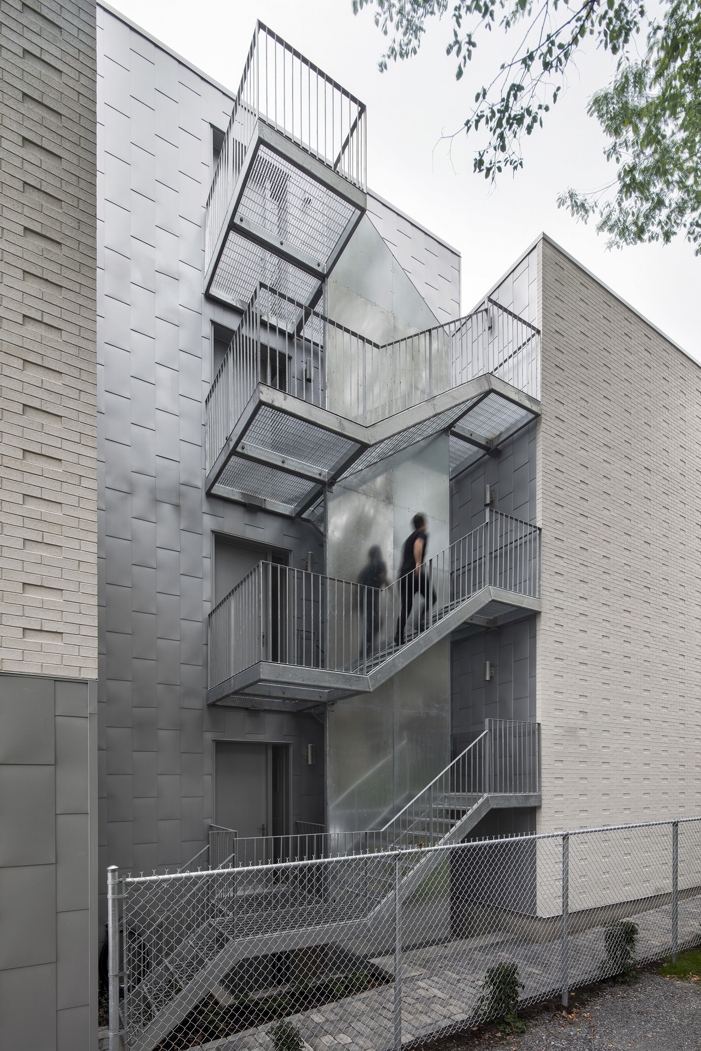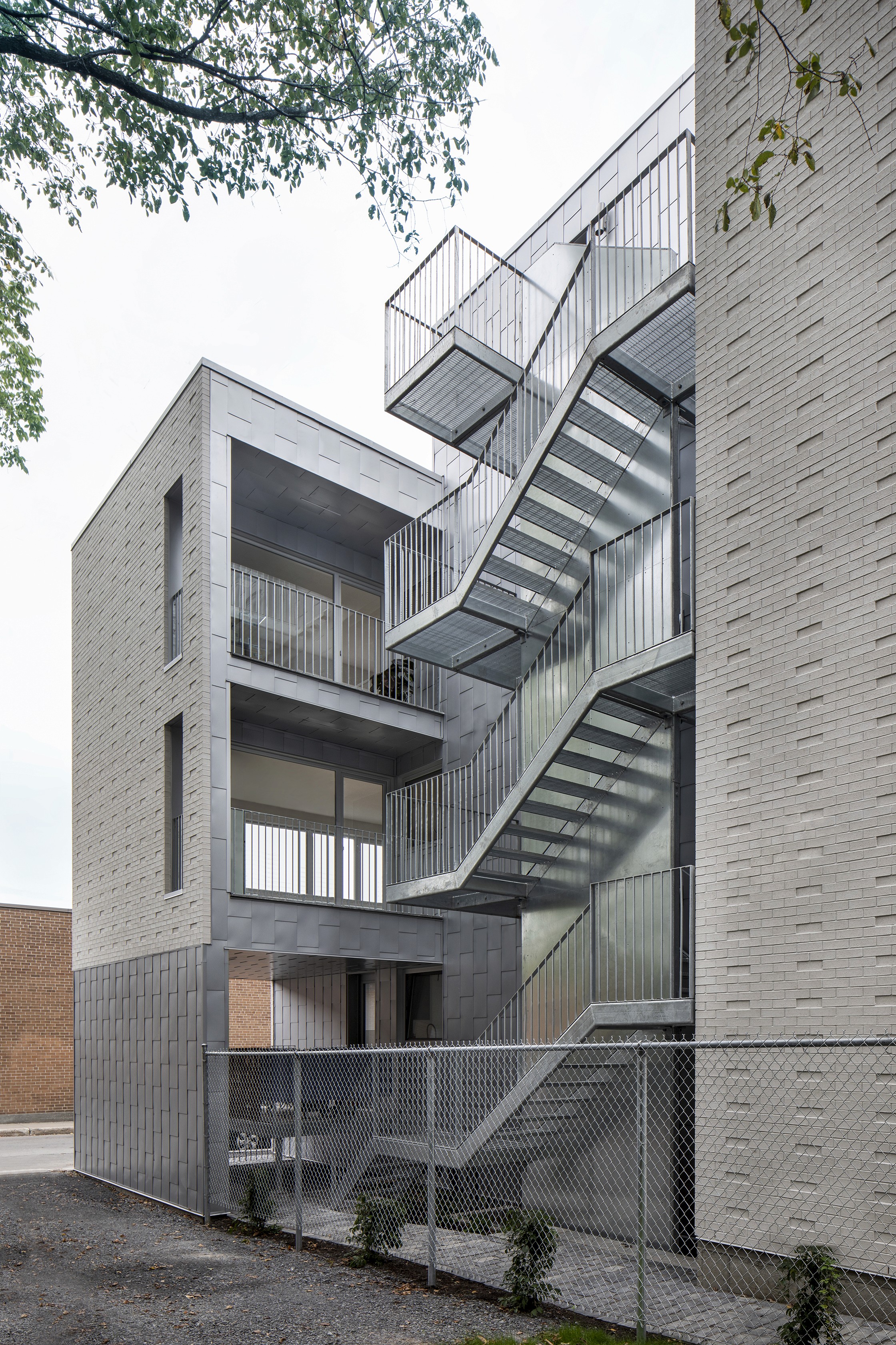 La porte cochère donne accès aux escaliers et coursives menant aux divers logements de même qu’à la cour arrière du triplex de la rue Berri. Au cœur du projet, terrasses, loggias et escaliers créent une composition ludique tout en assurant un maximum de clarté aux locataires des appartements.