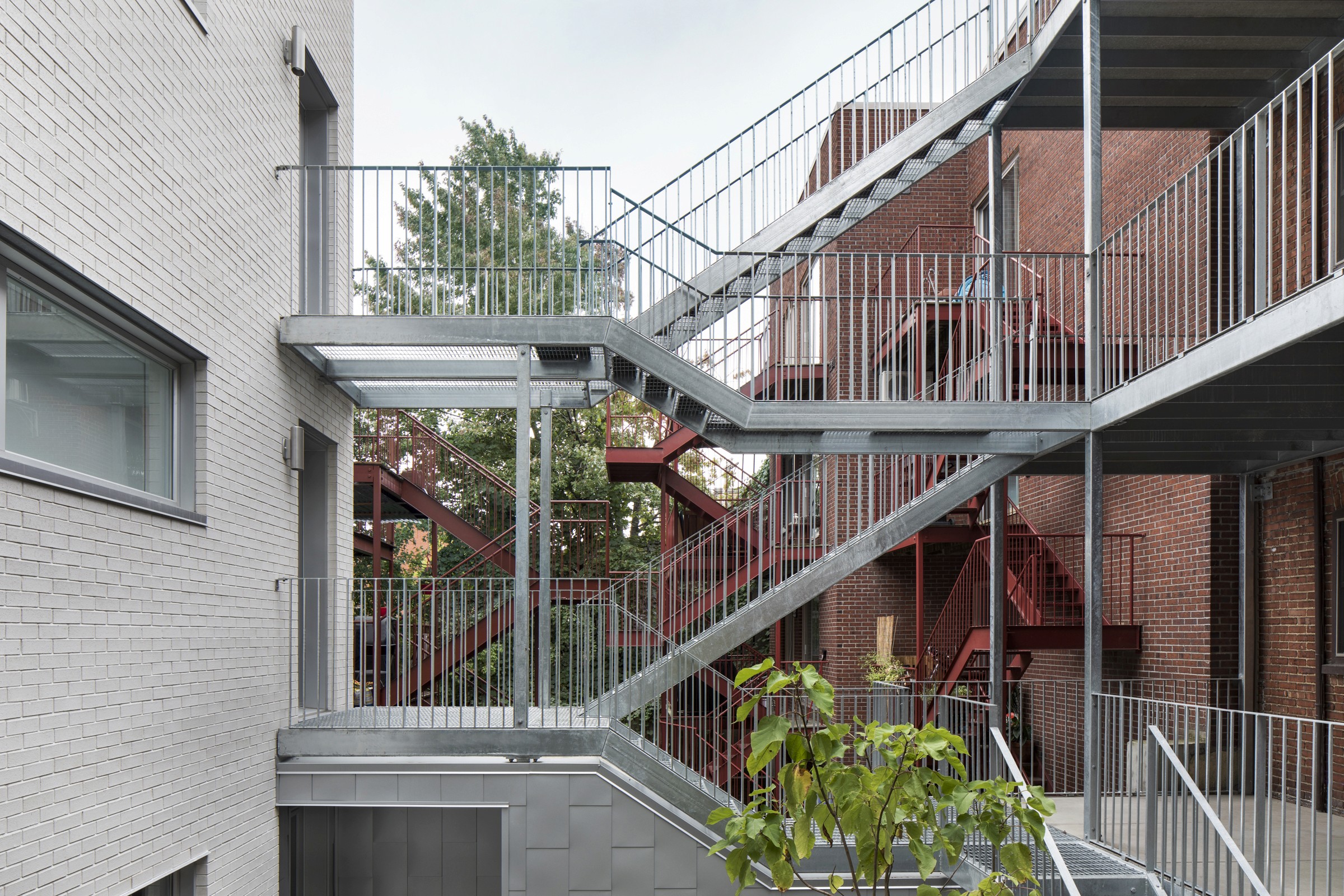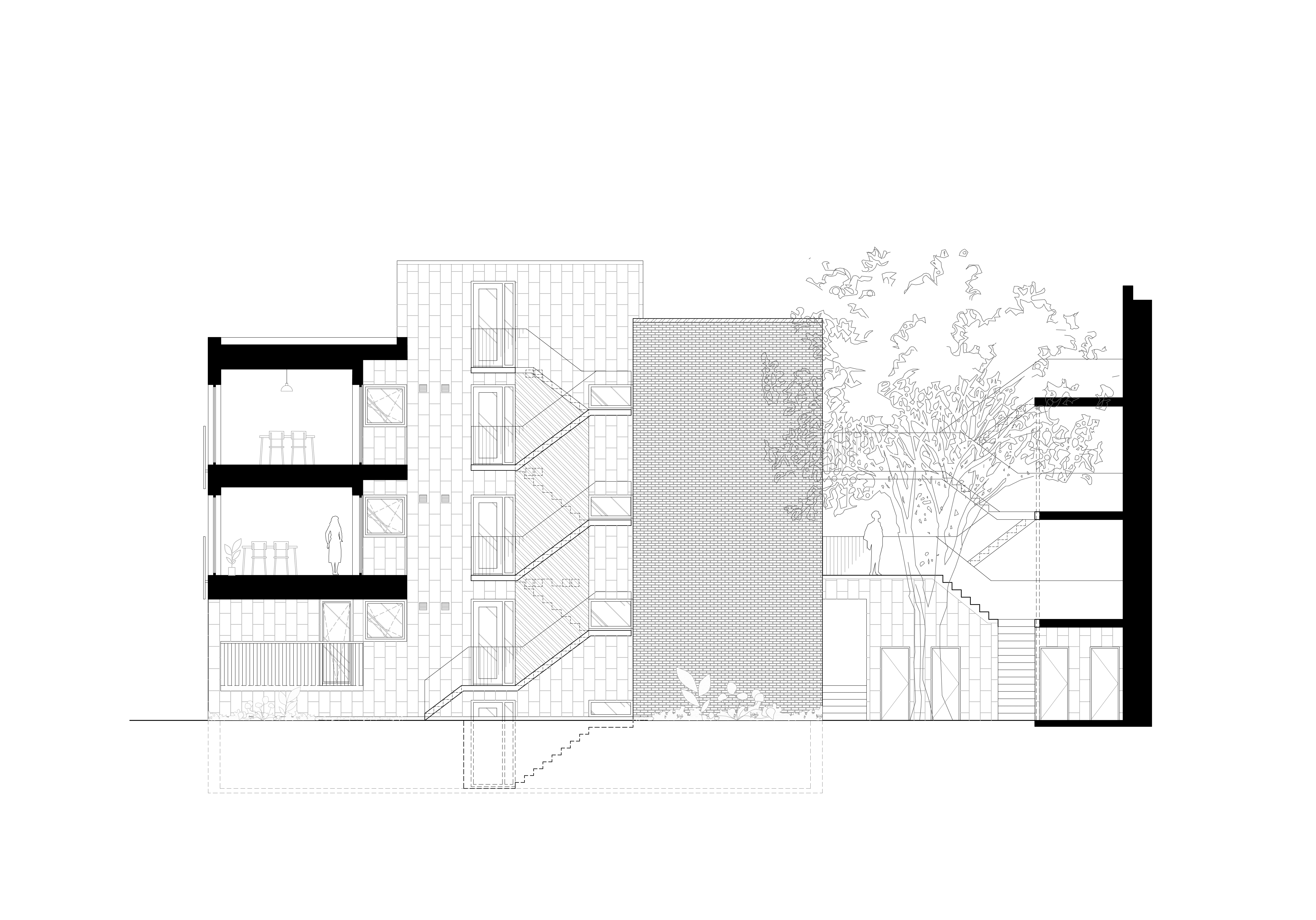 L’un des aspects les plus importants du projet a consisté à assurer la continuité d’une coulée verte existante, au cœur de cet îlot densément construit. L'intégration au contexte se suit avec la composition de la façade s’inspire de la façade voisine ainsi que des proportions et dimensions des bâtiments résidentiels adjacents.