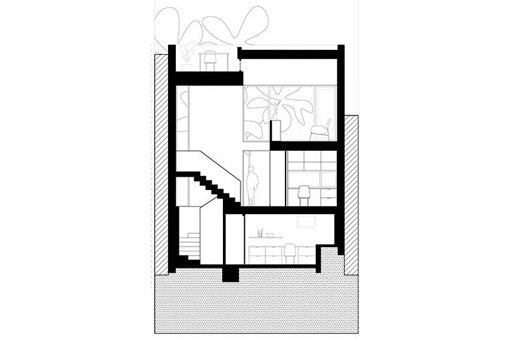 La conception de la maison joue sur la continuité spatiale entre les étages de la maison, afin de donner des impressions de grandeur et de hauteur à la maison, malgré ses dimensions modestes.