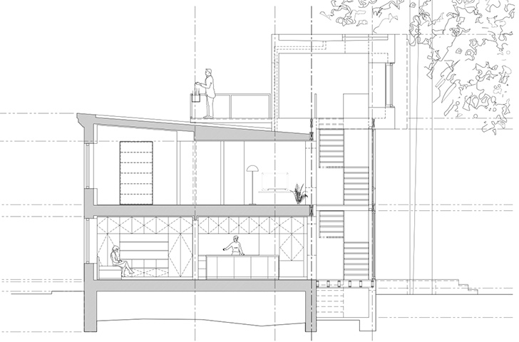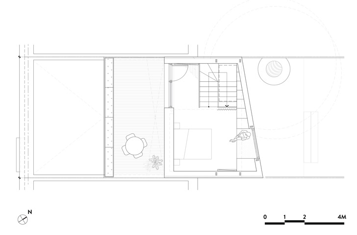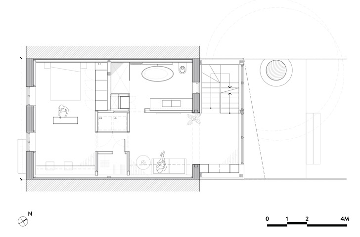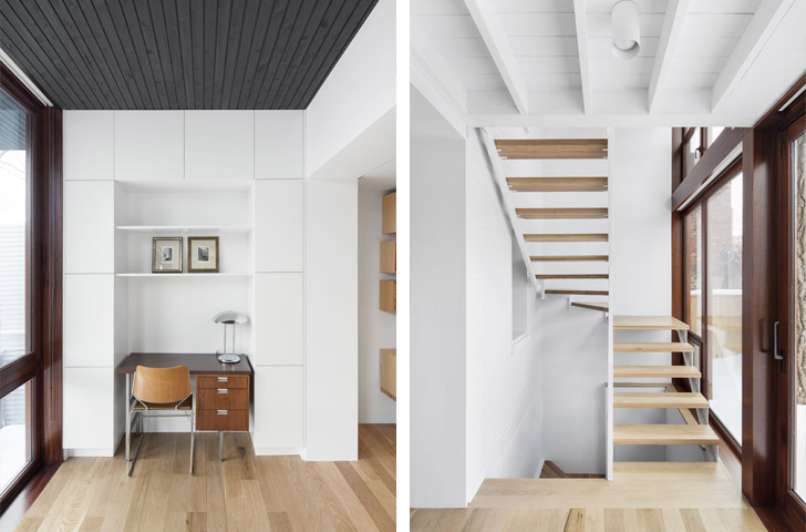 Afin de minimiser les modifications à la structure existante de la maison, cette mezzanine est suspendue en porte-à-faux tant côté cour que côté maison, flottant ainsi littéralement au-dessus des maisons existantes.