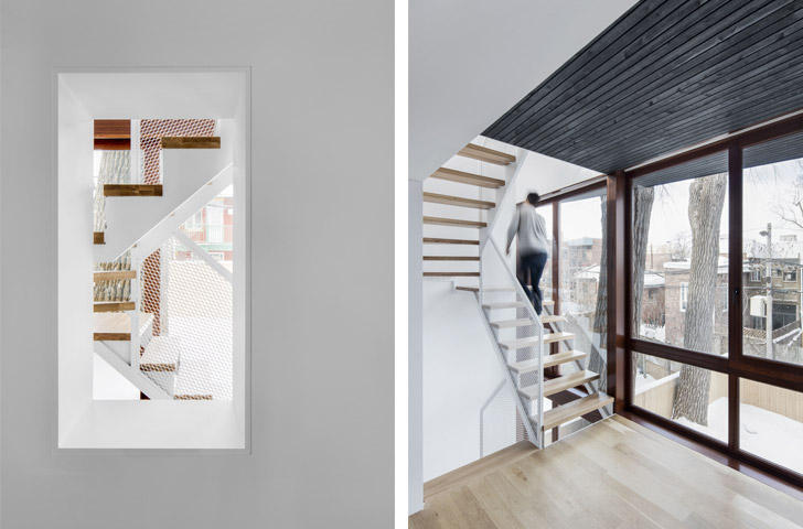 L’aménagement de cet escalier dans la nouvelle construction permet le décloisonnement et la réorganisation complète des espaces intérieurs de la maison d’origine, en plus d’offrir une déambulation verticale en relation directe avec le grand arbre. Deux salons d’hiver, situés près des nouvelles fenêtres en bois de l’agrandissement, viennent offrir un espace de lecture confortable à proximité de la cour.