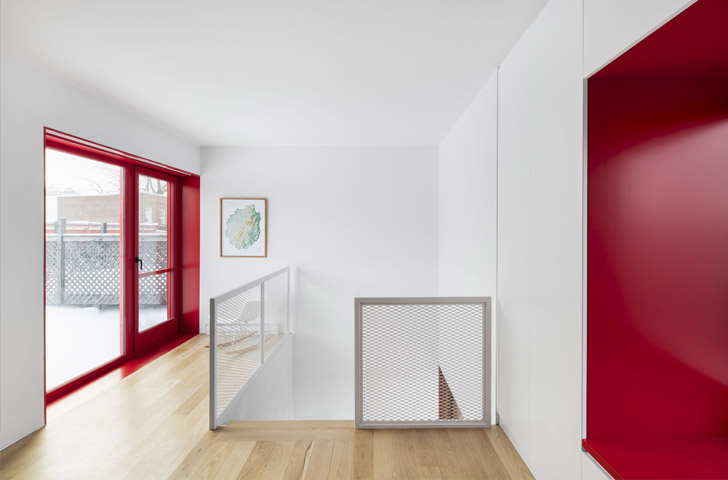 La mezzanine, perchée au sommet du nouveau volume, accueille la chambre des maîtres ainsi qu’un accès à une nouvelle terrasse sur le toit.