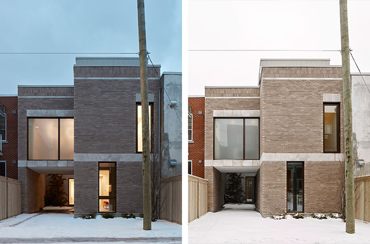 L’extérieur est contemporain, tout en rappelant des éléments plus traditionnels du patrimoine bâti montréalais. Sur la rue, la résidence s’intègre harmonieusement dans le voisinage, principalement composé de plex construits quelques cent années plus tôt. Les tons pâles de beige et de gris, sans grands contrastes, donnent une impression de douceur.