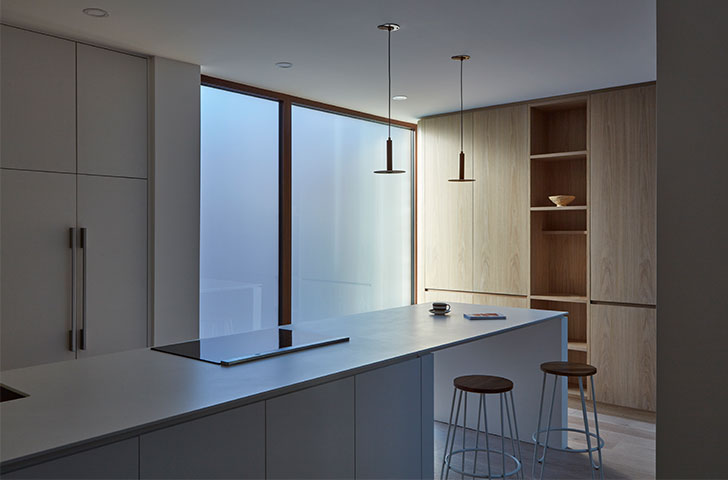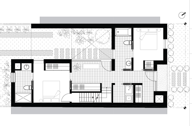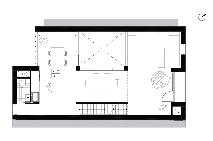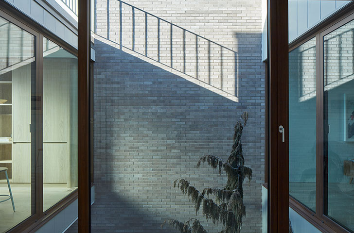 Pour offrir une plus grande intimité aux résidents malgré la densité du quartier, et un espace extérieur malgré la taille réduite du terrain, deux concepts ont été développés : revoir la composition « classique » des espaces de vie (salon, cuisine, salle à manger) pour les situer à l’étage, et percer une cour intérieure qui traverse les étages au centre de la résidence.