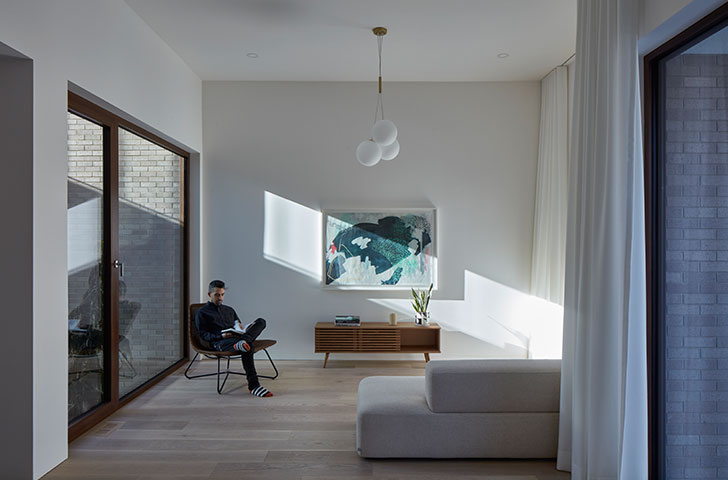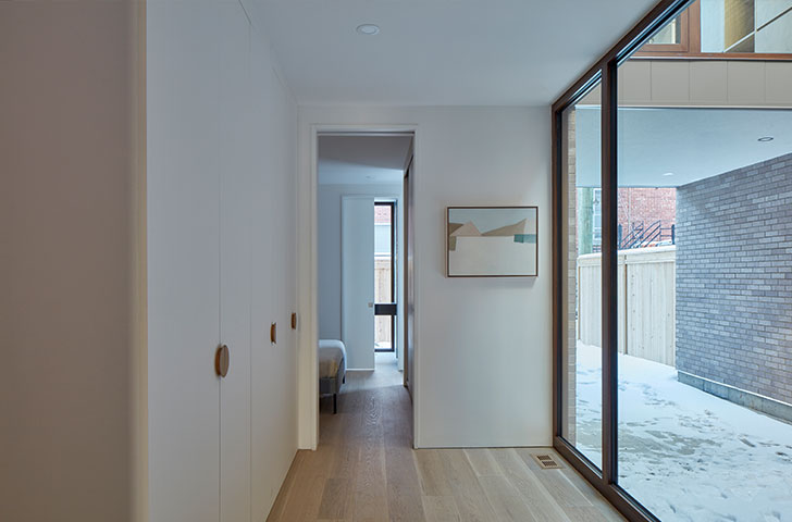 Ce sont les particularités du contexte de ce projet qui ont poussé les architectes de Microclimat à réfléchir autrement la composition des pièces et des espaces extérieurs de cette maison unifamiliale à deux étages, afin de maximiser l’intimité des résidents ayant choisi de s’établir au coeur d’un milieu très dense.