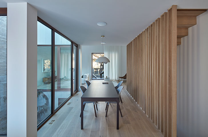 Aménager le salon, la cuisine et la salle à manger à l’étage fait en sorte, d’une part, de donner plus de luminosité aux espaces de vie tout en créant une distance entre la rue et ces espaces occupés pendant la journée. Le choix de situer les espaces de vie en hauteur permet ainsi d’intégrer de très grandes fenêtres à l’étage, sans que les habitants aient l’impression de s’exposer à la rue et qu’ils ressentent le besoin de se refermer derrière des rideaux.