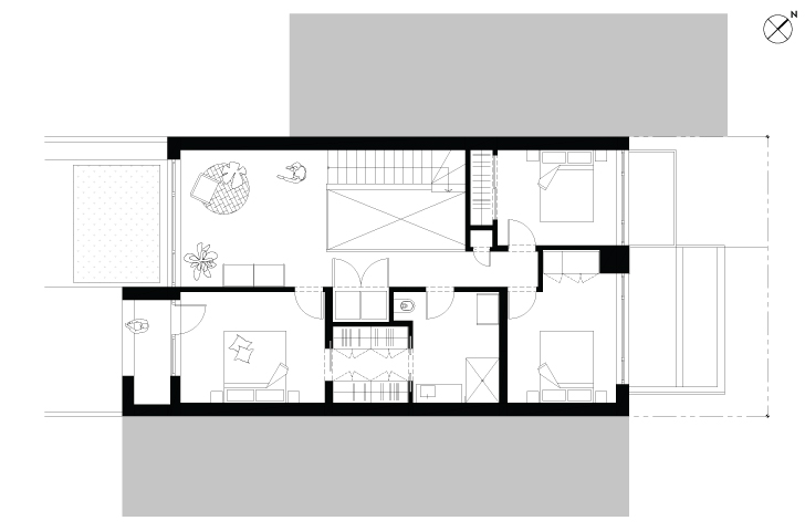 À l’étage, trois chambres s’organisent autour d'une grande aire de jeu. La chambre des maîtres communique avec la cour arrière grâce à une vaste ouverture, une interprétation simplifié de la loggia ; le dedans et le dehors s’entremêlent. Un lieu pour contempler les toits du quartier, saluer un voisin ou inviter les enfants turbulents à rentrer.