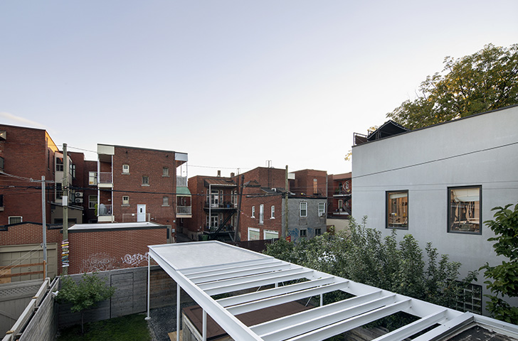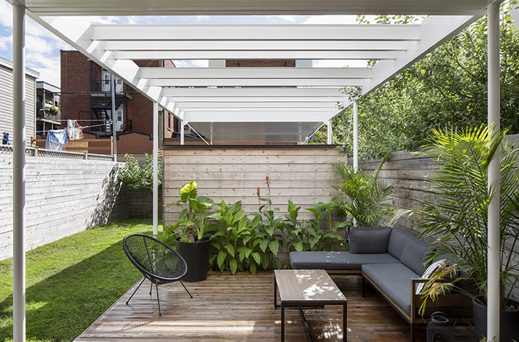 Du côté de la ruelle, la cour arrière est divisée en deux espaces contrastants. D’une part, il y a un lieu dégagé et végétalisé, l’endroit idéal pour se prélasser au soleil ou courir après un ballon. De l’autre, une immense pergola se déploie du bâtiment principal jusqu’au commencement de la ruelle.