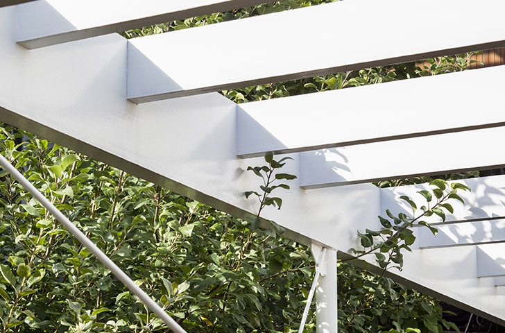 Une canopée artificielle qui propose différentes intensités d’ouverture, pour laisser passer la lumière comme les feuillages, et de fermeture, pour protéger l’ombre et l’intimité côté cour.