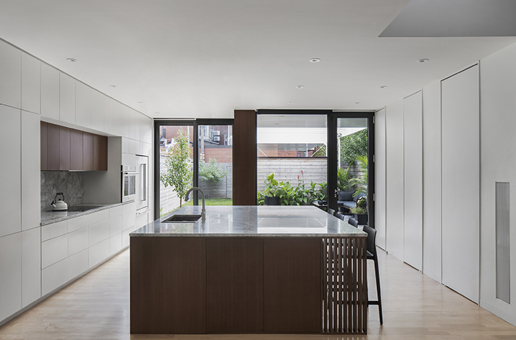 Le projet Saint-Vallier emprunte donc l’implantation et la volumétrie du bâtiment qui l’a précédé. La façade avant s’insère en harmonie avec son voisin au sud et en retrait de son voisin au nord, permettant de préserver la petite cour avant caractéristique de La Petite-Patrie. Ce dégagement accueille un grand saut-de-loup, qui illumine le logement du sous-sol tout en laissant suffisamment d’espace pour y aménager un jardin d’arbustes et d’herbacées.